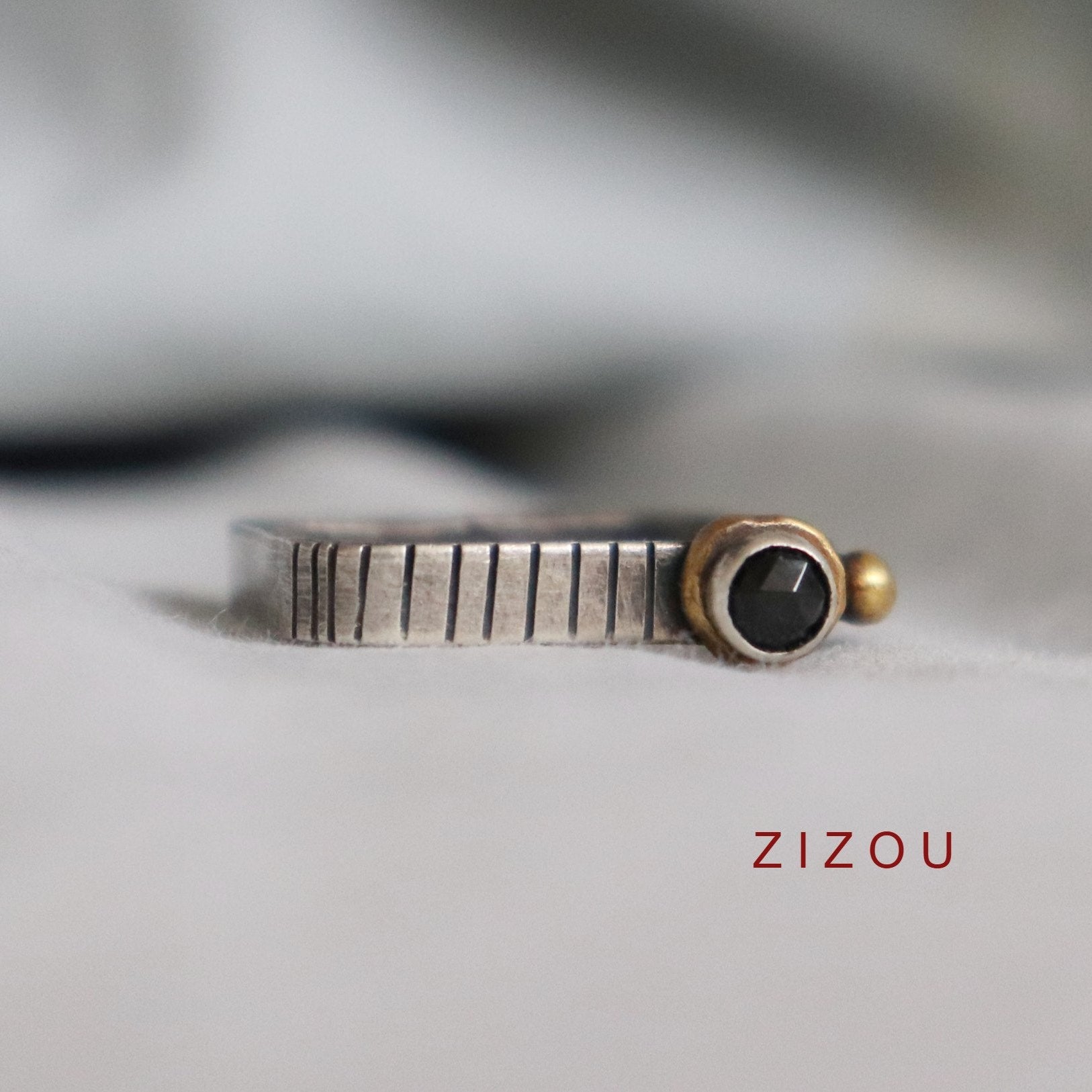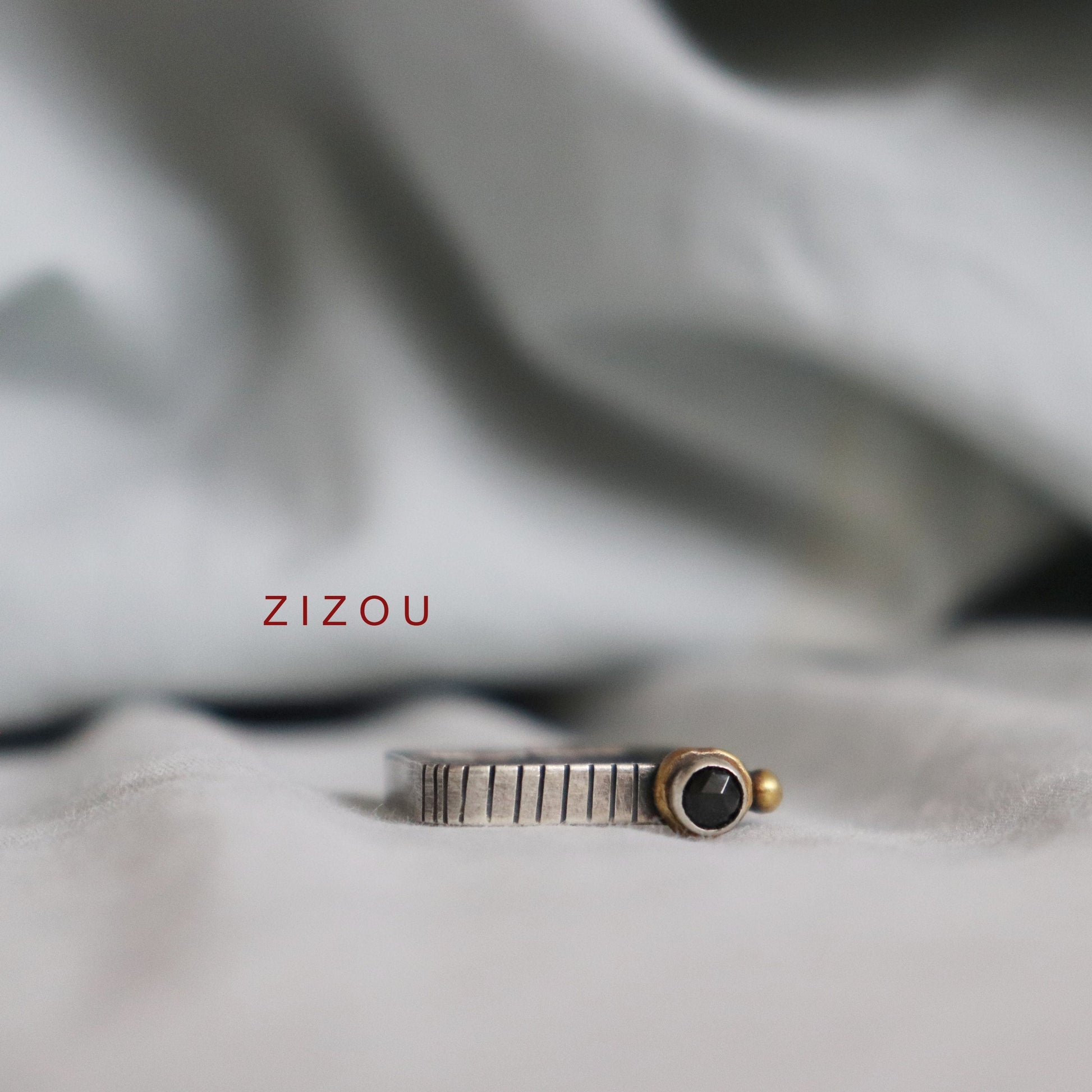U središtu prstena nalazi se crni spinel (4mm) boje, pažljivo pneprozirne crne bojeostavljen u mjeden (zlatno-mesingani) obrub koji naglašava toplinu kamena i stvara elegantan kontrast hladnom sjaju srebra. Mali mjedenasti detalj dodatno balansira dizajn i daje prstenu prepoznatljiv Zizou potpis.