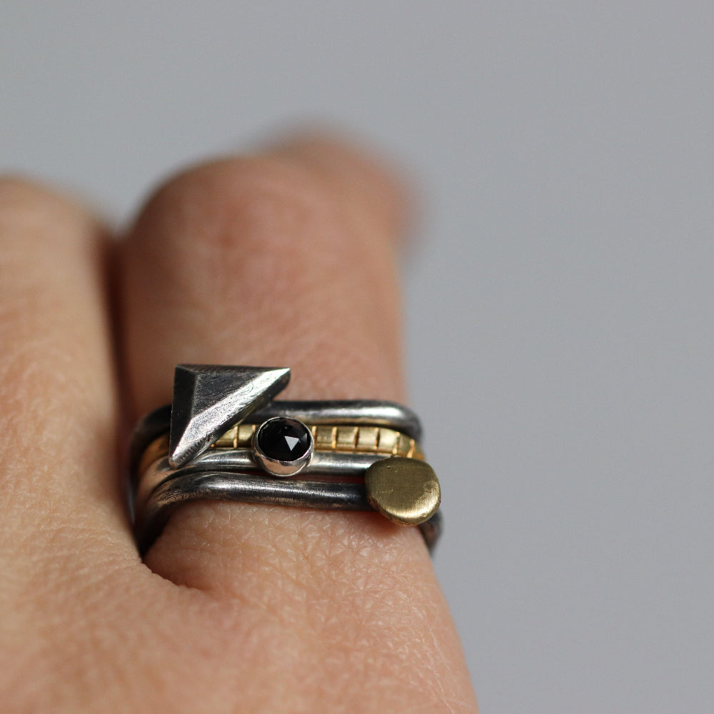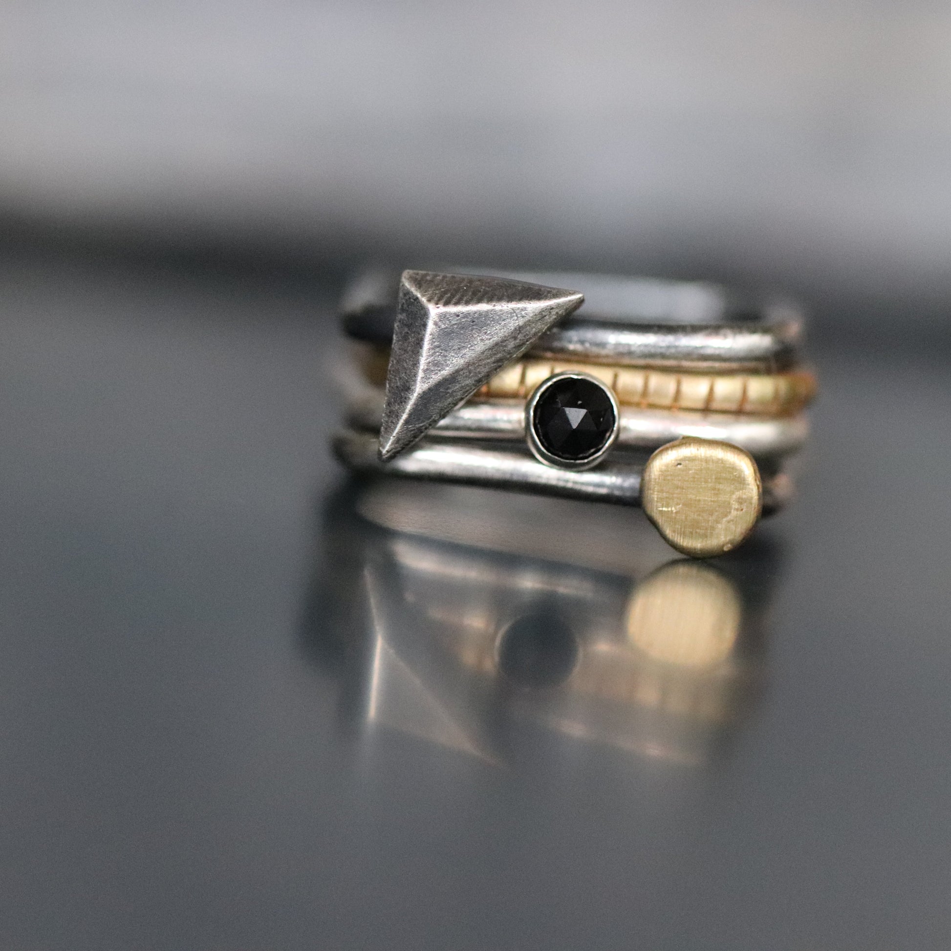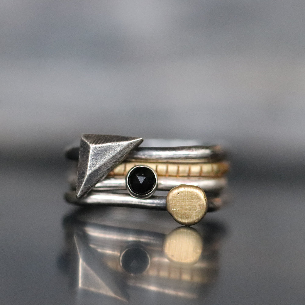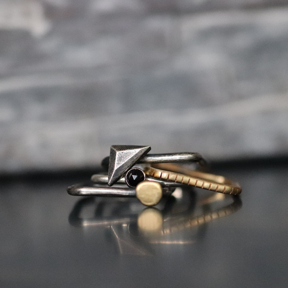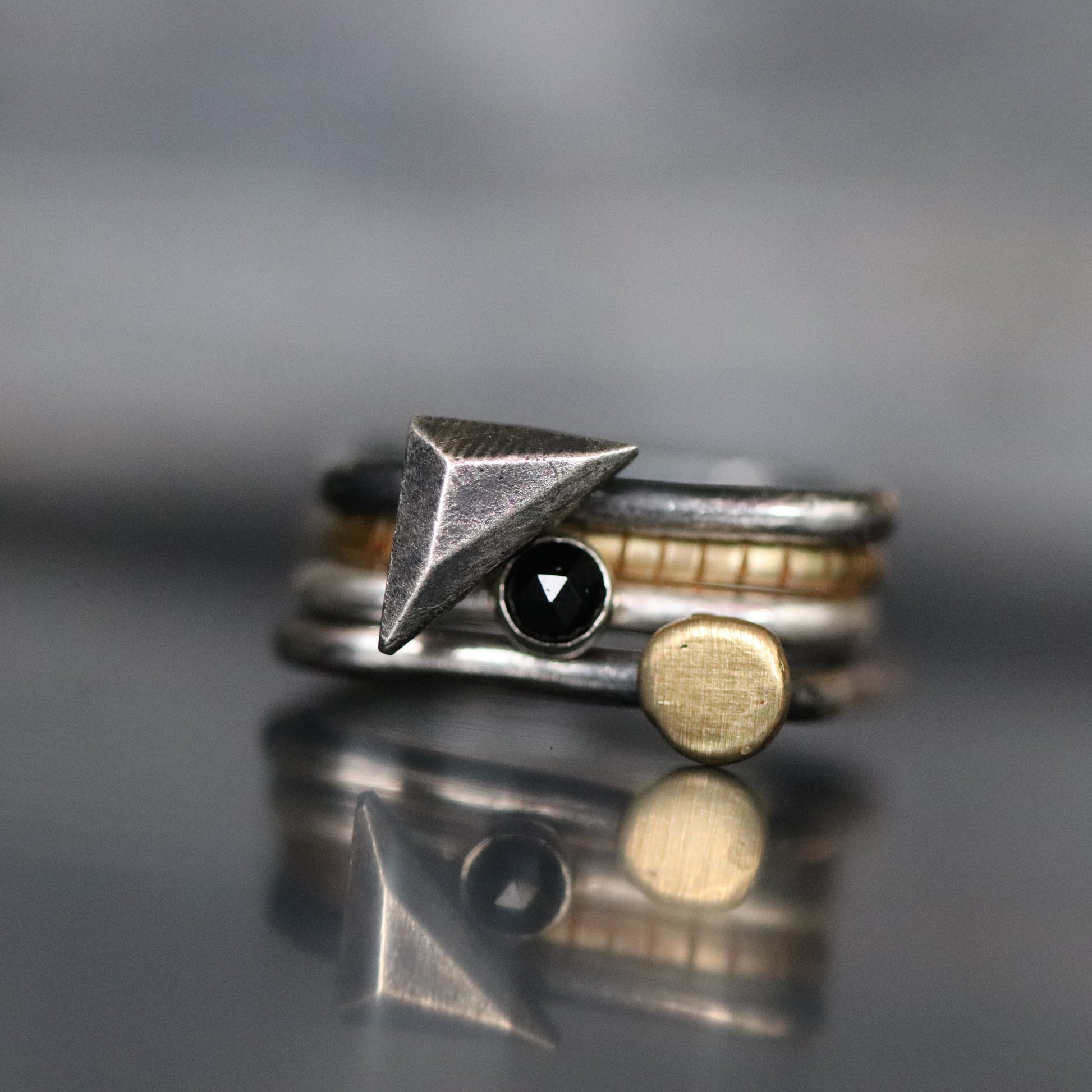 Set kojeg čine 4 jedinstvena prstena, od kojih svaki prsten možete nositi zasebno ili kombinirati po želji. Dva su prstena patinirana, a dva imaju srebreni matirani finish. Kamen je crni spinel a jedna točkica prsten je izrađen od mjedi.. Budući da je nakit ručno izrađen, nije identičan prikazanom na fotografiji, već vrlo sličan. Prstenje s nošenjem postaje svjetlije i sjajnije.