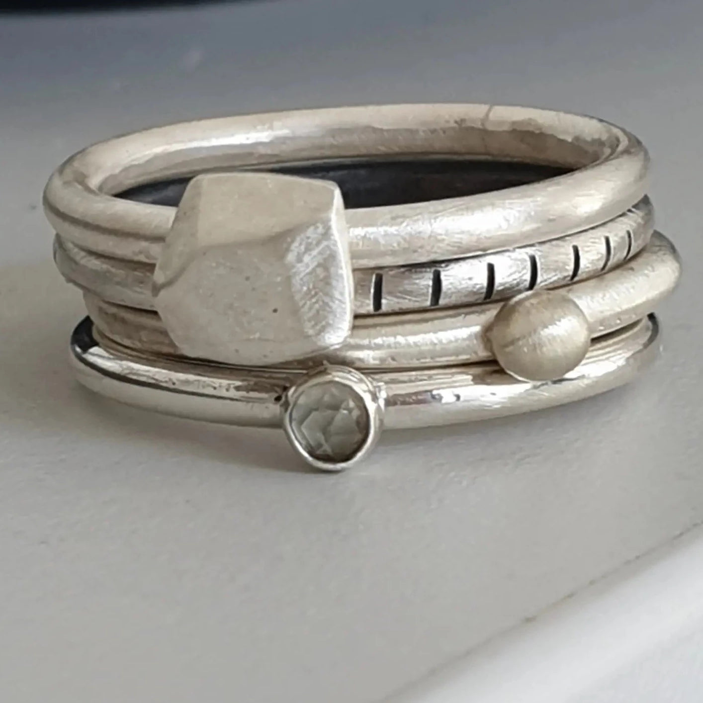 4U1 Spring vibes prehnit round je set kojeg čine 4 jedinstvena prstena, od kojih svaki prsten možete nositi zasebno ili kombinirati po želji. Dva su prstena patinirana, a dva imaju srebreni matirani finish. Kamen je nježno zeleni prehnit. Budući da je nakit ručno izrađen, nije identičan prikazanom na fotografiji, već vrlo sličan. Prstenje s nošenjem postaje svjetlije i sjajnije.
