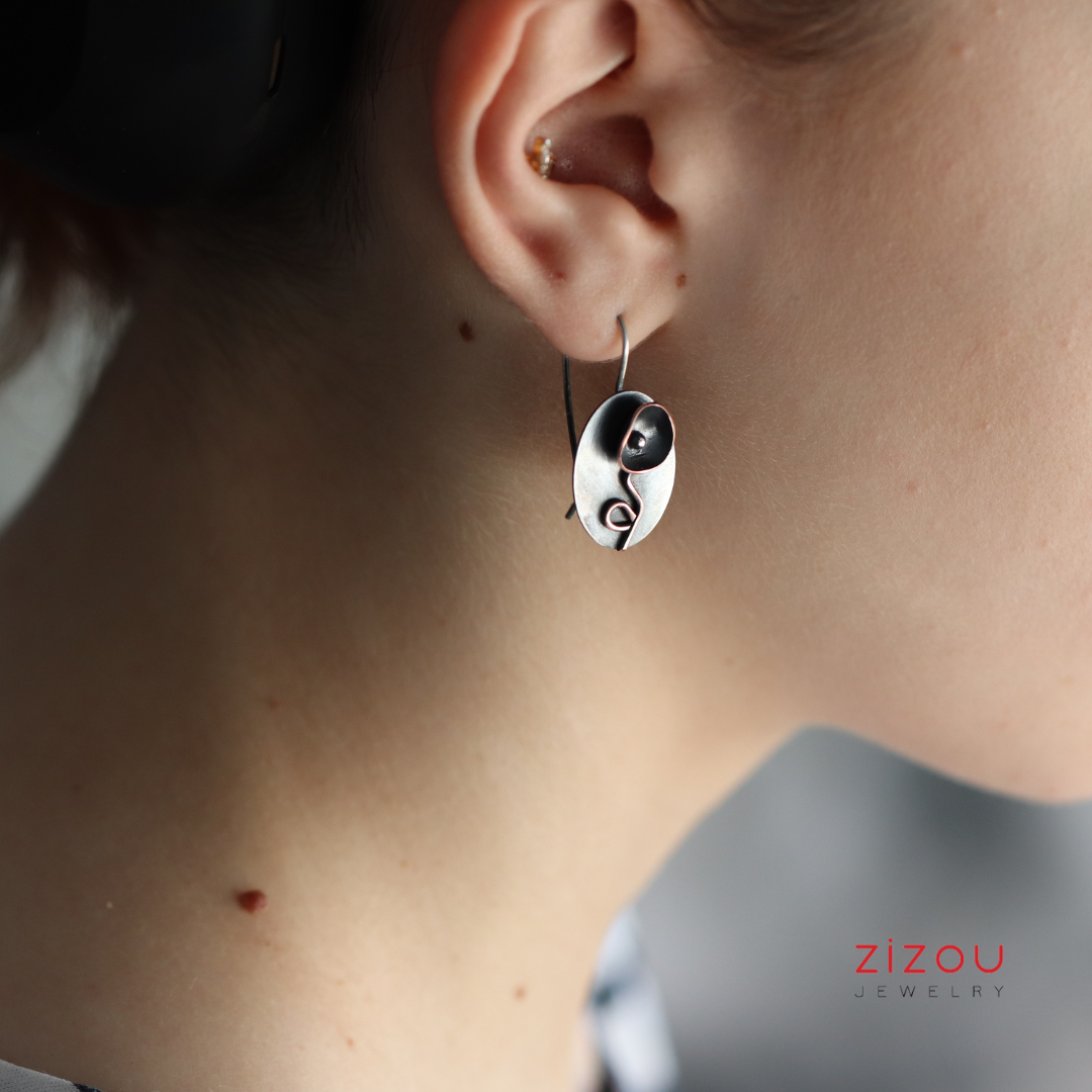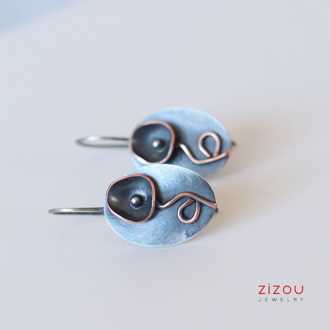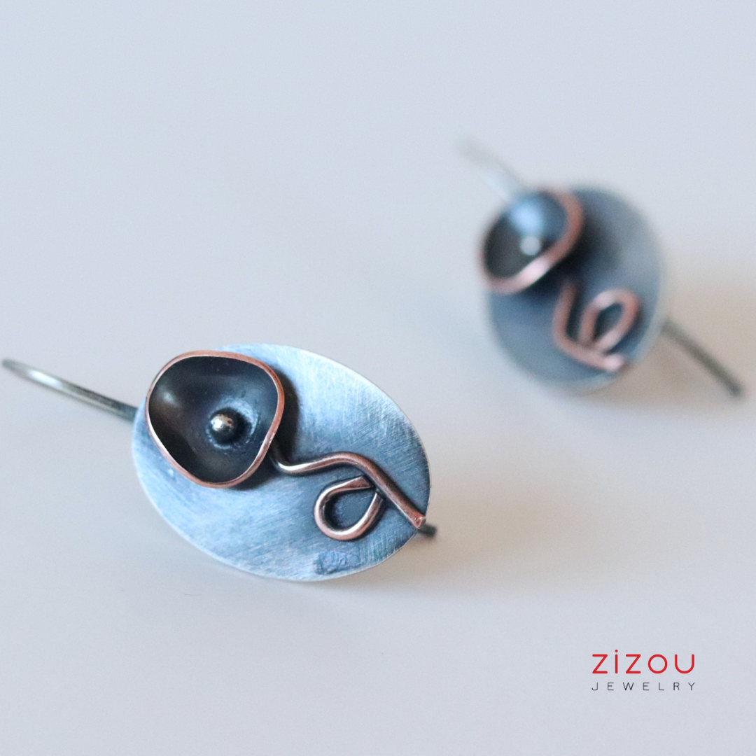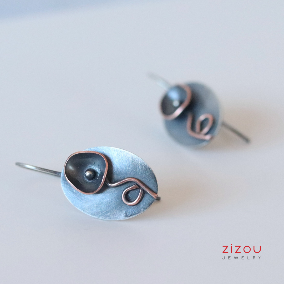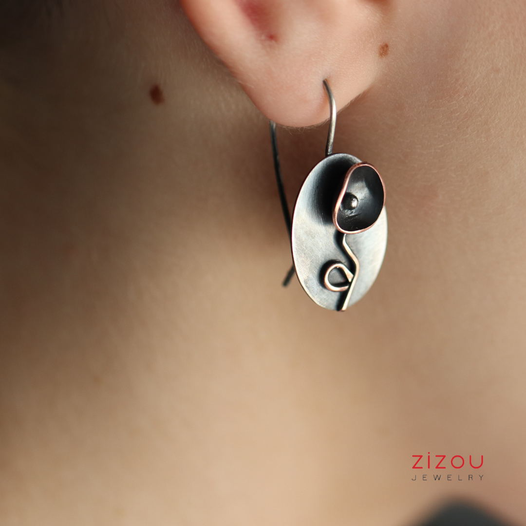 Naušnice Crni cvijet mix metala izrađene su u kombinaciji patiniranog srebra i bakra, dimenzija 23 x 15 mm. Budući da je nakit ručno izrađen, nije identičan prikazanom na fotografiji, već vrlo sličan. Patina s nošenjem postaje svjetlija i sjajnija.