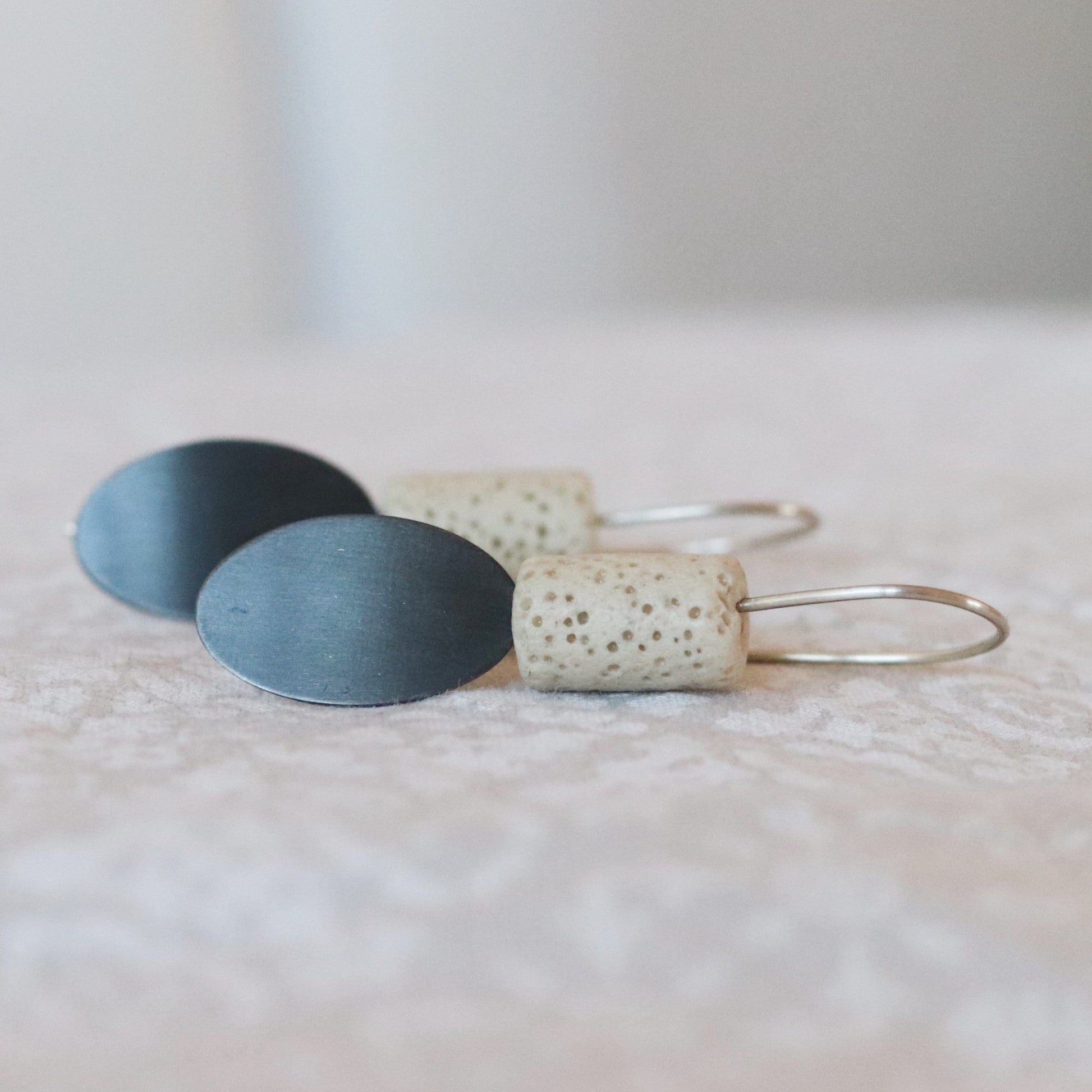 Oval day SAND su naušnice duljine 50 mm, izrađene od recikliranog patiniranog srebra i lave. Budući da su ručno izrađene, nisu identične prikazanom na fotografiji, već vrlo slične. Patina s vremenom postaje svjetlija.
