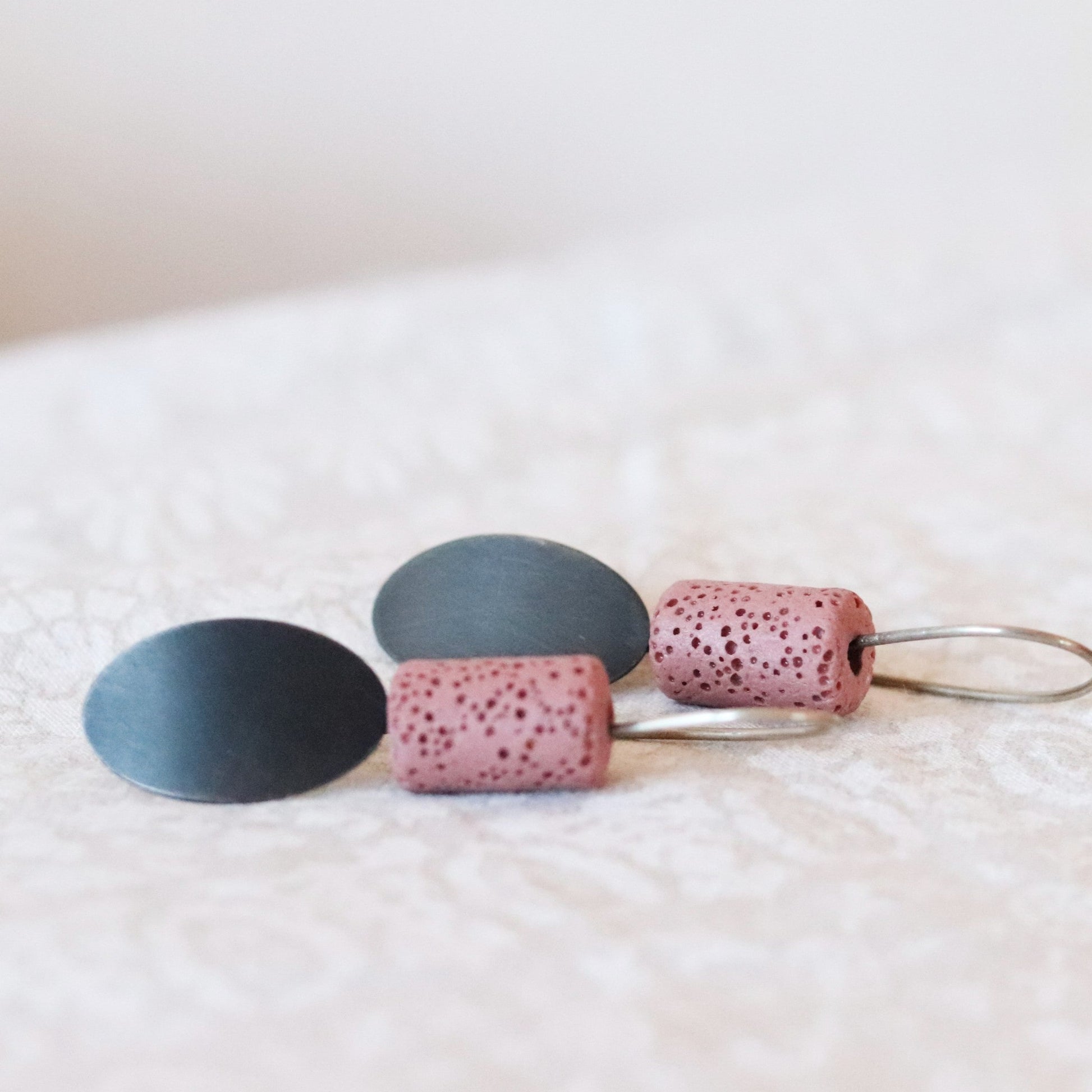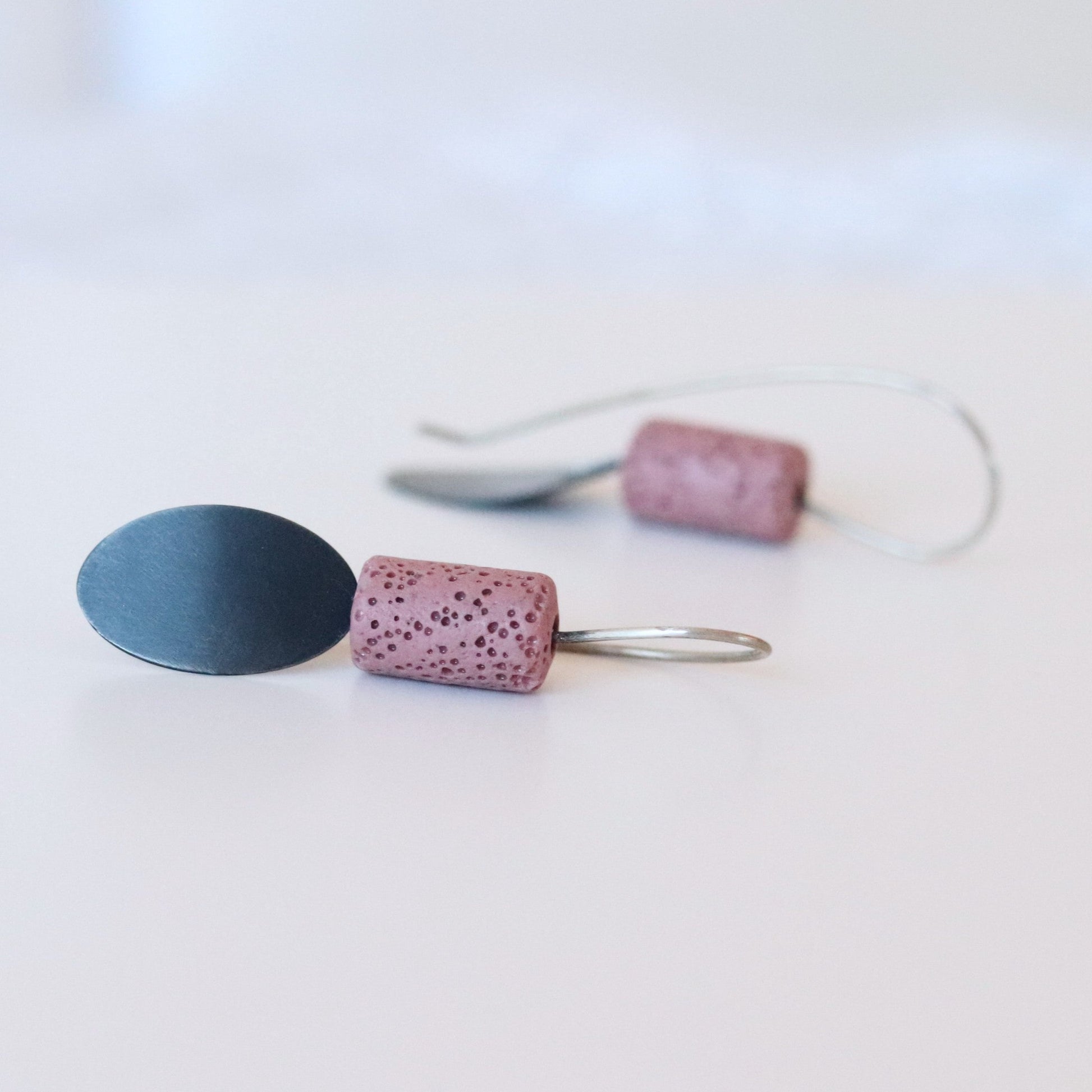 Oval day Pastel purple su naušnice duljine 50 mm, izrađene od recikliranog patiniranog srebra i lave. Budući da su ručno izrađene, nisu identične prikazanom na fotografiji, već vrlo slične. Patina s vremenom postaje svjetlija.
