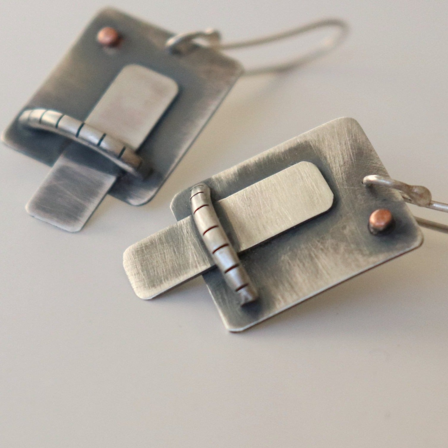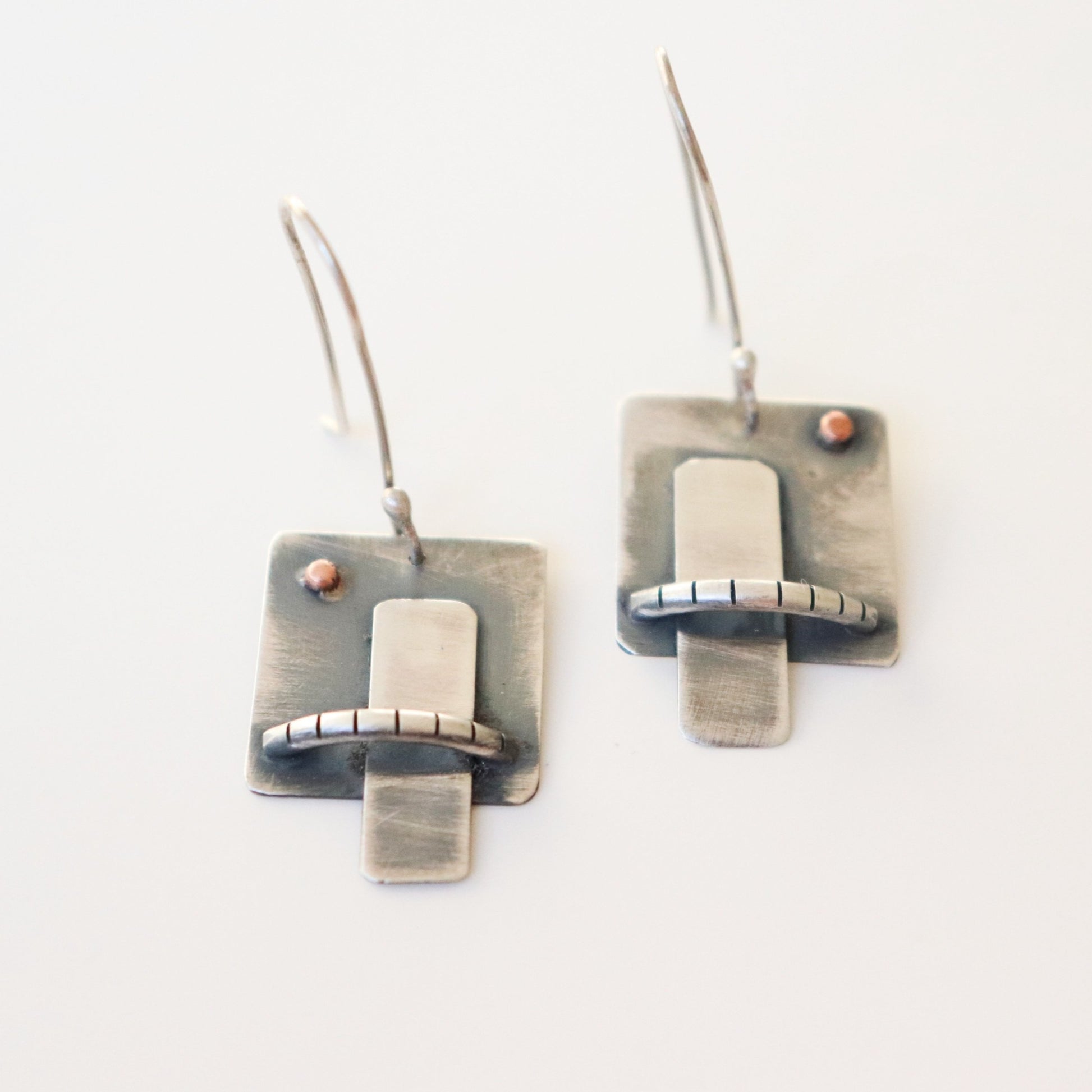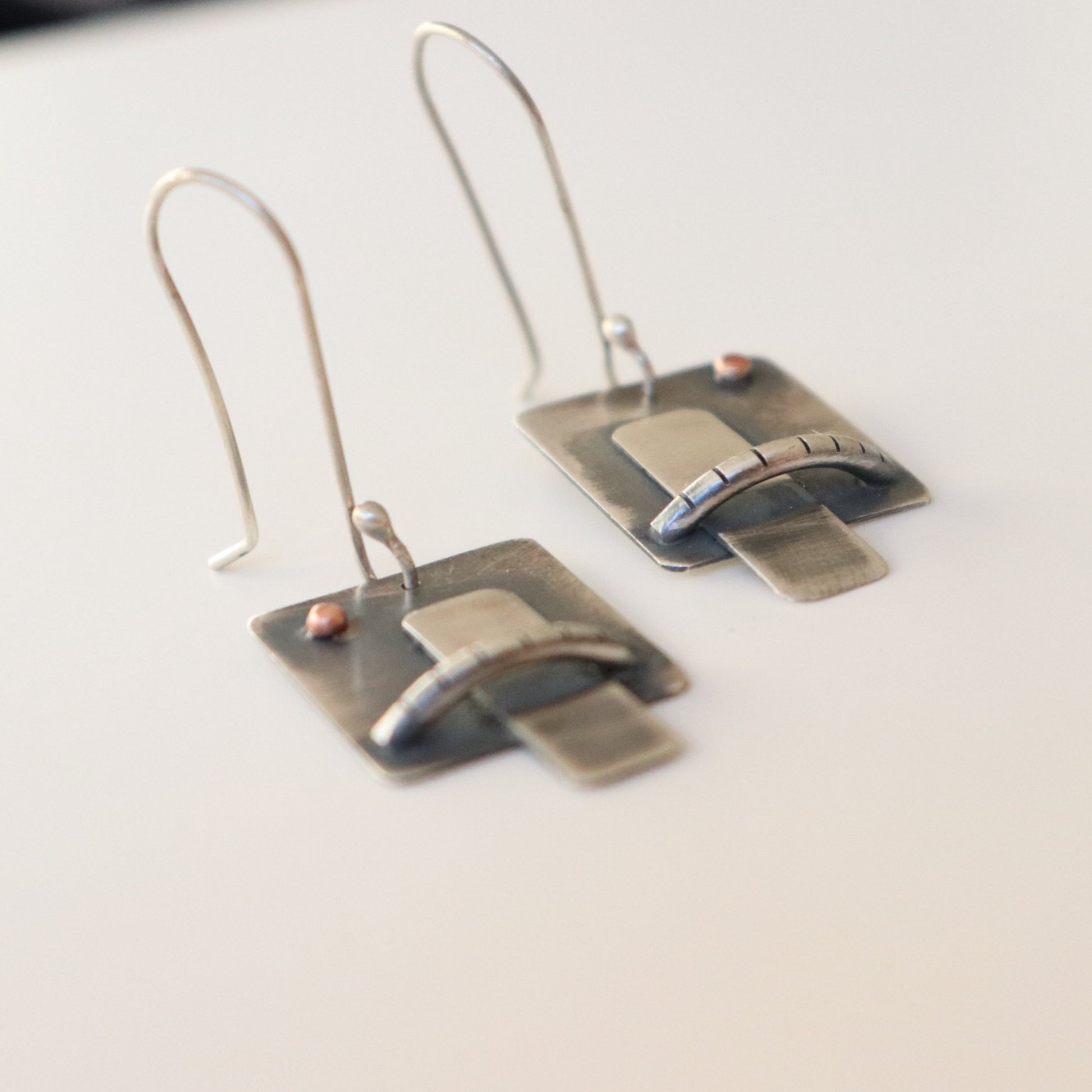 Neobične naušnice Under the bridge viseće su naušnice izrađene od recikliranog srebra, patinirane, uz dodatak bakrene točkice. Naušnice su dimenzije 20 x 18 mm. Budući da je nakit ručno izrađen, nije identičan prikazanom na fotografiji, već vrlo sličan. Patina s vremenom postaje svjetlija.