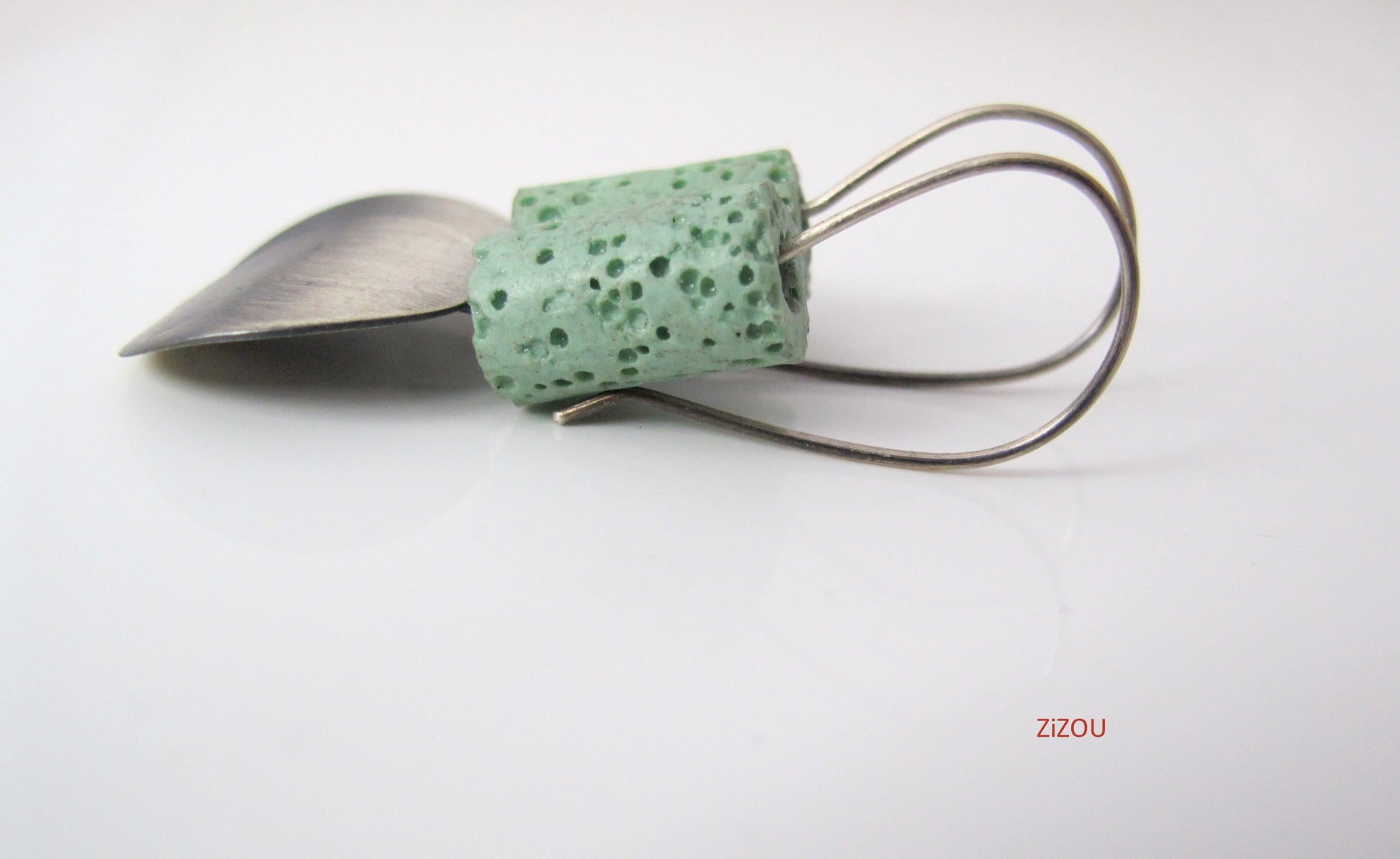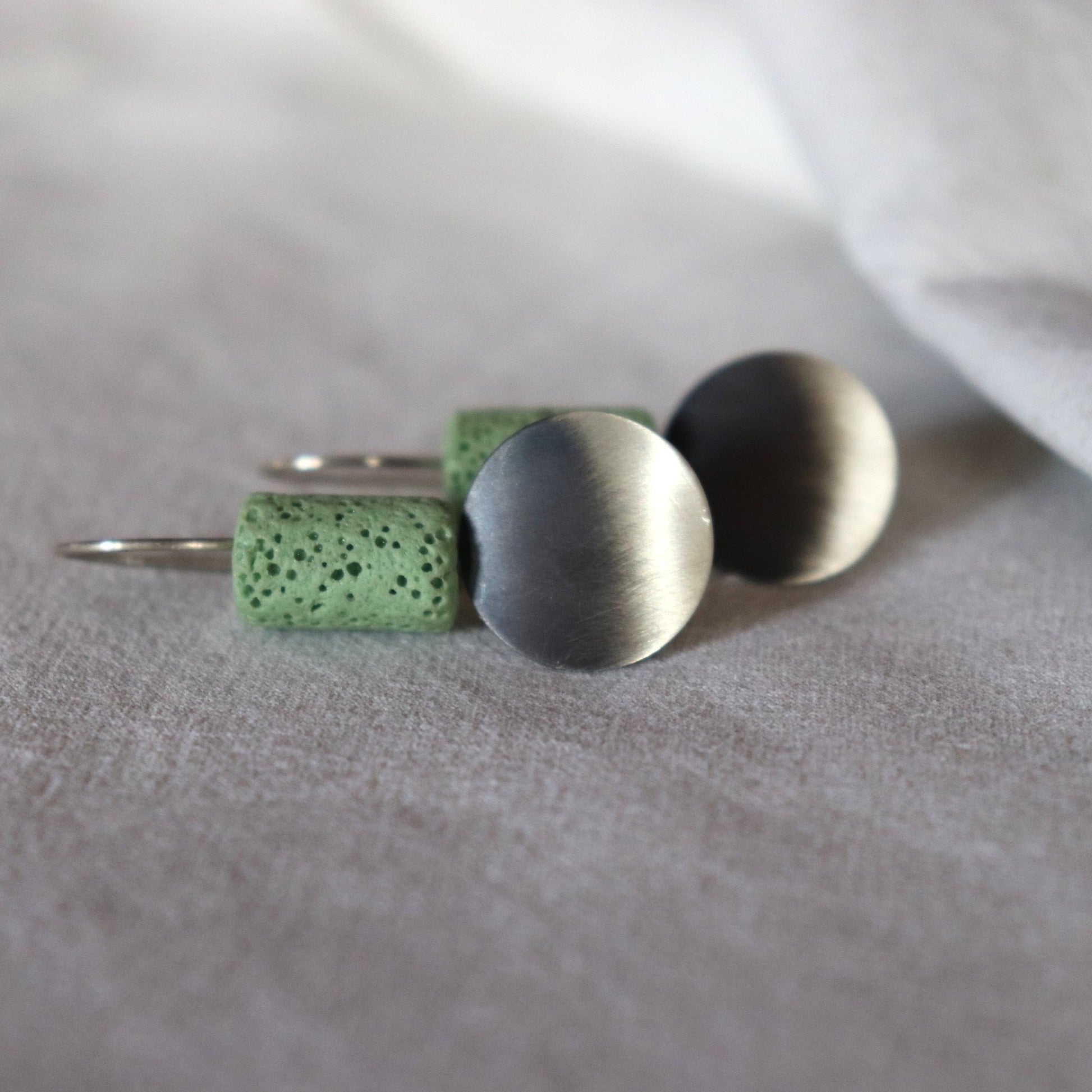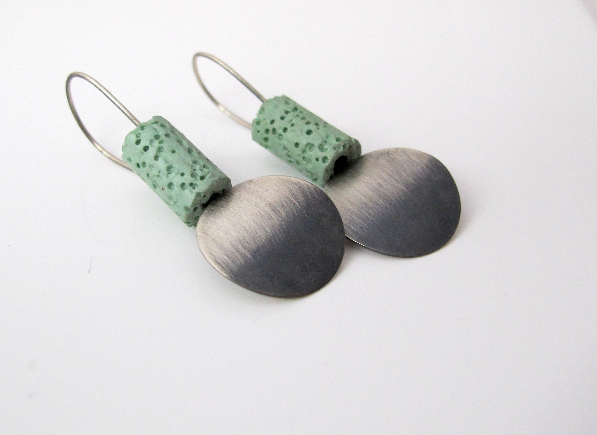Geometric day Minty green! su naušnice duljine 50 mm, izrađene od recikliranog patiniranog srebra s ombre efektom i lave. Budući da su ručno izrađene, nisu identične prikazanom na fotografiji, već vrlo slične. Patina s vremenom postaje svjetlija.