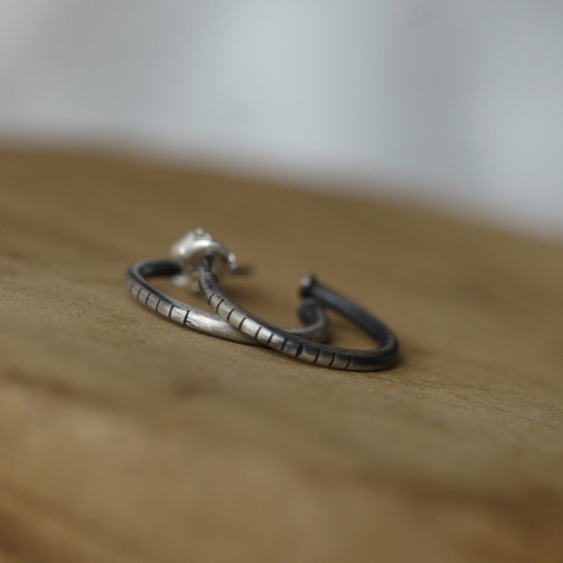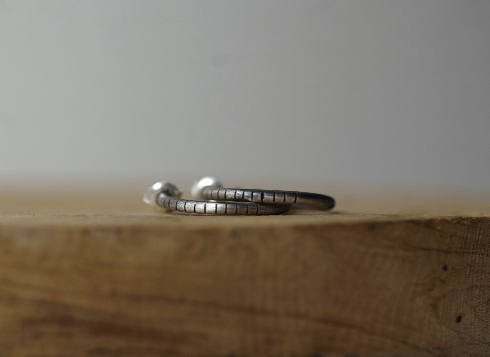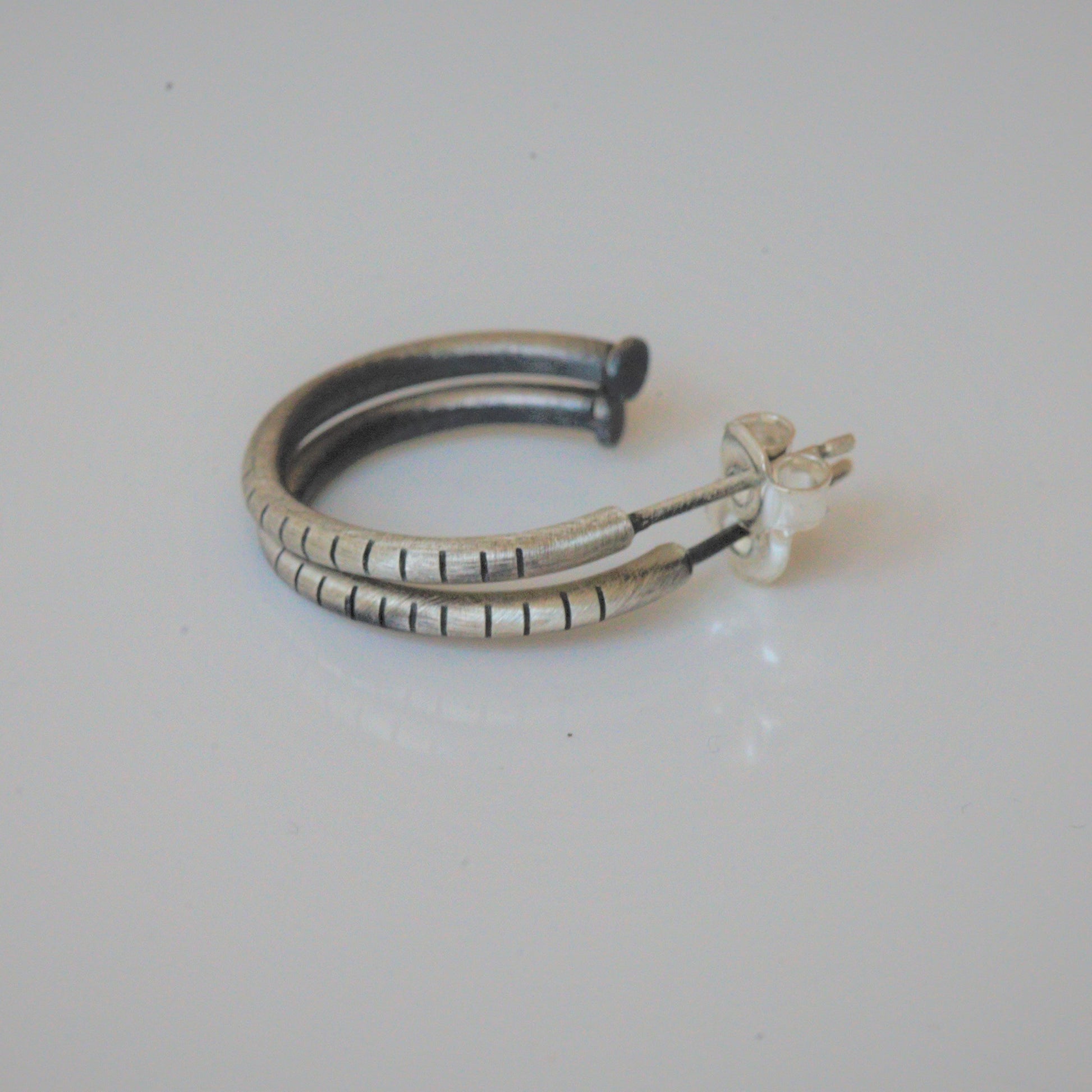 Jednostavne naušnice Stripes & Hoopes izrađene su od recikliranog srebra, te dodatno patinirane. Patina s vremenom postaje svjetlija i sjajnija. Naušnice su promjera 16 mm. Budući da je nakit ručno izrađen, nije identičan prikazanom na fotografiji, već vrlo sličan.