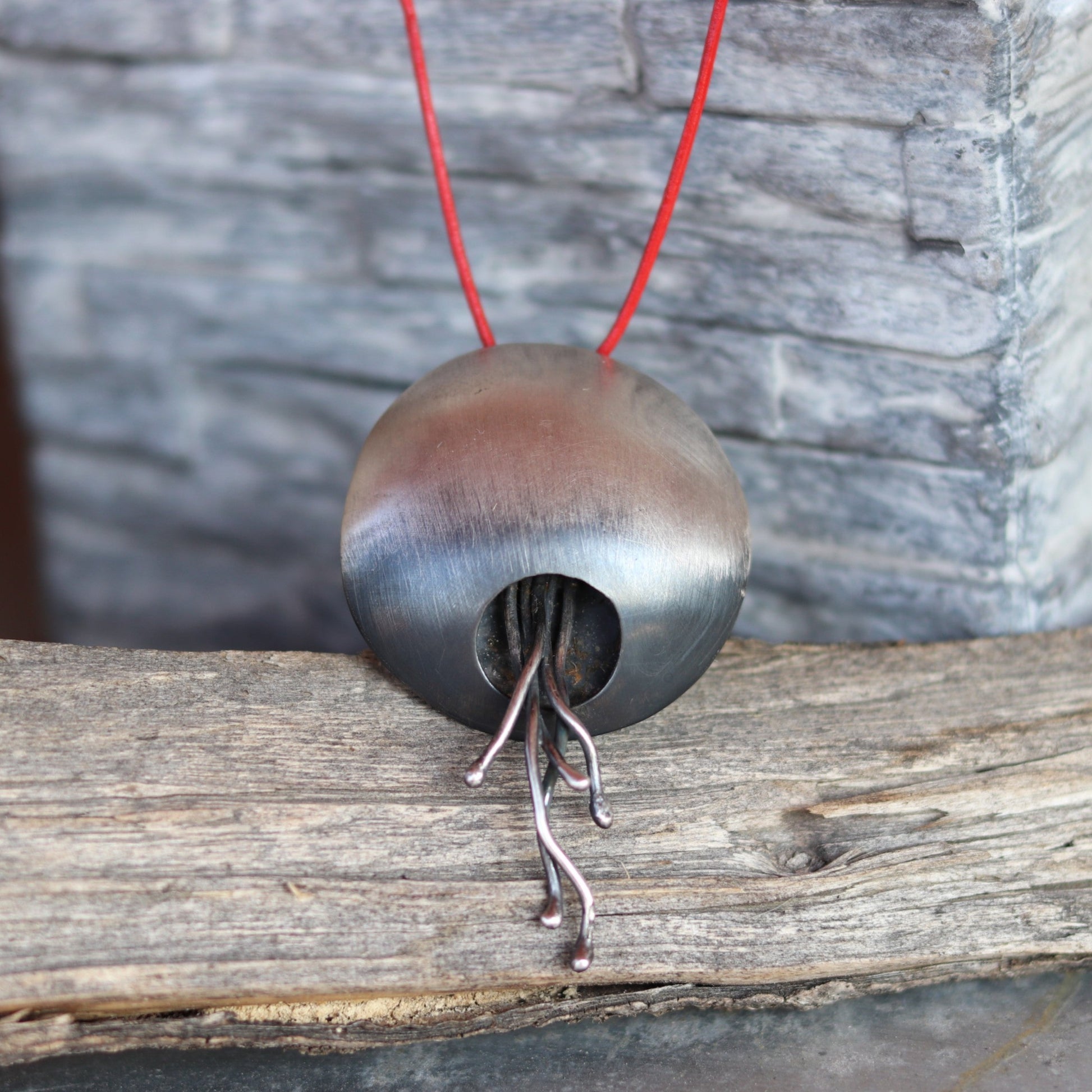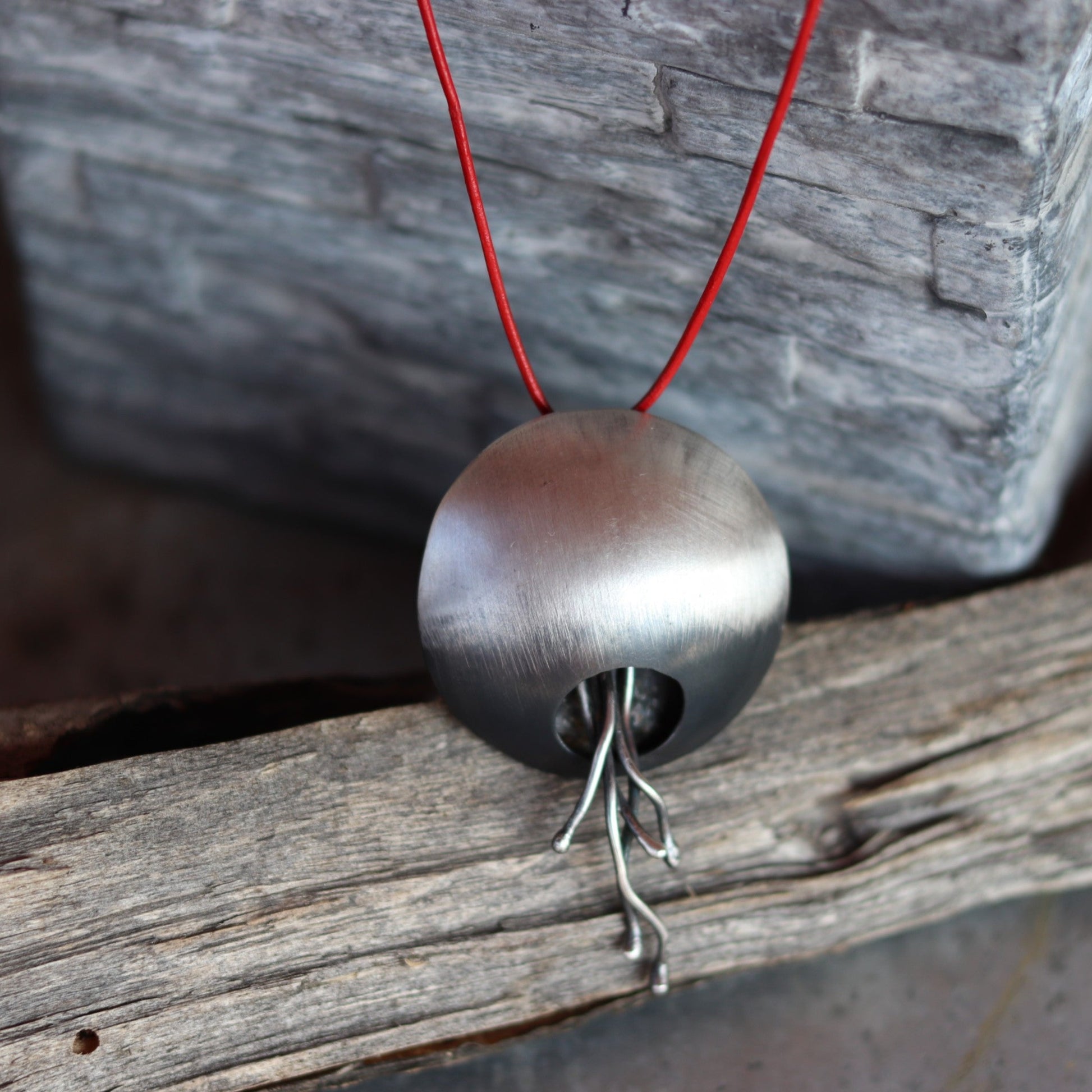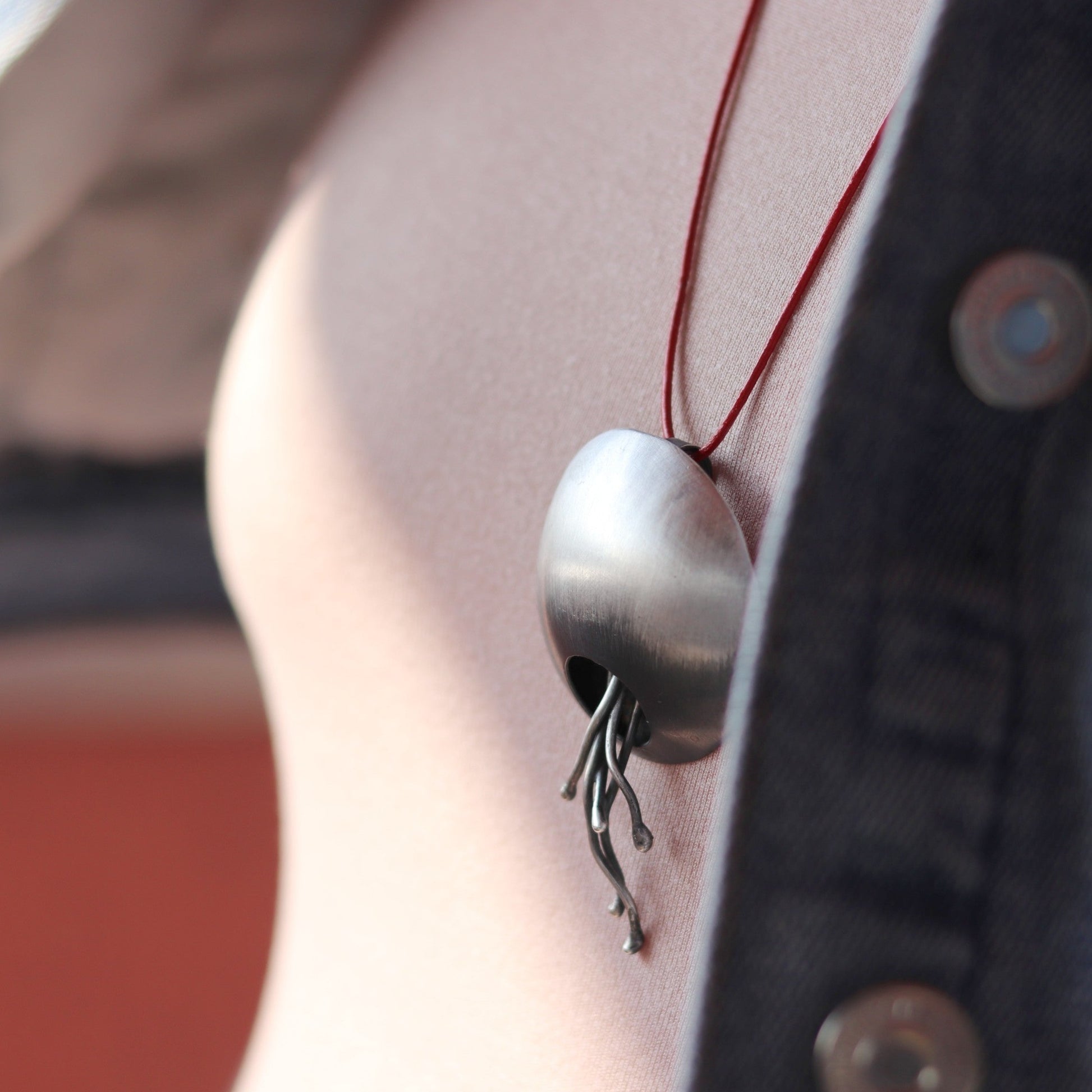 O je jednostavna geometrijska ogrlica u središtu koje je patinirani srebrni privjesak na kaučuku, sa srebrnom kopčom. Privjesak je duljine 65 mm cca, od čega je sami krug dimenzije 45 mm. Budući da je nakit ručno izrađen, nije identičan prikazanom na fotografiji, već vrlo sličan. Patina s vremenom postaje svjetlija i sjajnija.