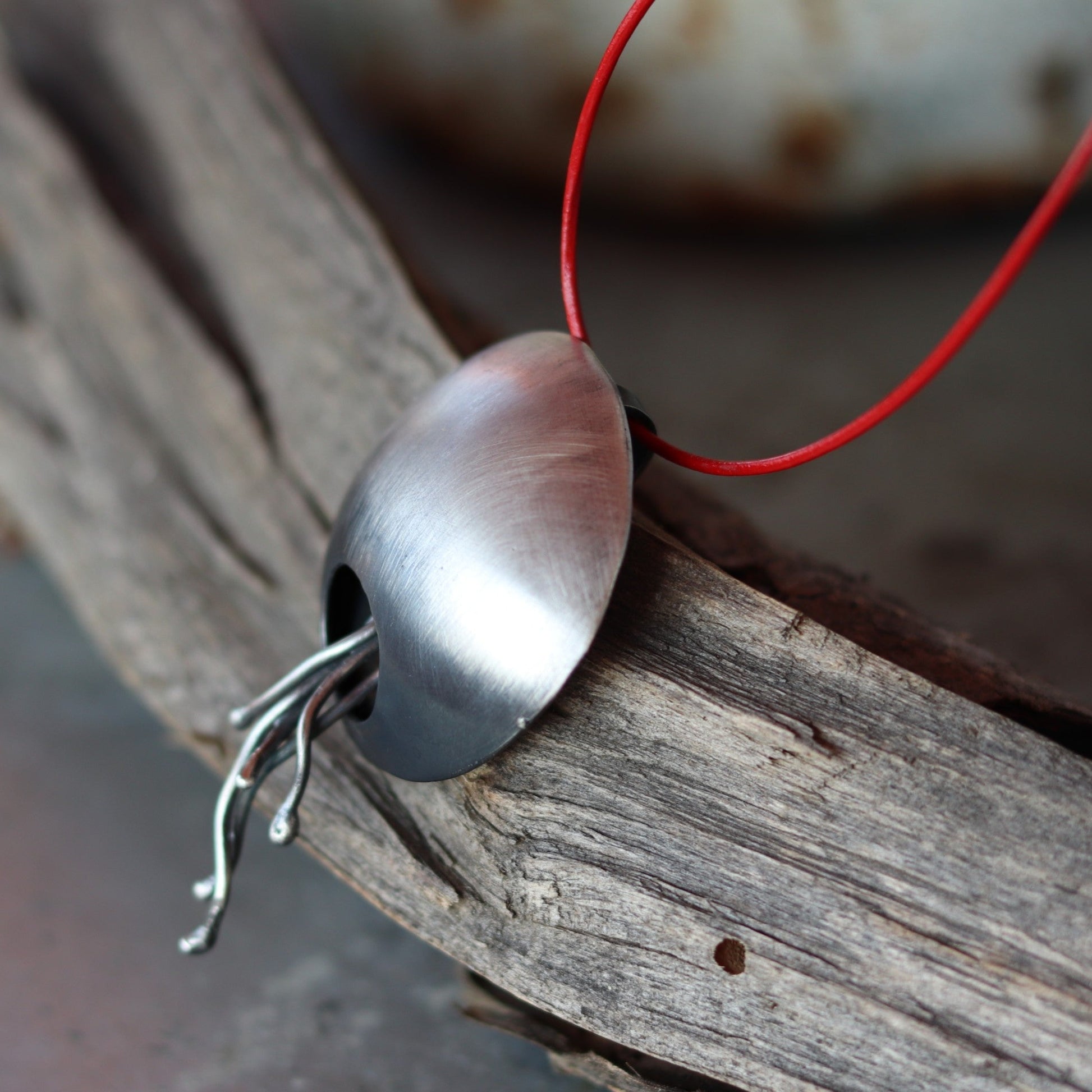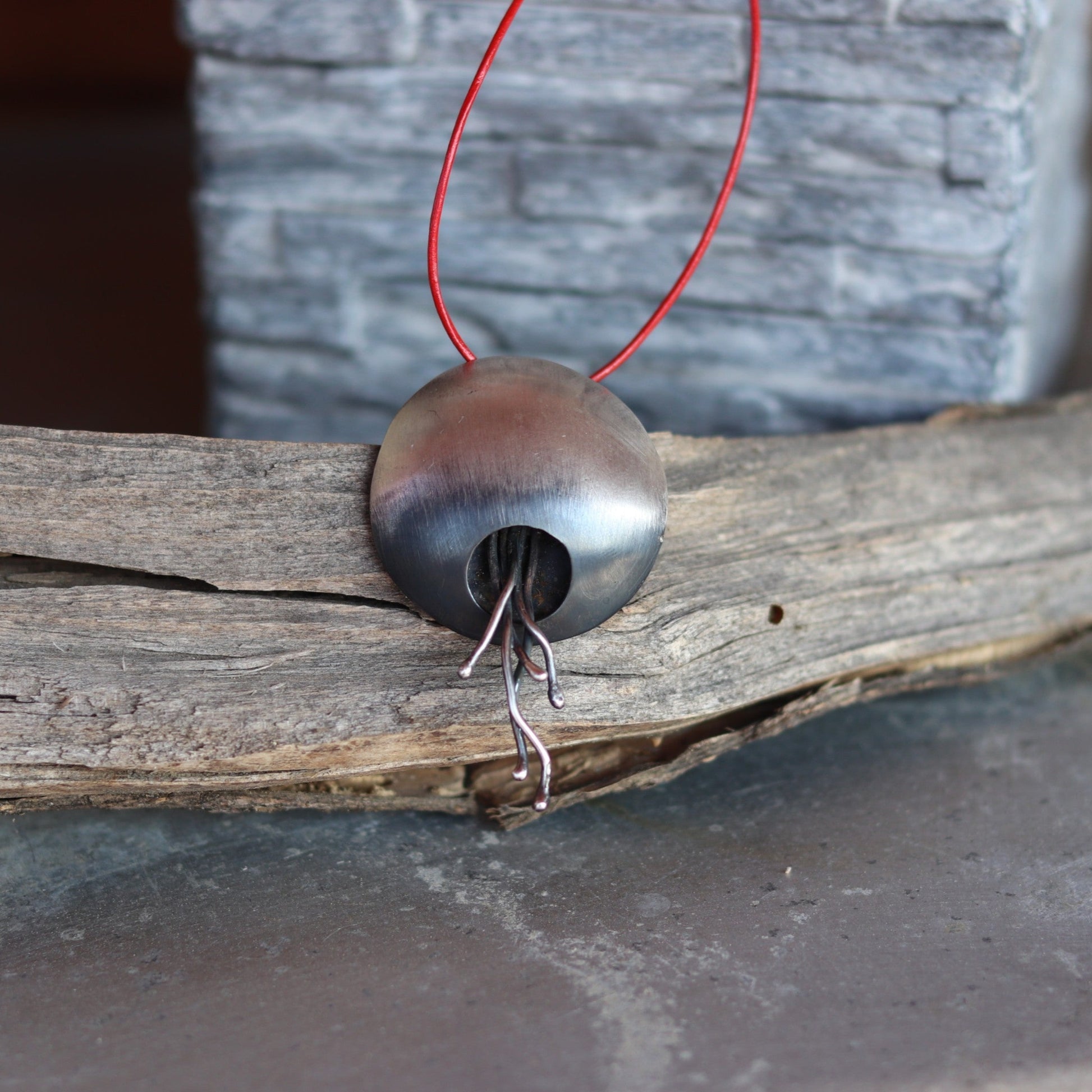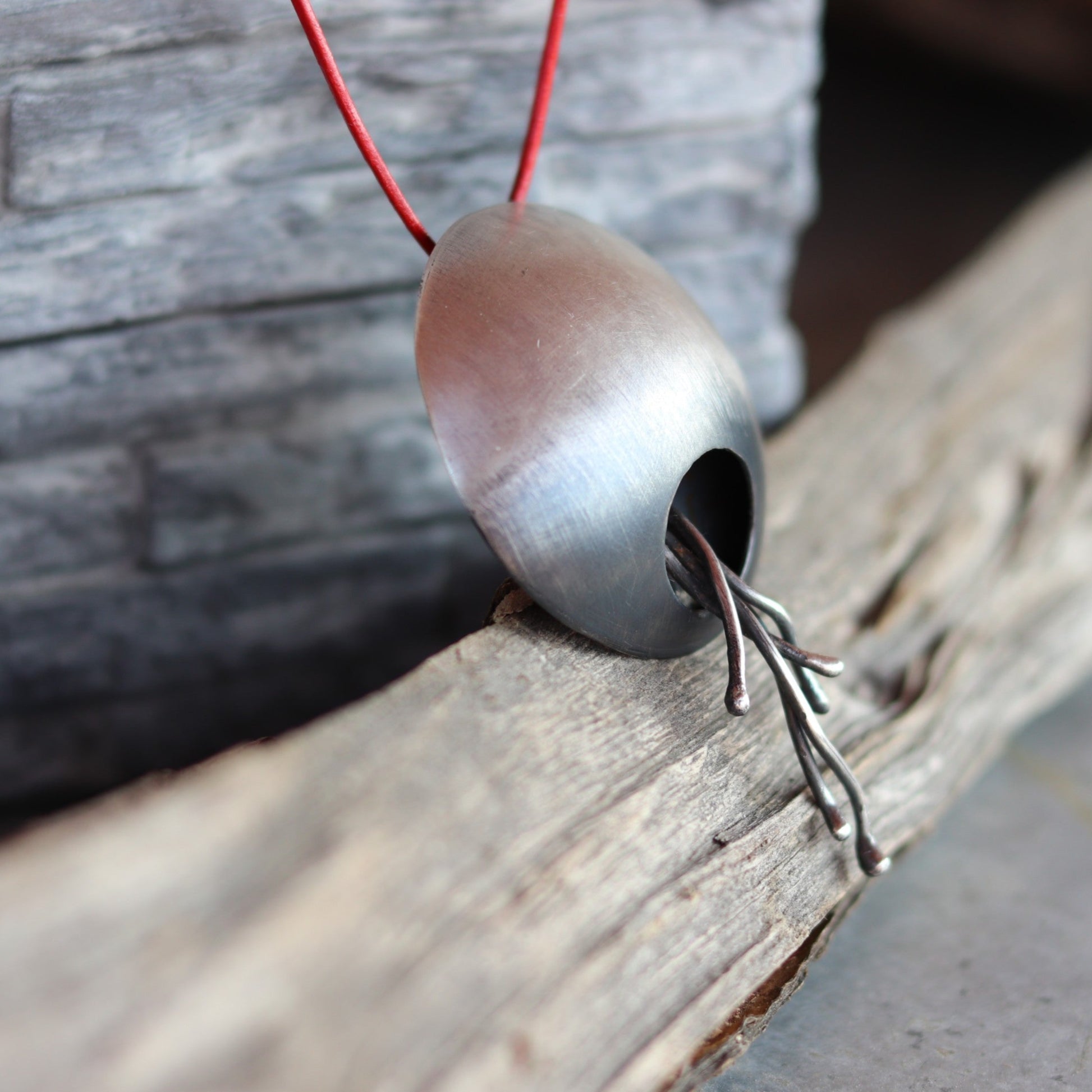 O je jednostavna geometrijska ogrlica u središtu koje je patinirani srebrni privjesak na kaučuku, sa srebrnom kopčom. Privjesak je duljine 65 mm cca, od čega je sami krug dimenzije 45 mm. Budući da je nakit ručno izrađen, nije identičan prikazanom na fotografiji, već vrlo sličan. Patina s vremenom postaje svjetlija i sjajnija.