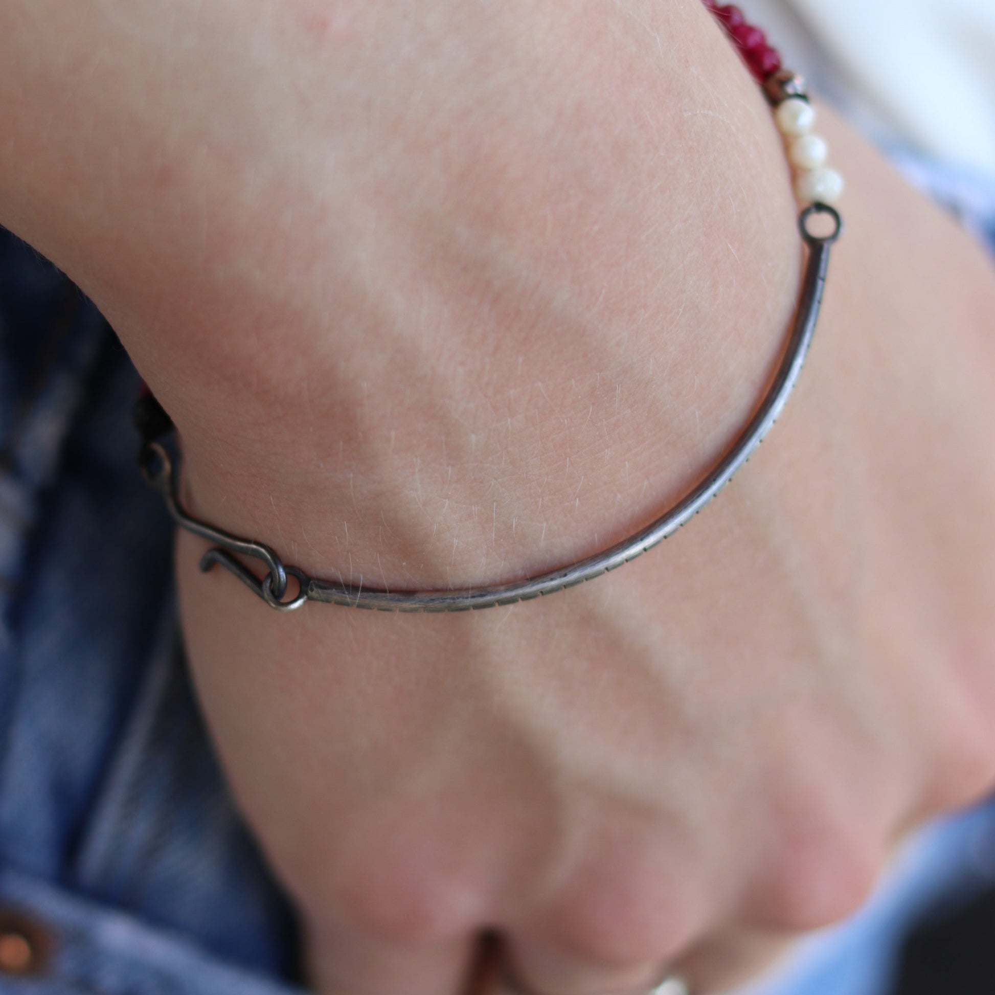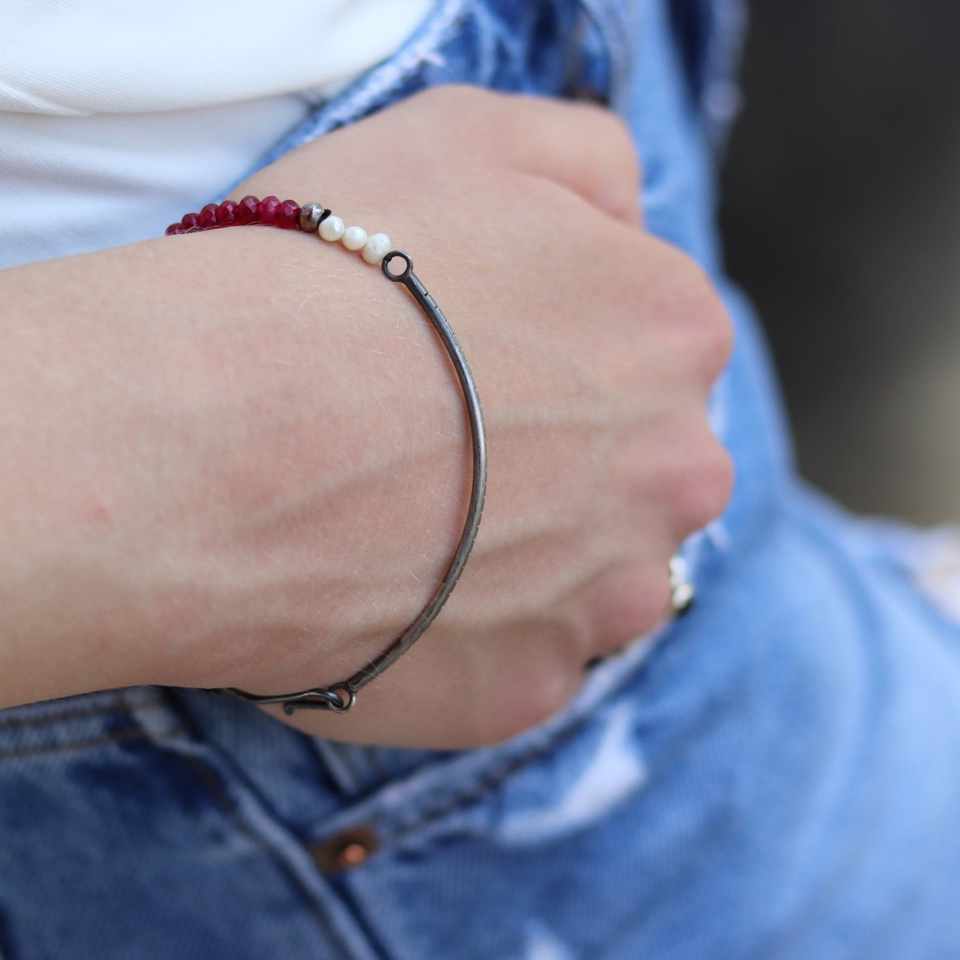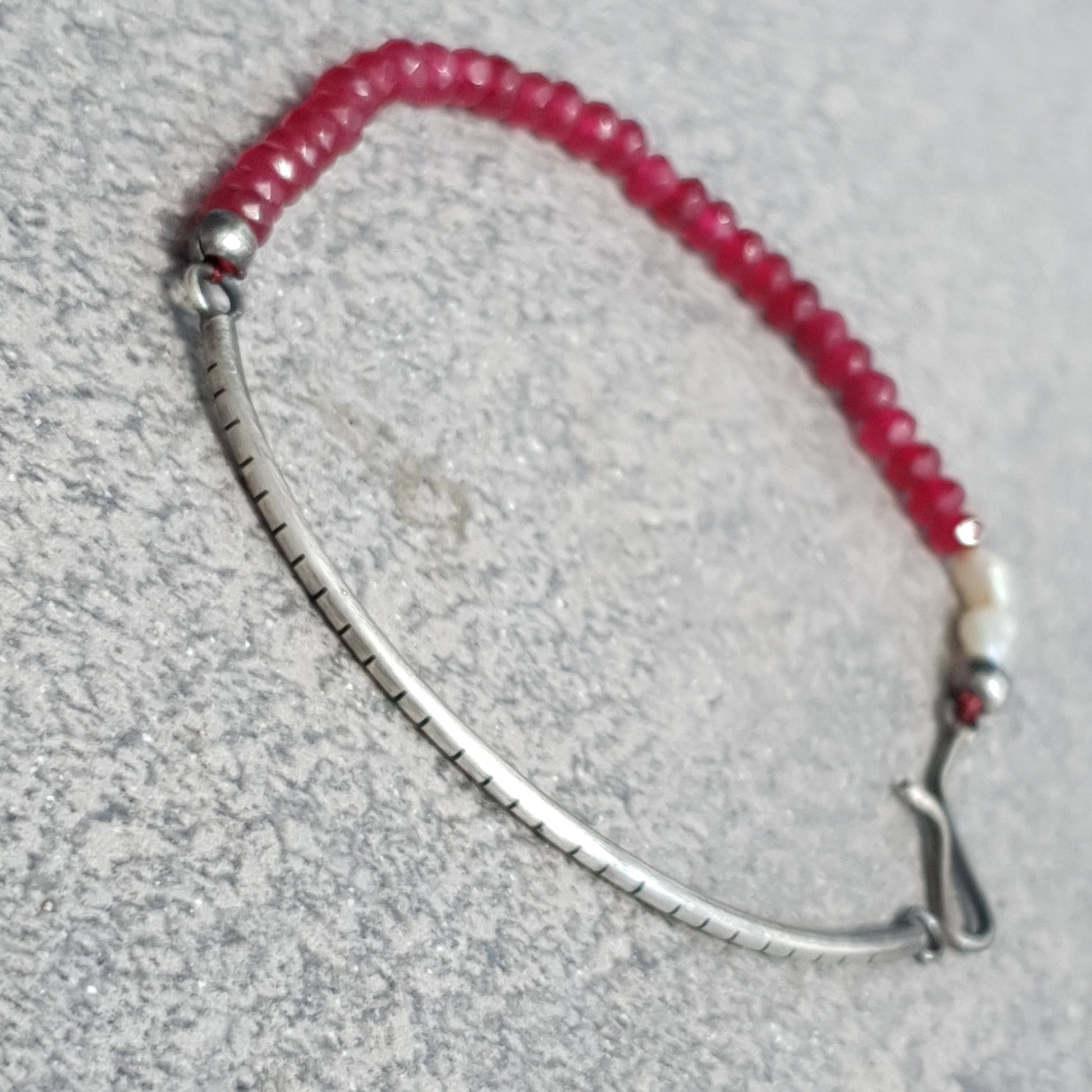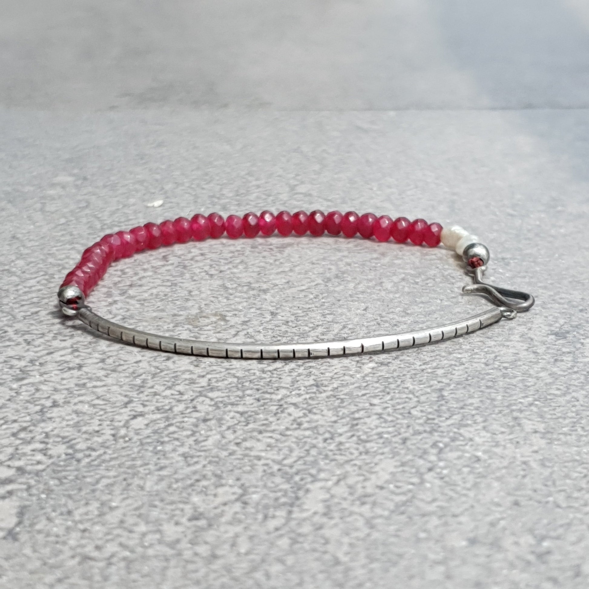 Jednostavna i moderna Stripes & Stones narukvica izrađena je od recikliranog srebra, patinirana u crno, uz red ruby jade kvarc i 3 bisera. Patina se s nošenjem skida i postaje svjetlija / sivlja po rubovima. Budući da je nakit ručno izrađen, nije identičan prikazanom na fotografiji, već vrlo sličan.