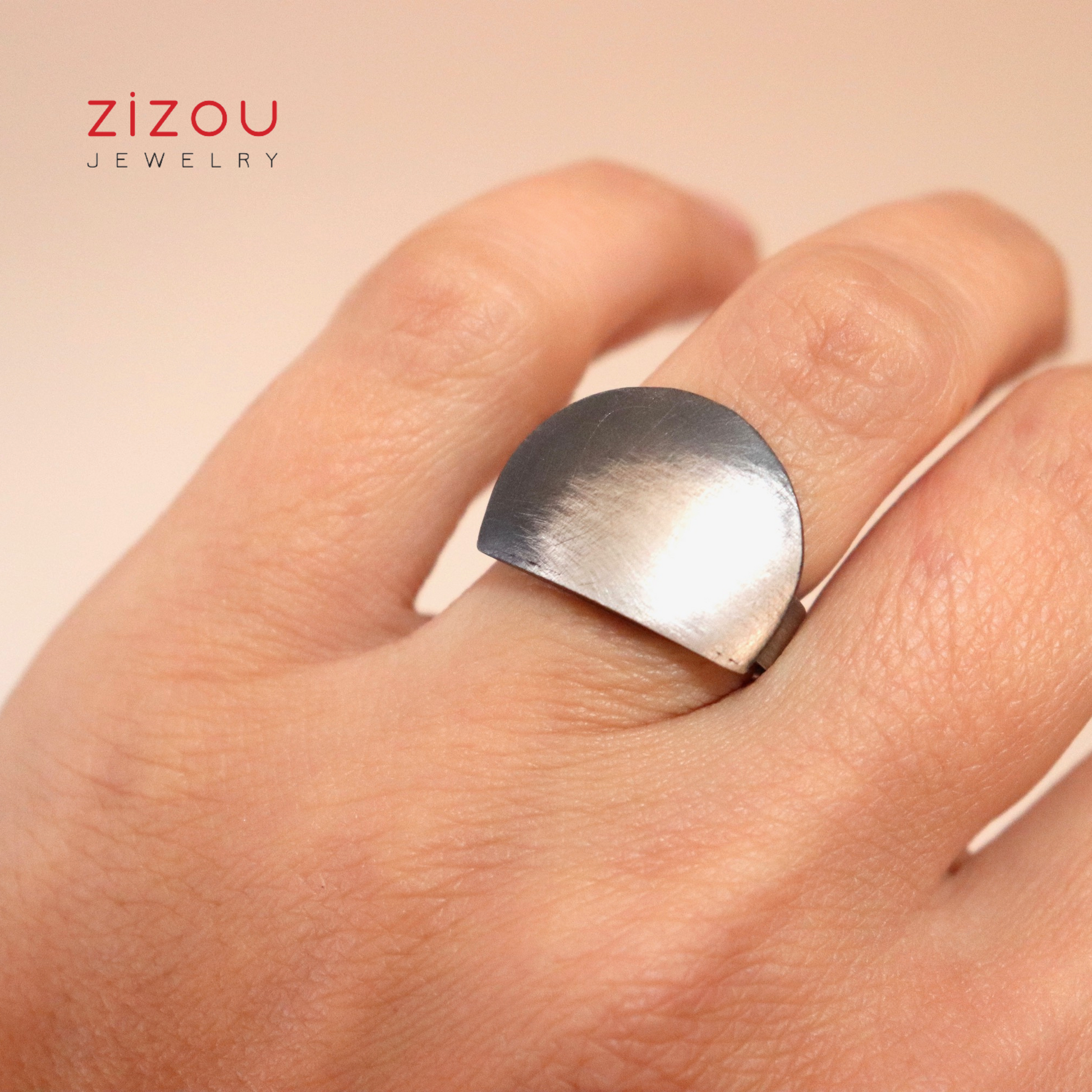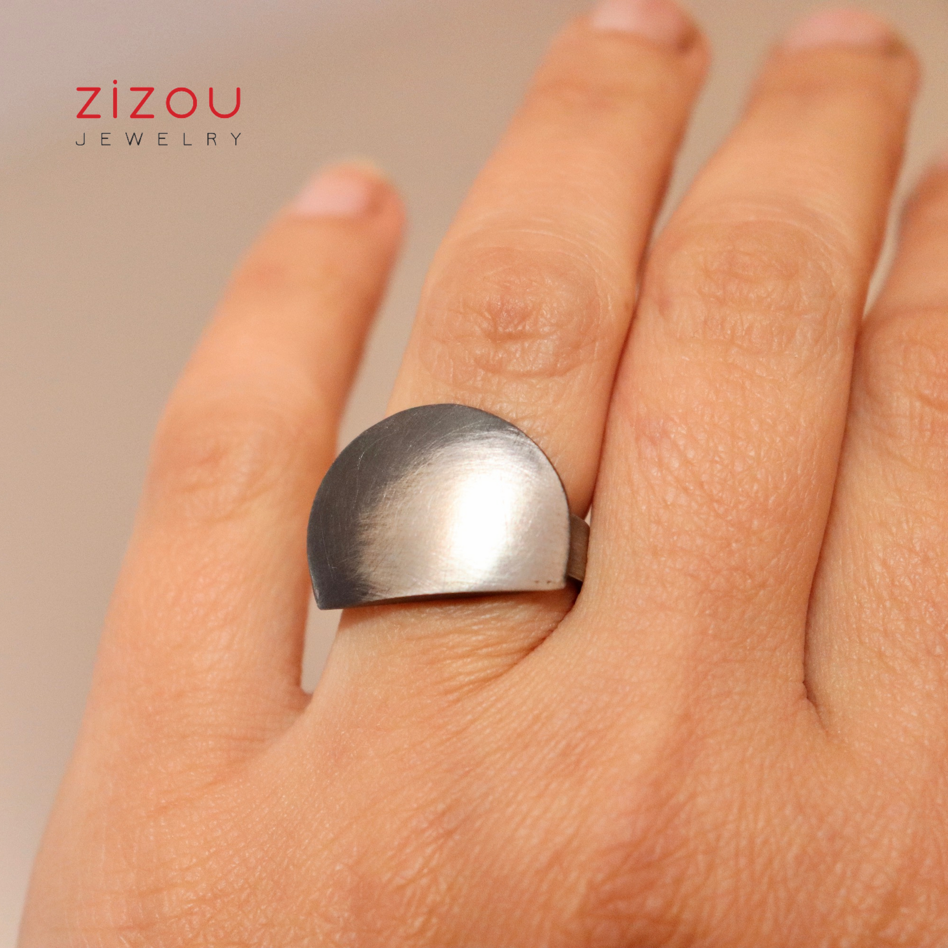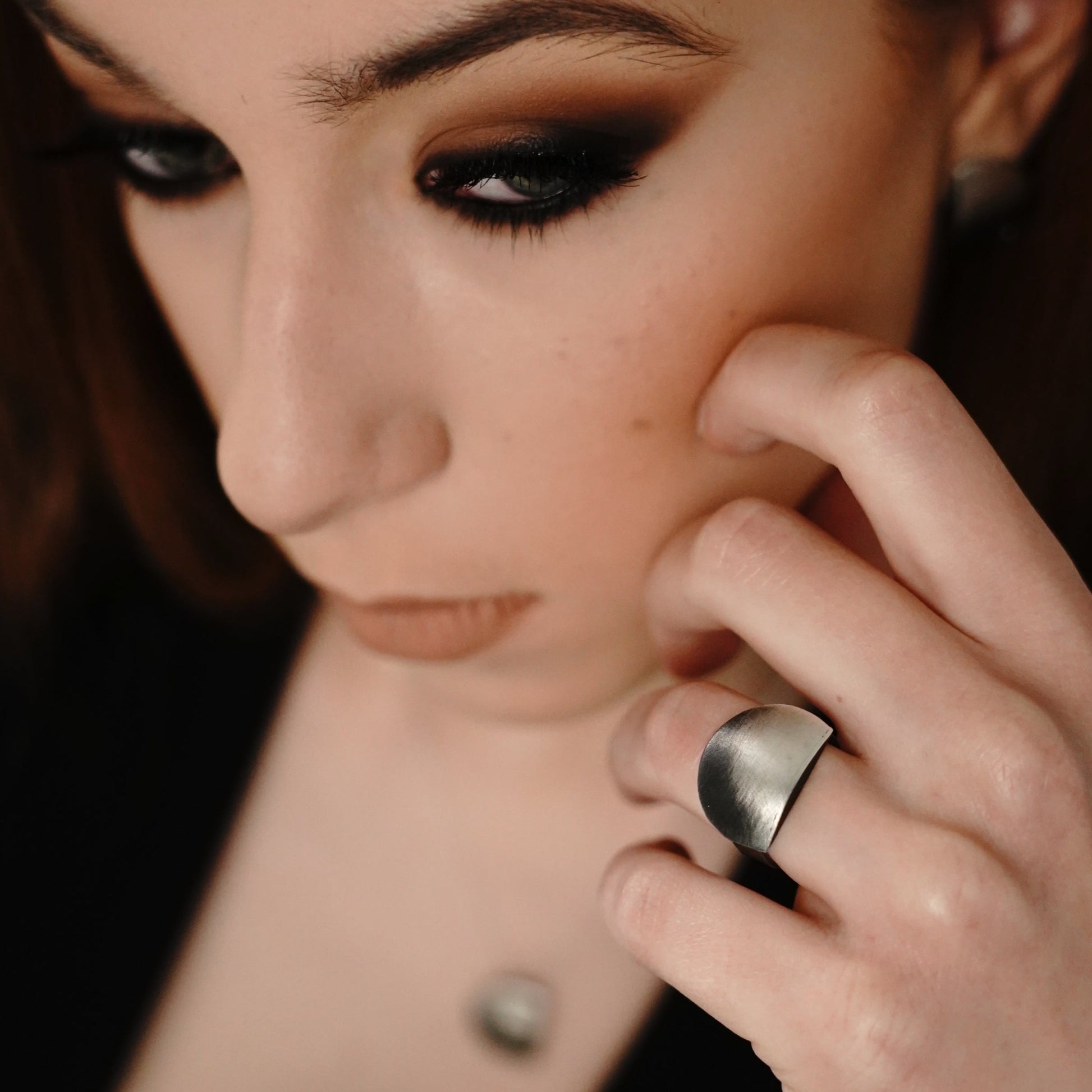 The Moon prsten izrađen je od recikliranog srebra, te dodatno patiniran. Možete ga izabrati i kao čisti srebrni prsten u modelu Full Moon. Duljina na najširem dijelu iznosi 22 mm a straga 5 mm. Prstenje s nošenjem postaje svjetlije i sjajnije. Budući da je nakit ručno izrađen, nije identičan prikazanom na fotografiji, već vrlo sličan.