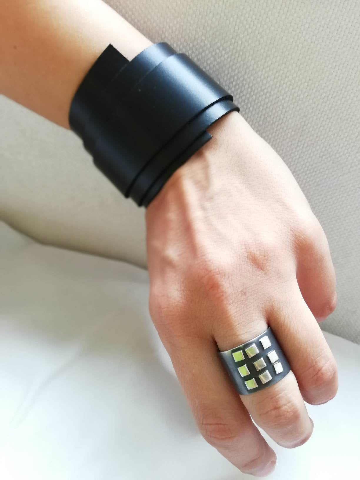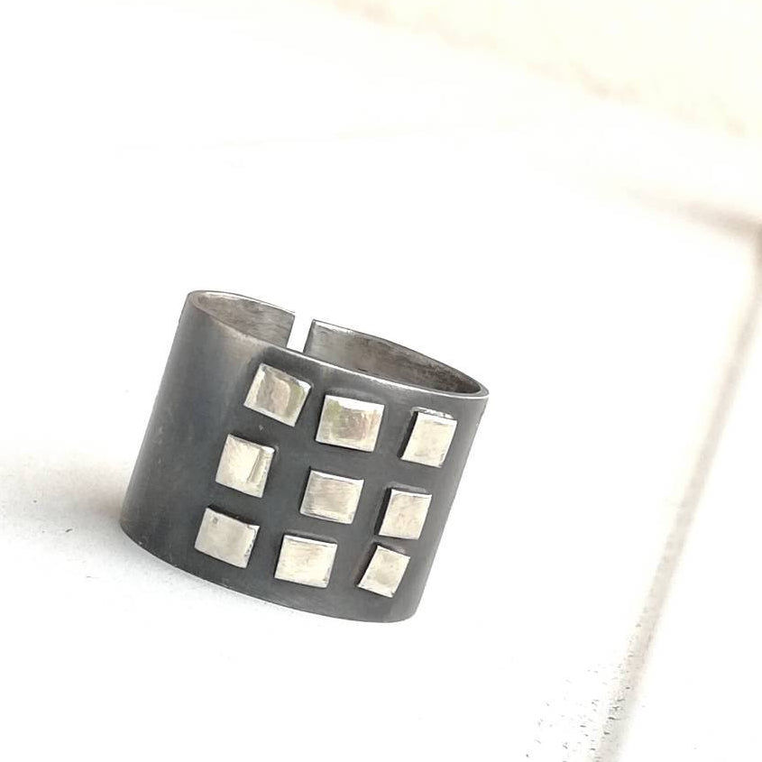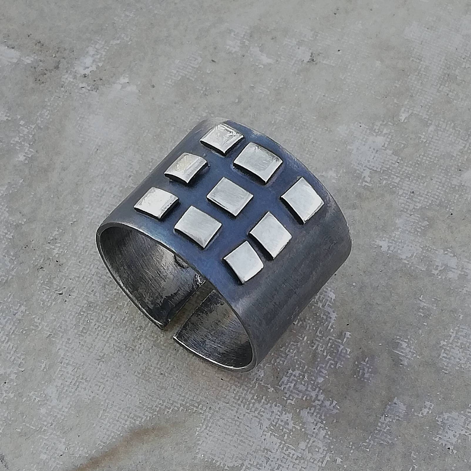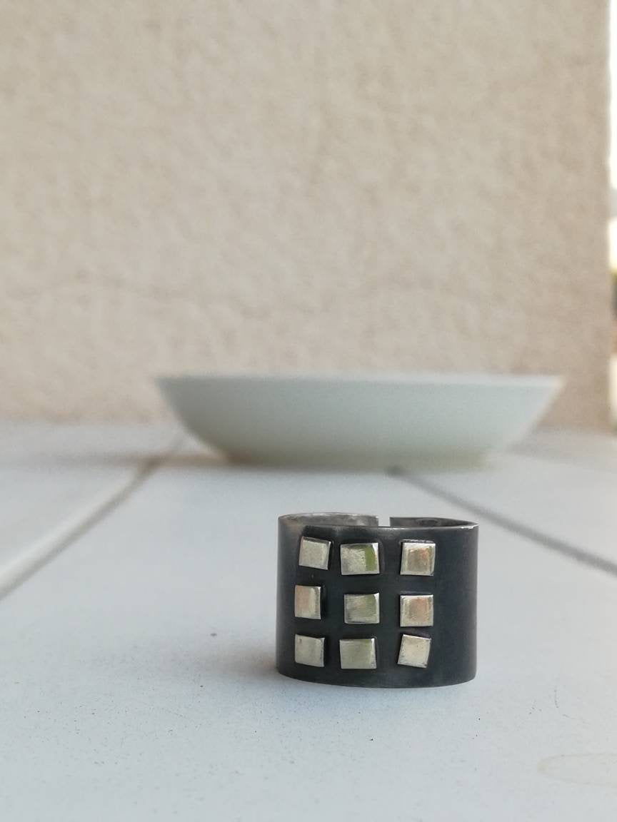 Program tvog kompjutera je jednostavan, ali dominantan prsten izrađen od srebra s geometrijskim detaljima. Prsten je patiniran, širok 15 mm, no može se prilagoditi za jedan broj (krug nije puni). Prstenje s nošenjem postaje svjetliji i sjajniji. Budući da je nakit ručno izrađen, nije identičan prikazanom na fotografiji, već vrlo sličan.