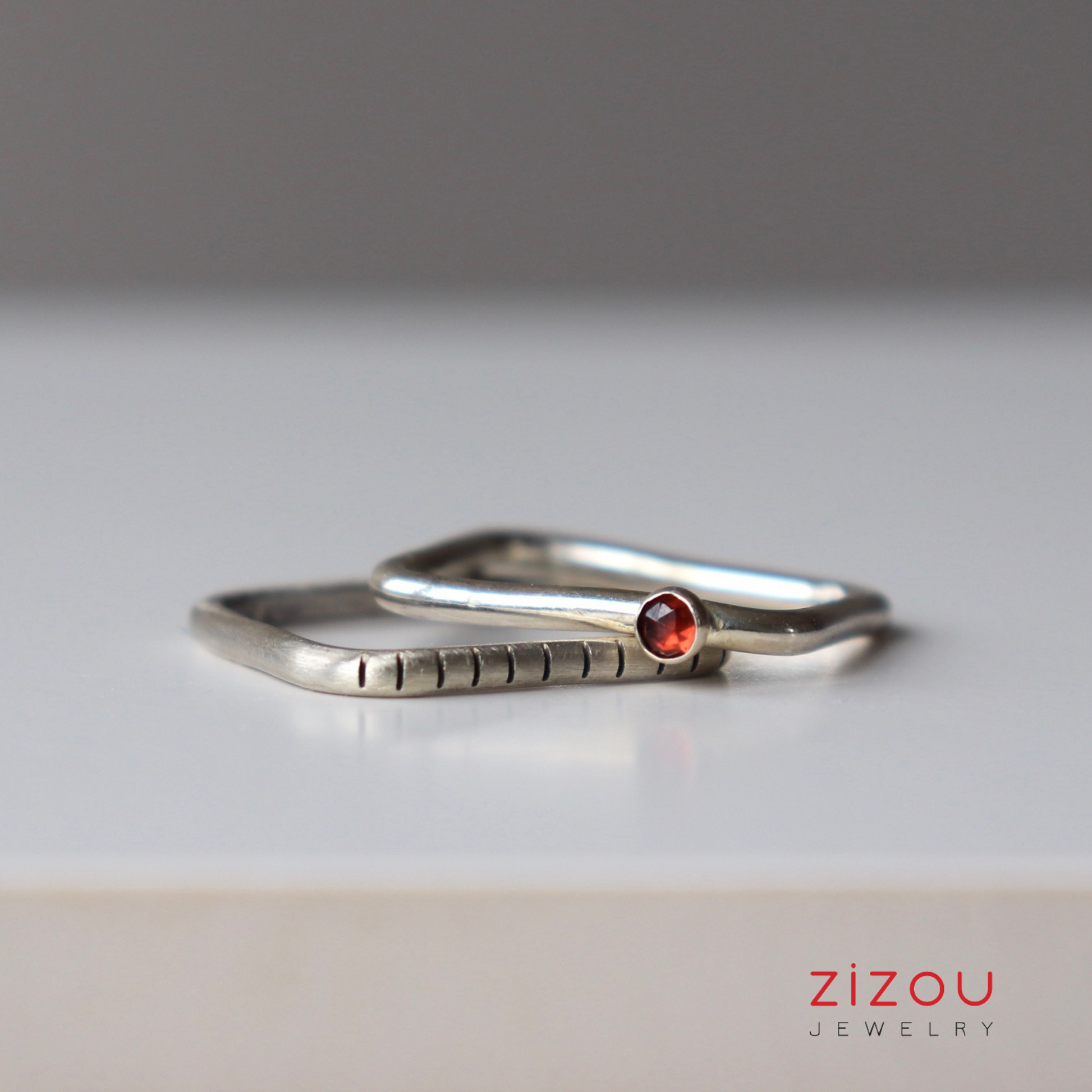 2U1 granat square čine 2 prstena izrađena od recikliranog srebra, jedan nazubljen i patiniran prsten, a drugi krasi tamno crveni kamen granat. Prstenje s nošenjem postaje svjetlije i sjajnije. Budući da je nakit ručno izrađen, nije identičan prikazanom na fotografiji, već vrlo sličan.