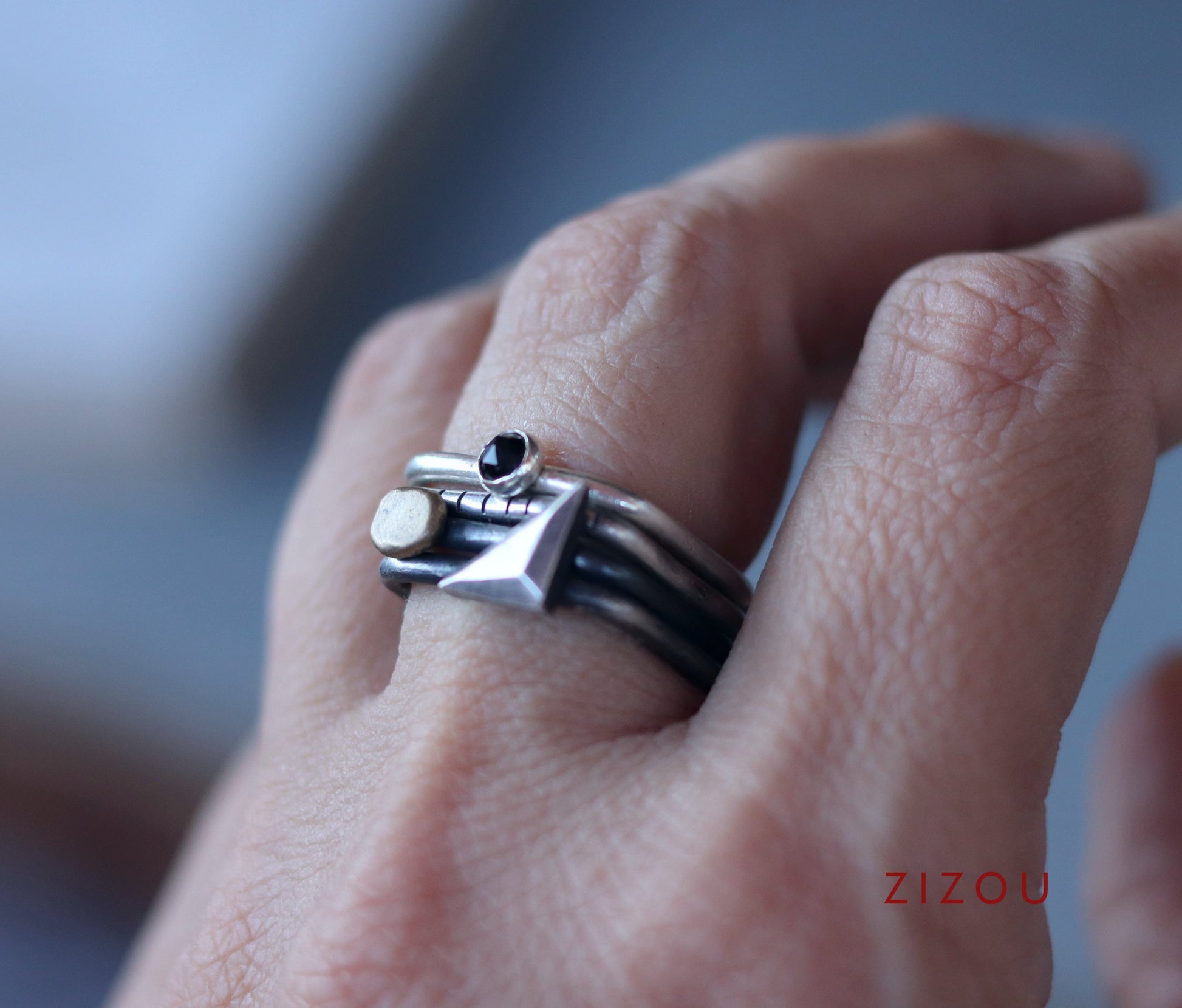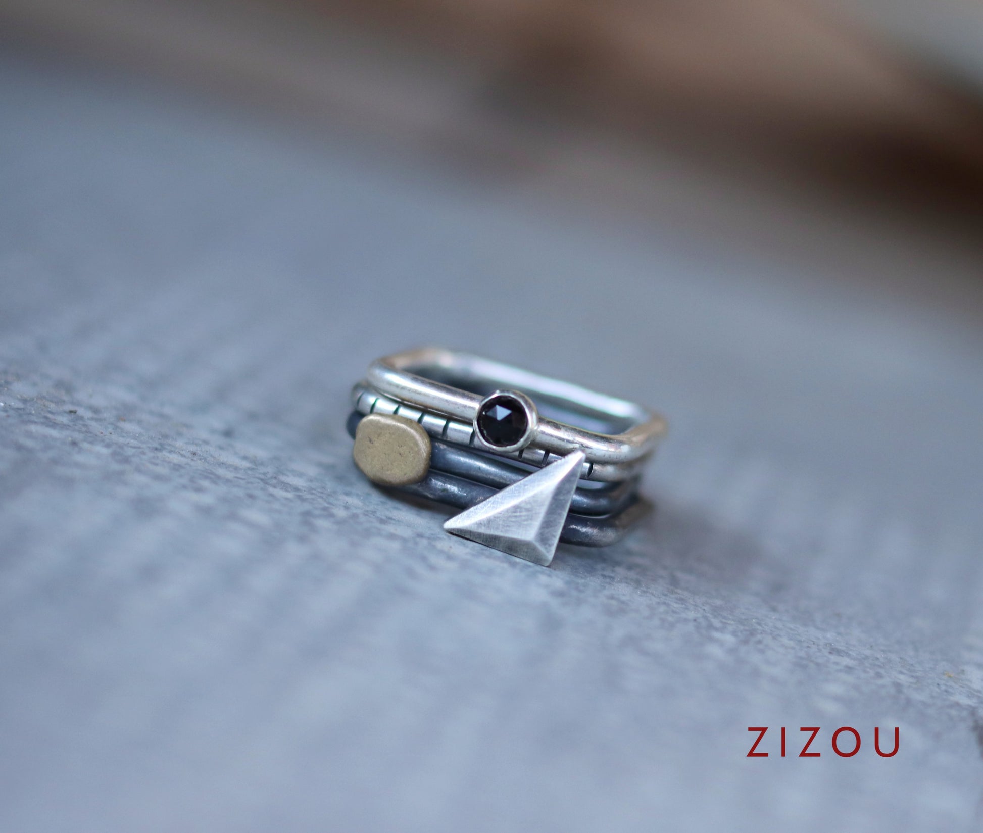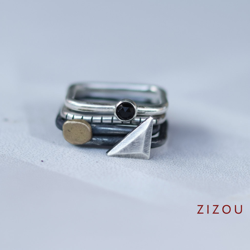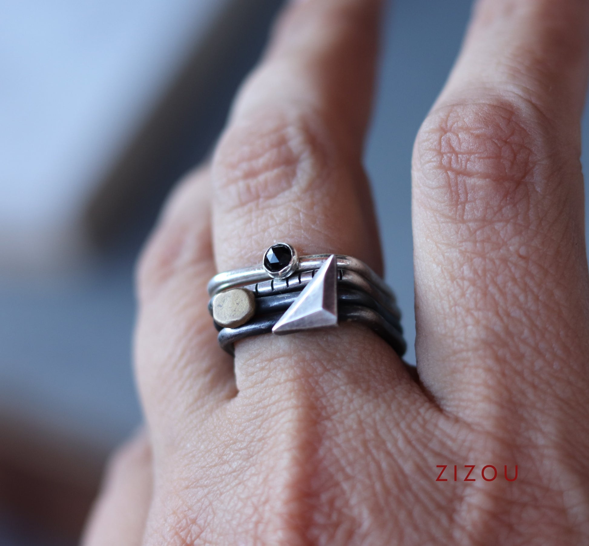Set kojeg čine 4 jedinstvena prstena, od kojih svaki prsten možete nositi zasebno ili kombinirati po želji. Dva su prstena patinirana, a dva imaju srebreni matirani finish. Kamen je crni spinel a jedna točkica prsten je izrađen od mjedi.. Budući da je nakit ručno izrađen, nije identičan prikazanom na fotografiji, već vrlo sličan. Prstenje s nošenjem postaje svjetlije i sjajnije.