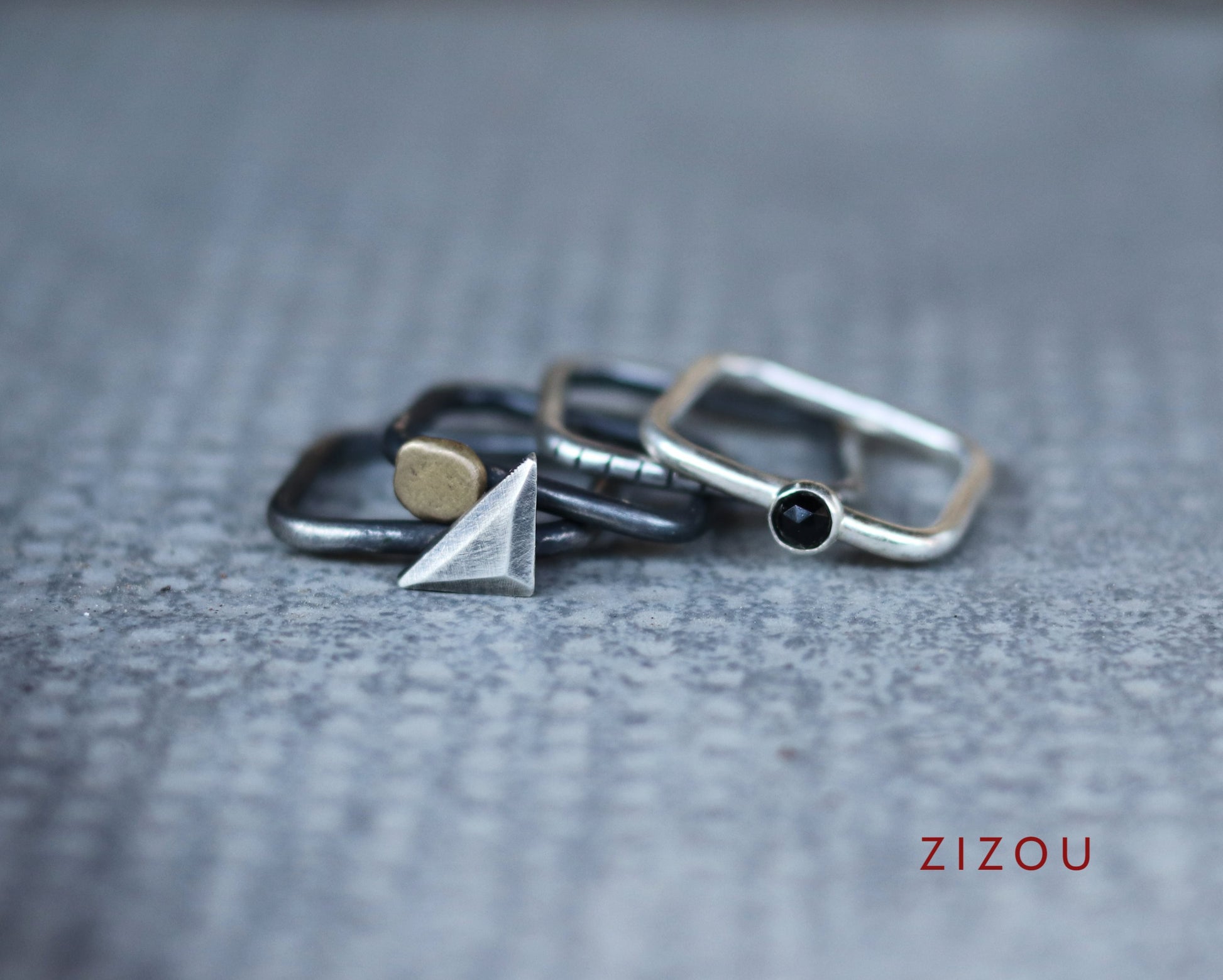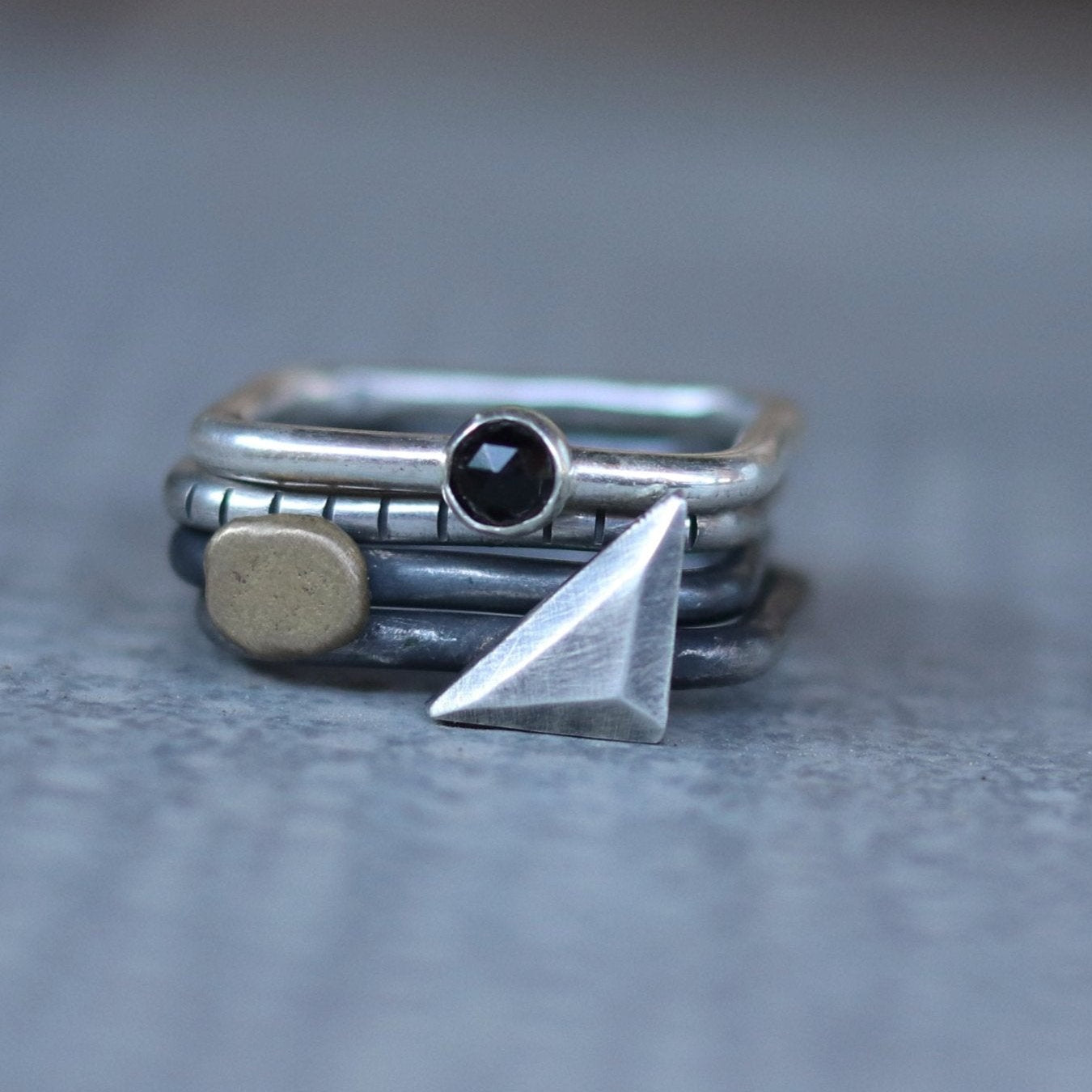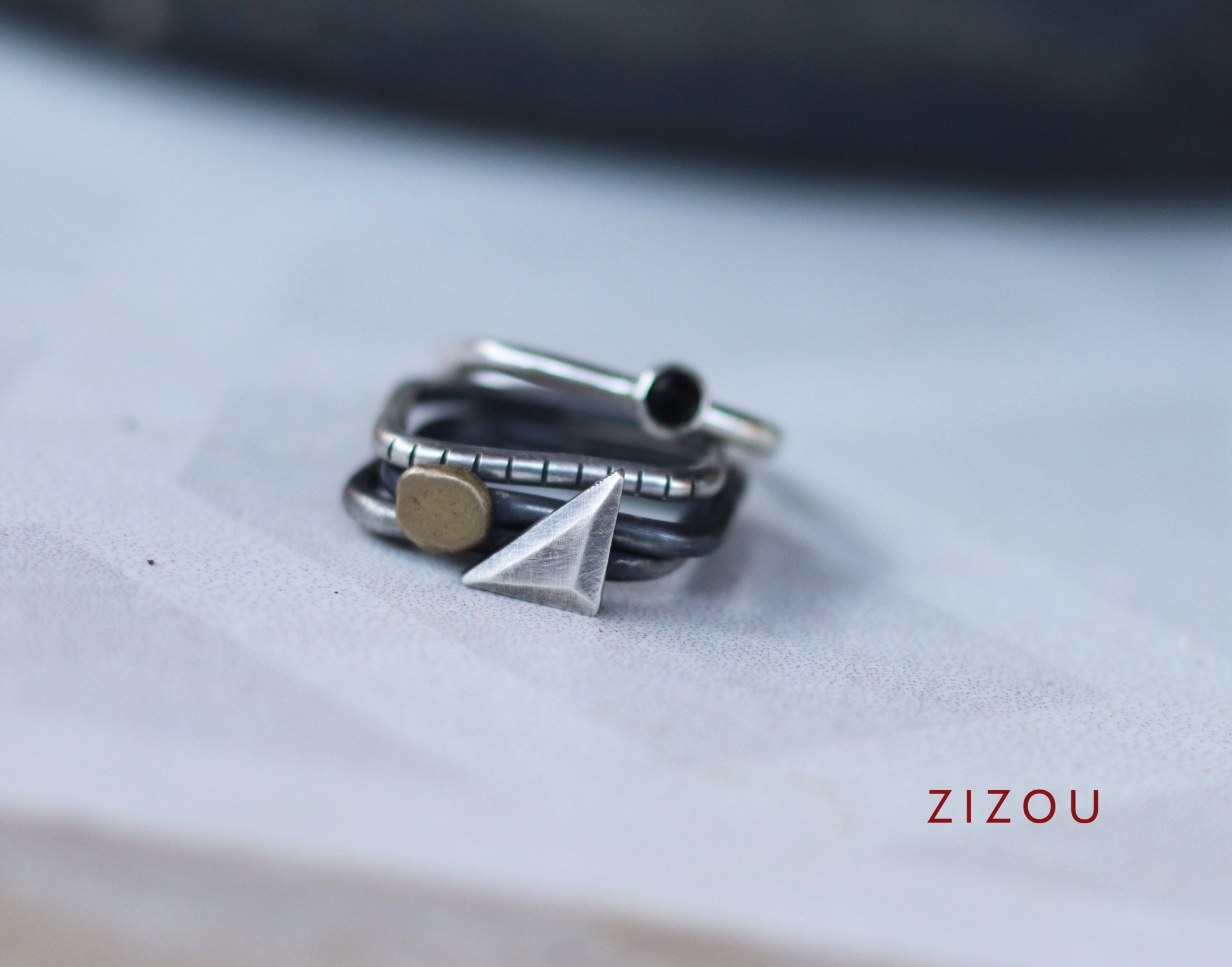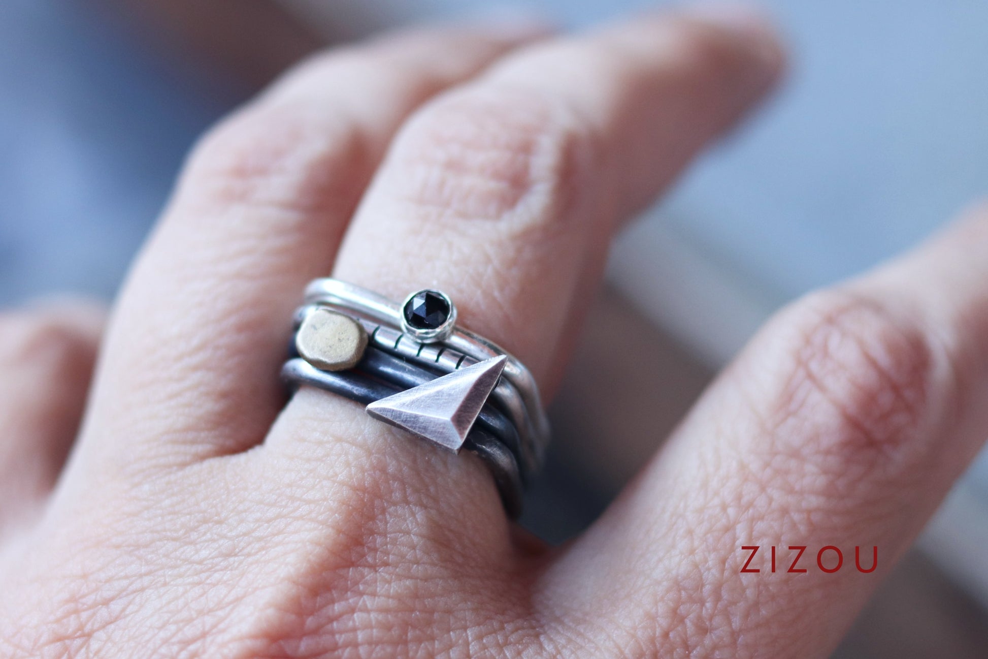 Set kojeg čine 4 jedinstvena prstena, od kojih svaki prsten možete nositi zasebno ili kombinirati po želji. Dva su prstena patinirana, a dva imaju srebreni matirani finish. Kamen je crni spinel a jedna točkica prsten je izrađen od mjedi.. Budući da je nakit ručno izrađen, nije identičan prikazanom na fotografiji, već vrlo sličan. Prstenje s nošenjem postaje svjetlije i sjajnije.