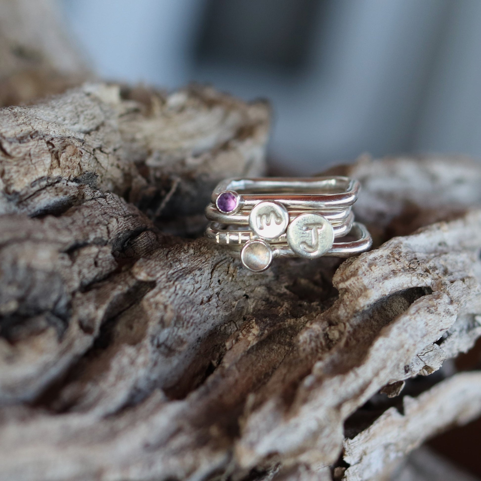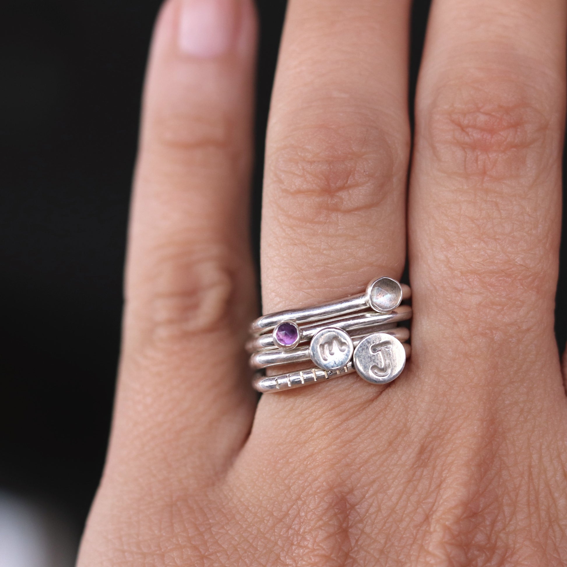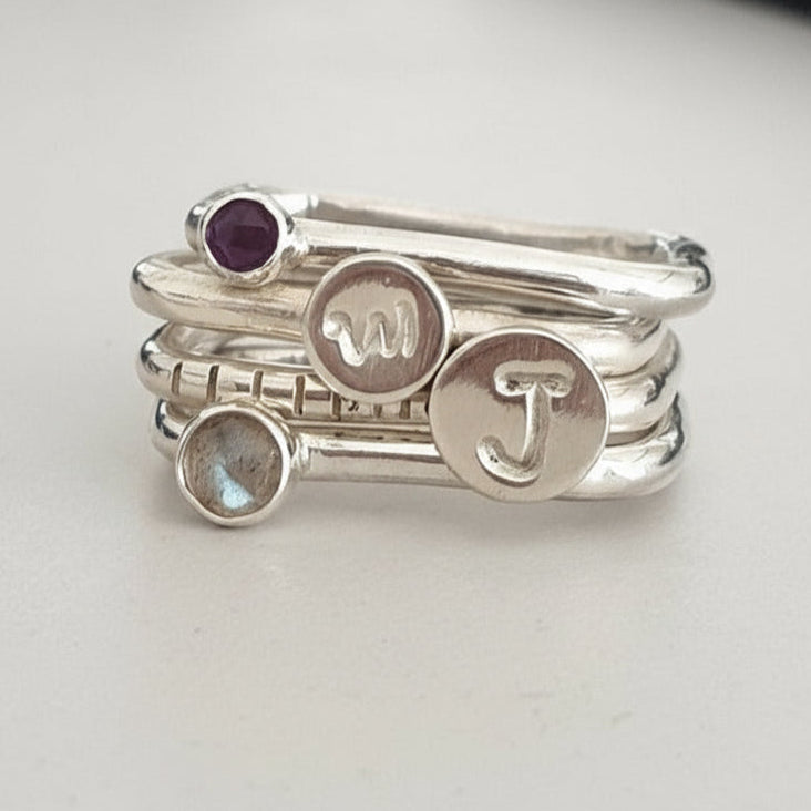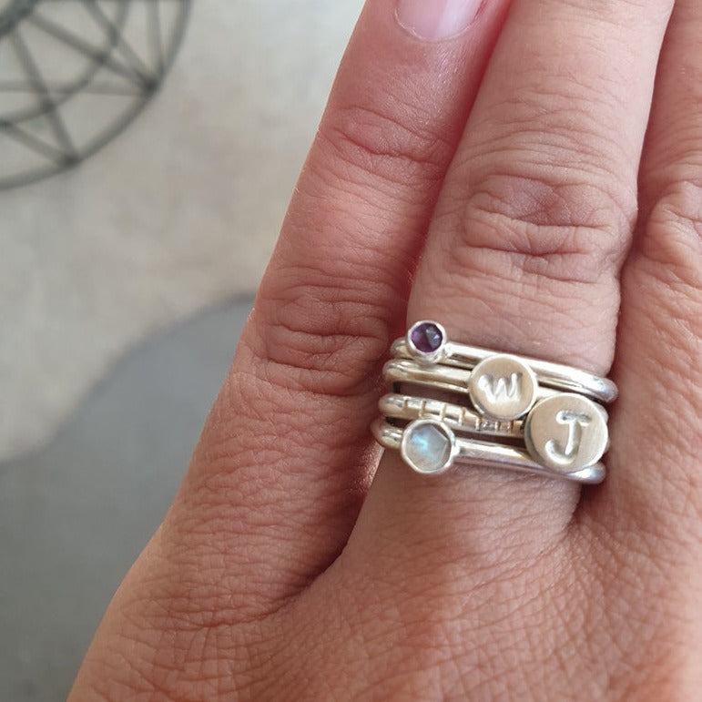 4U1 personal square je set kojeg čine 4 jedinstvena prstena, od kojih svaki prsten možete nositi zasebno ili kombinirati po želji. Dva su prstena patinirana, a dva imaju srebrni sjajni finish. Kamen je labradorit i ametist. Prsten se može personalizirati s jednim ili dva inicijala ili odabirom kamena. Imajte na umu da su količine poludragih kamenja ograničene, te u koliko trenutno nemam na zalihi kontaktirati ću vas za odabir nekog drugog. Prstenje s nošenjem postaje svjetlije i sjajnije. Budući da je nakit ručno izrađen, nije identičan prikazanom na fotografiji, već vrlo sličan.