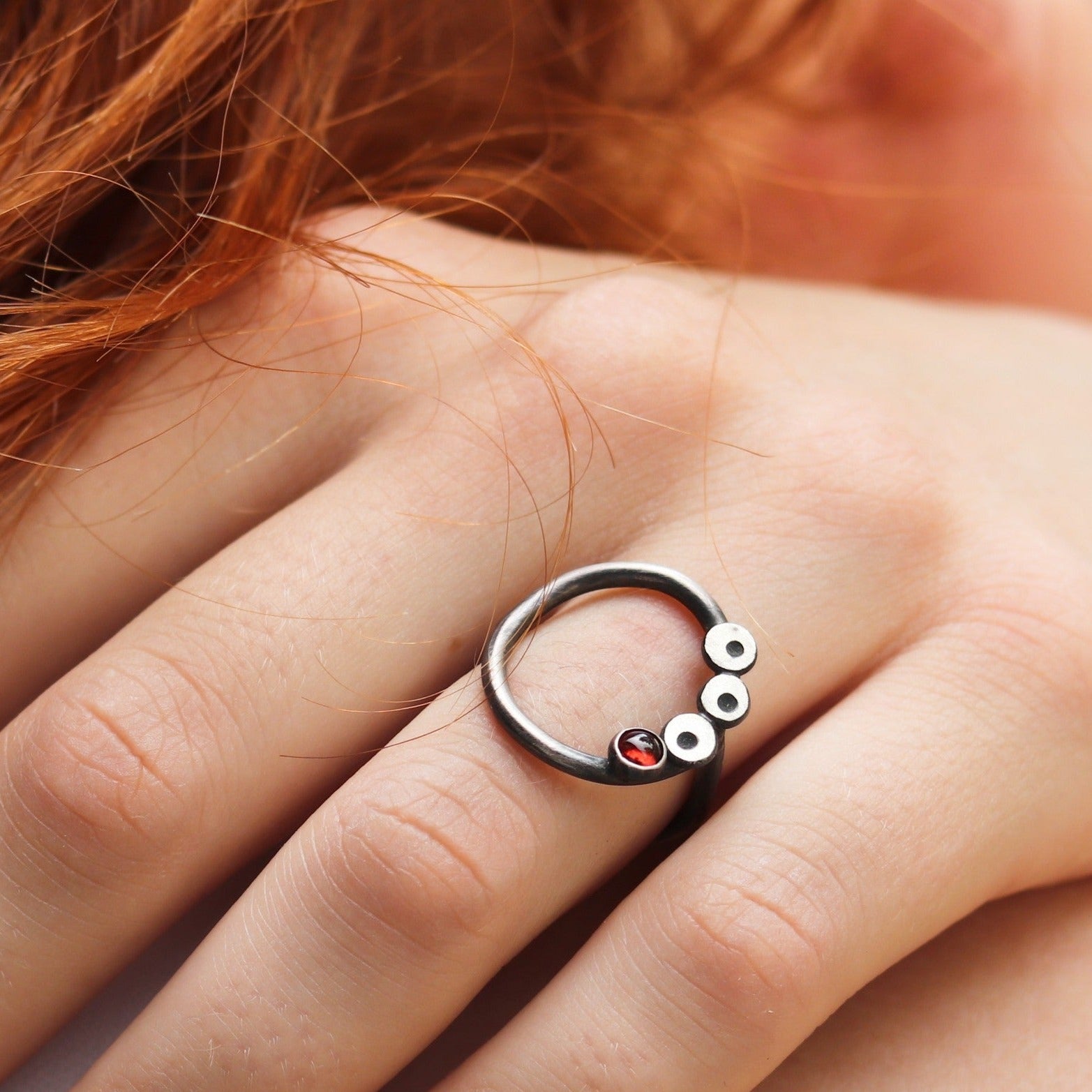 BuBBle granat je jednostavan prsten izrađen od recikliranog srebra, obogaćen magičnim kamenom Granatom. Budući da je prsten ručno izrađen, nije identičan prikazanom na fotografiji, već vrlo sličan. Prsten je dodatno patiniran te s nošenjem postaje svjetliji i sjajniji.
