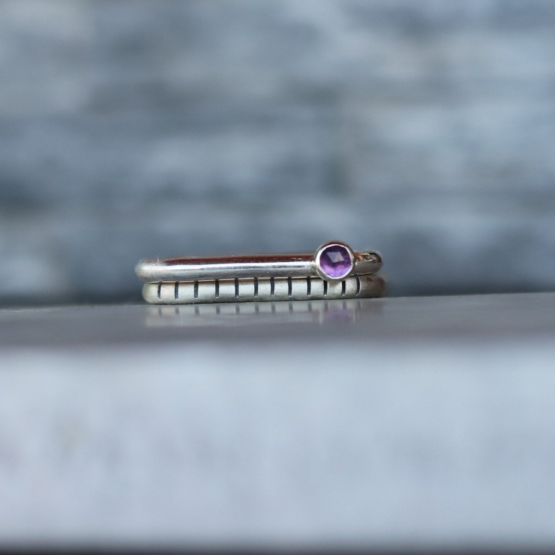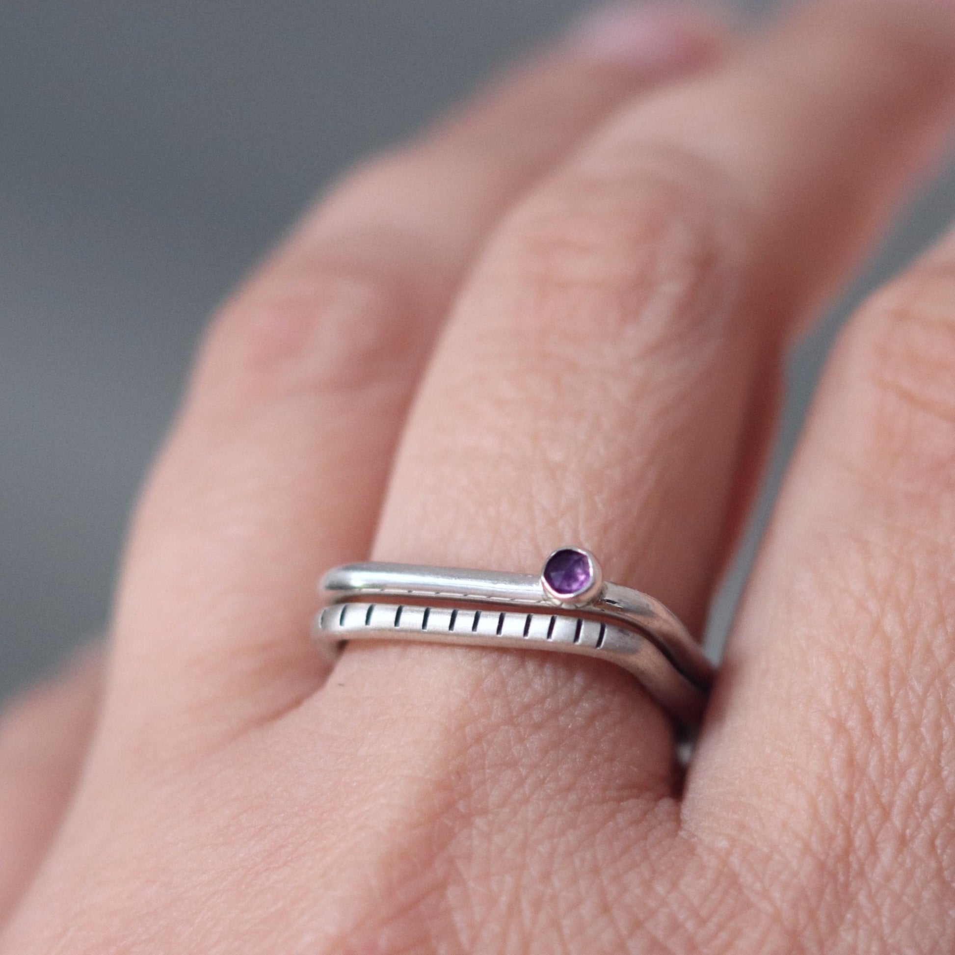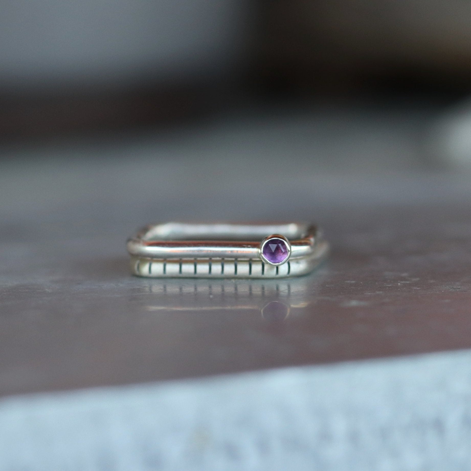 2U1 ametist square čine 2 prstena izrađena od recikliranog srebra, jedan nazubljen i patiniran prsten, a drugi krasi Ljubičasti ametist. S nošenjem postaje svjetlije i sjajnije. Budući da je nakit ručno izrađen, nije identičan prikazanom na fotografiji, već vrlo sličan.