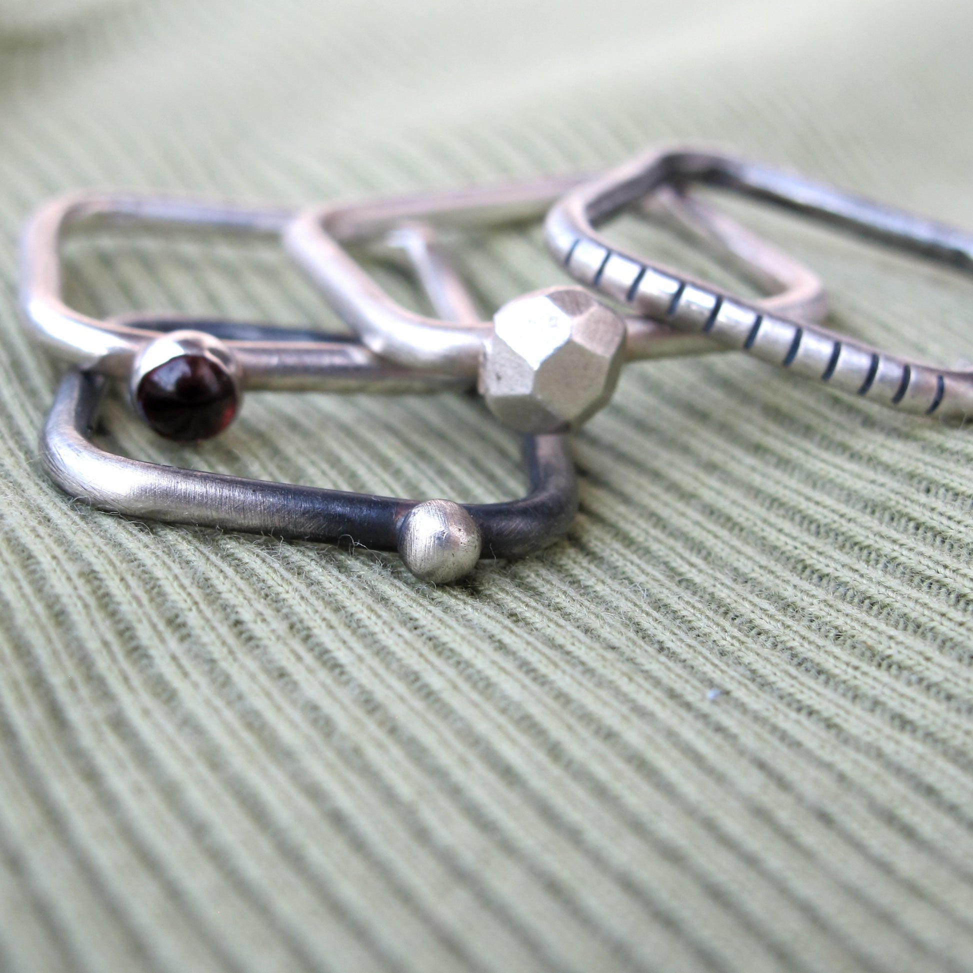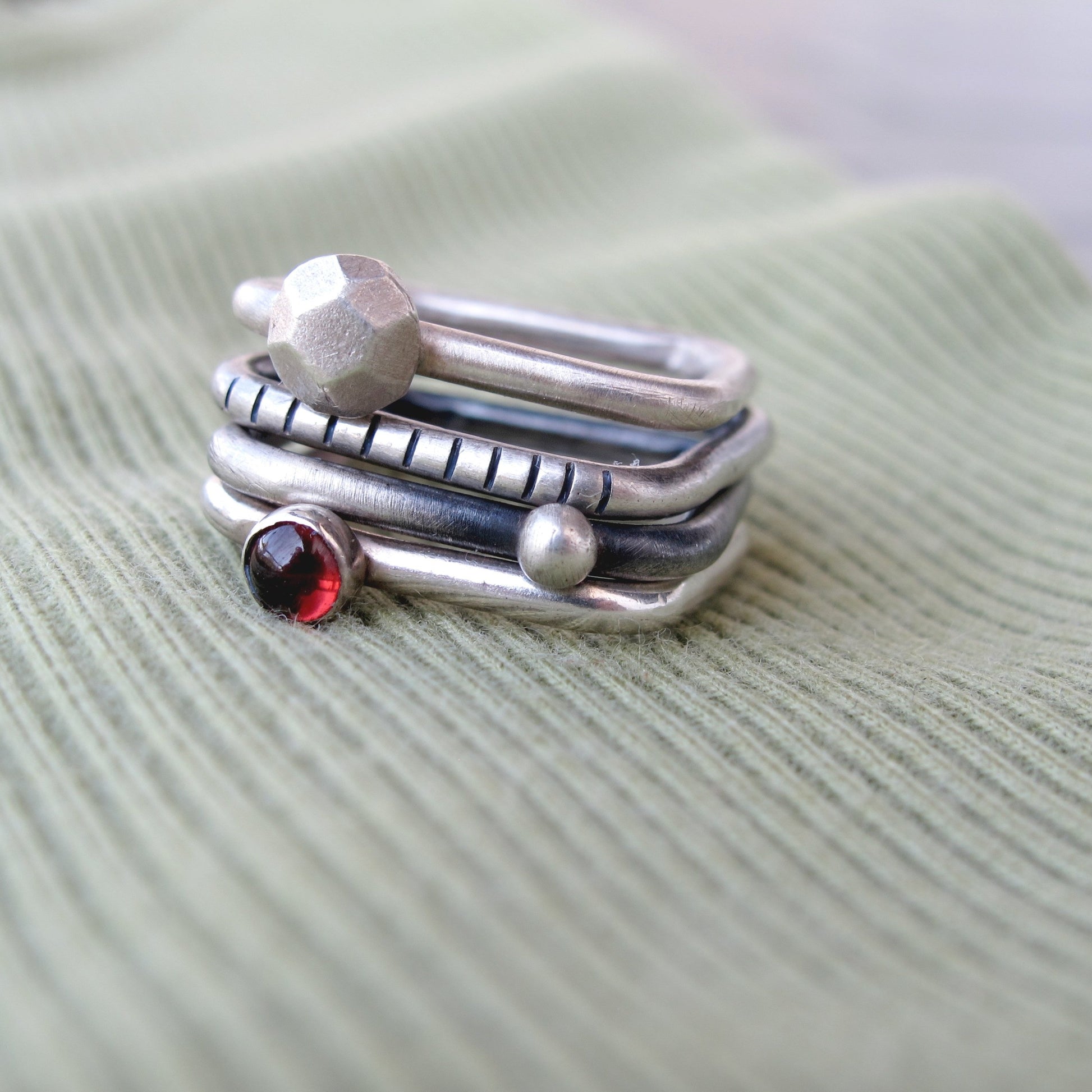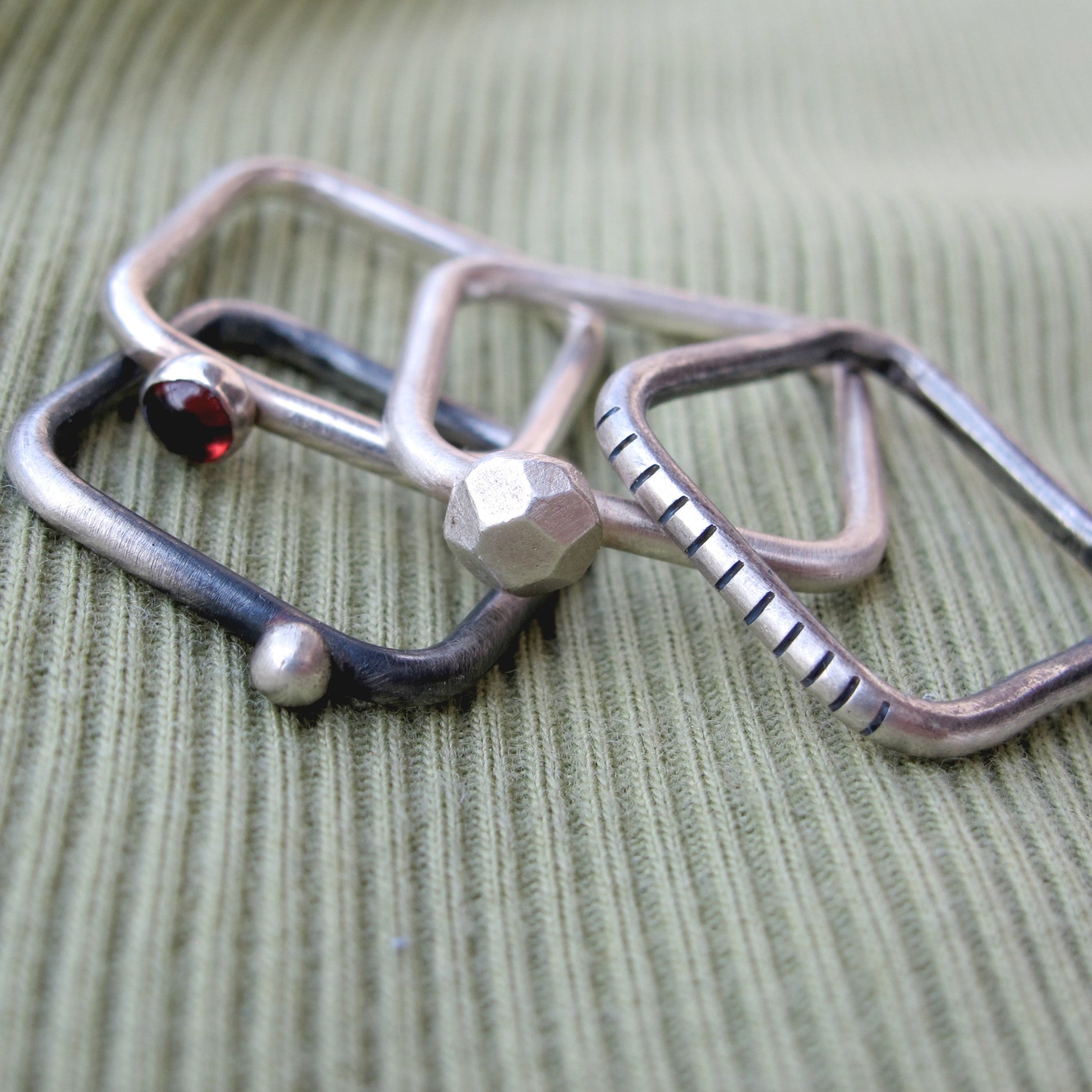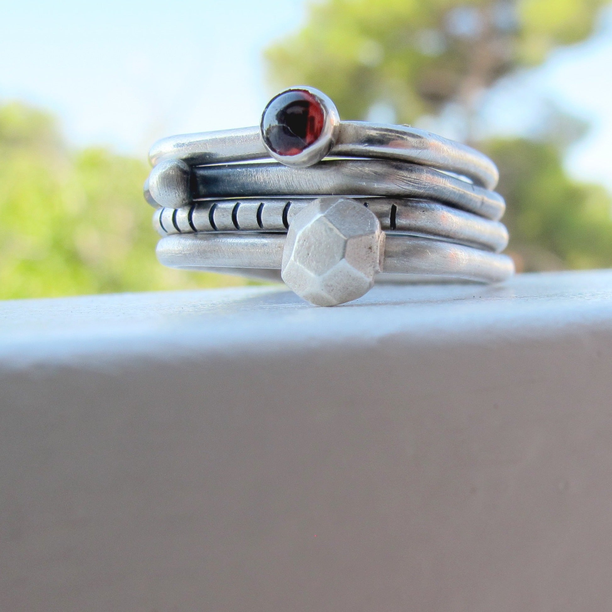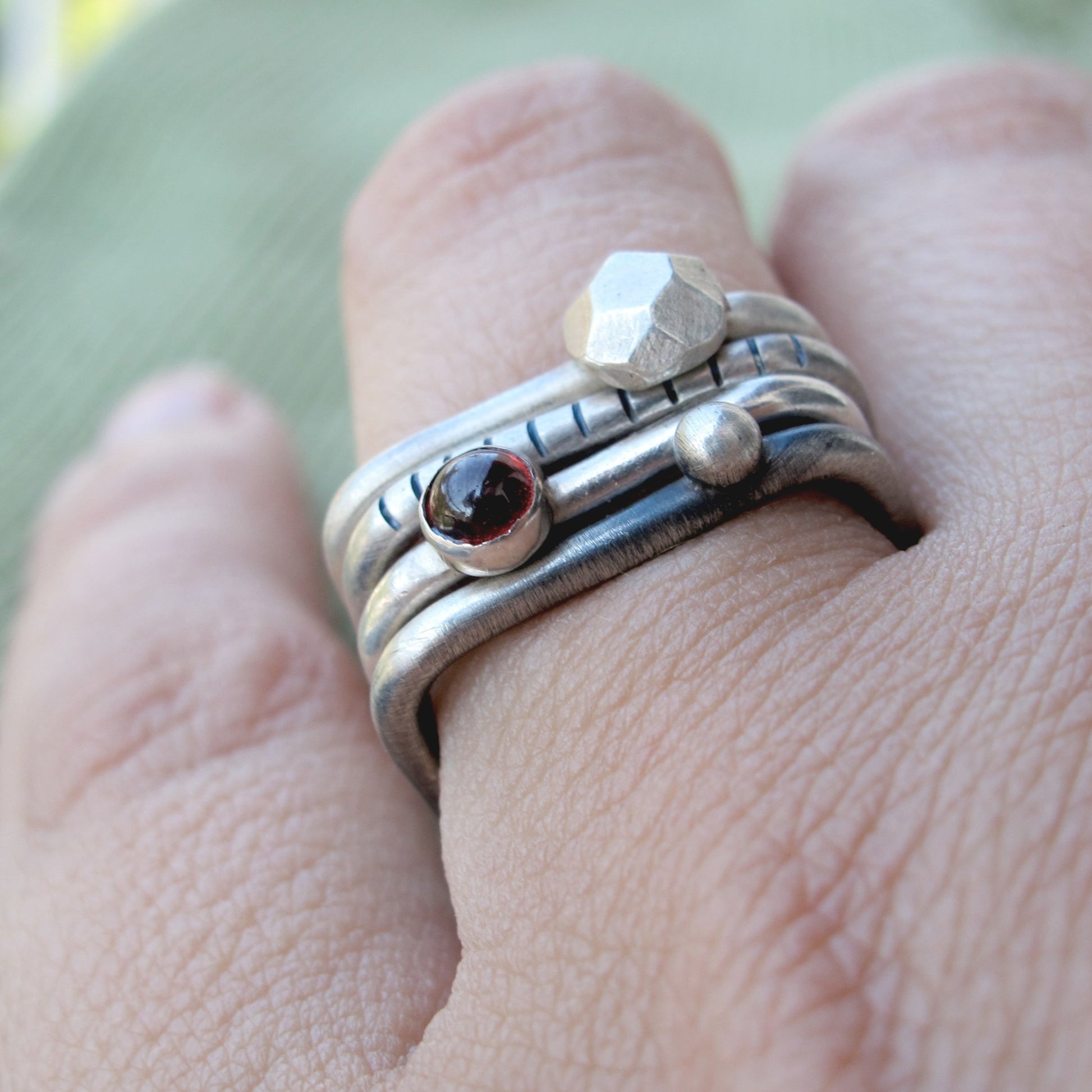 4U1 granat II square je set kojeg čine 4 jedinstvena prstena, od kojih svaki prsten možete nositi zasebno ili kombinirati po želji. Dva su prstena patinirana, a dva imaju srebreni matirani finish. Kamen je tamno crveni granat. Prstenje s nošenjem postaje svjetlije i sjajnije. Budući da je nakit ručno izrađen, nije identičan prikazanom na fotografiji, već vrlo sličan.