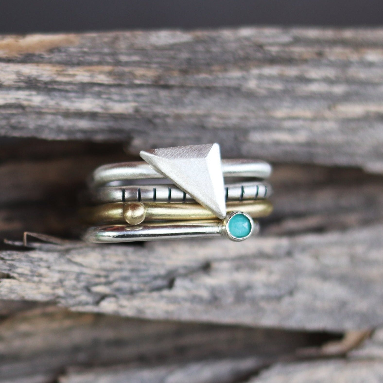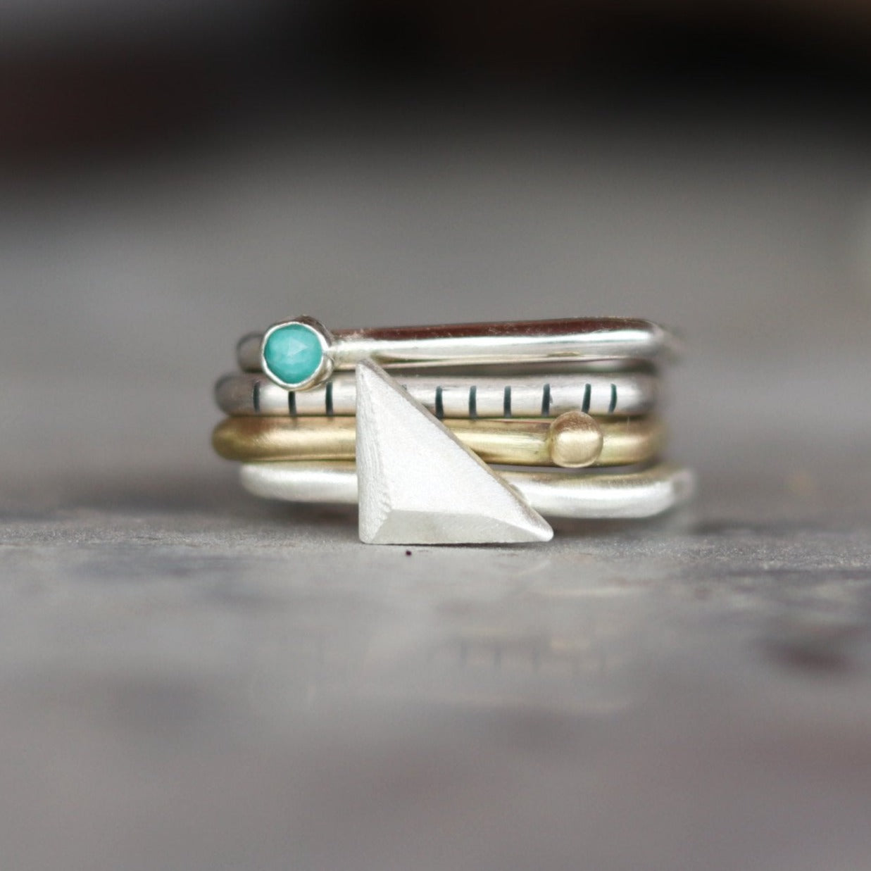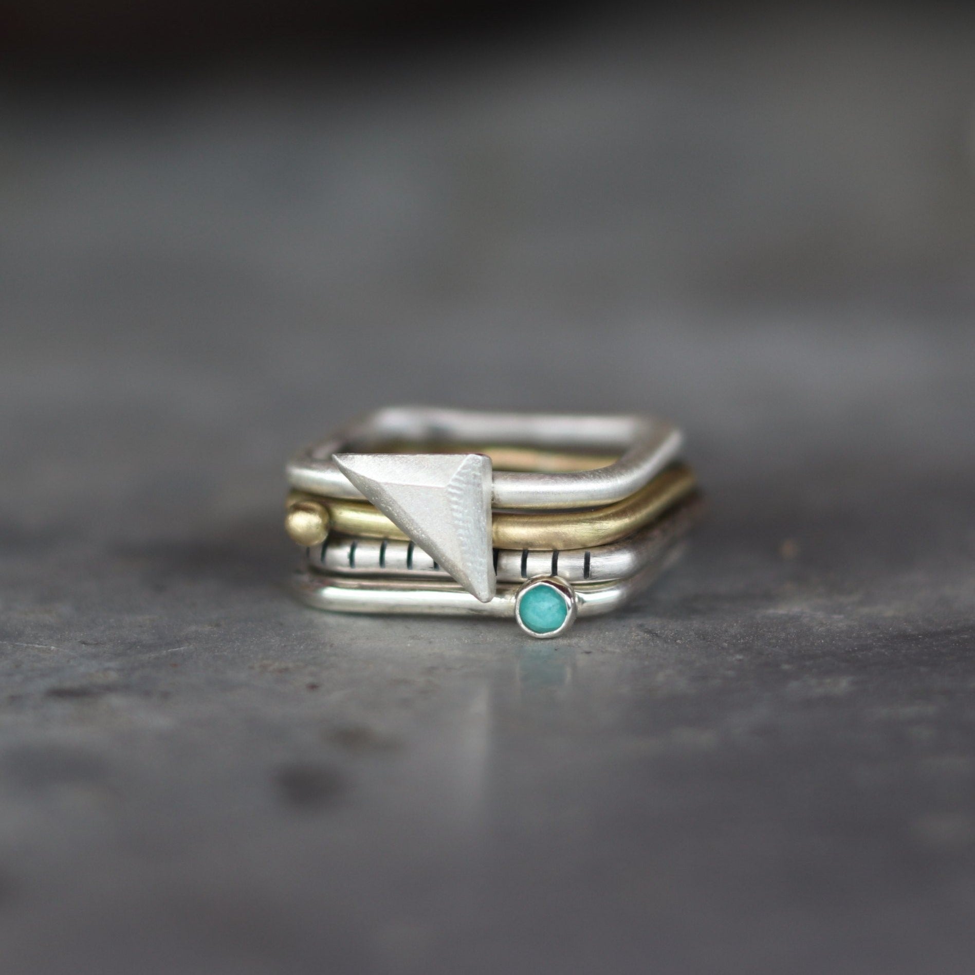 Set kojeg čine 4 jedinstvena prstena, od kojih svaki prsten možete nositi zasebno ili kombinirati po želji. Dva su prstena patinirana, a dva imaju srebreni matirani finish. Kamen je amazonit a jedna prsten je izrađen od mjedi.. Budući da je nakit ručno izrađen, nije identičan prikazanom na fotografiji, već vrlo sličan. Prstenje s nošenjem postaje svjetlije i sjajnije.