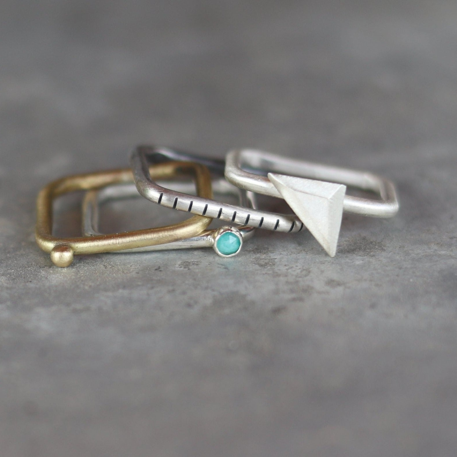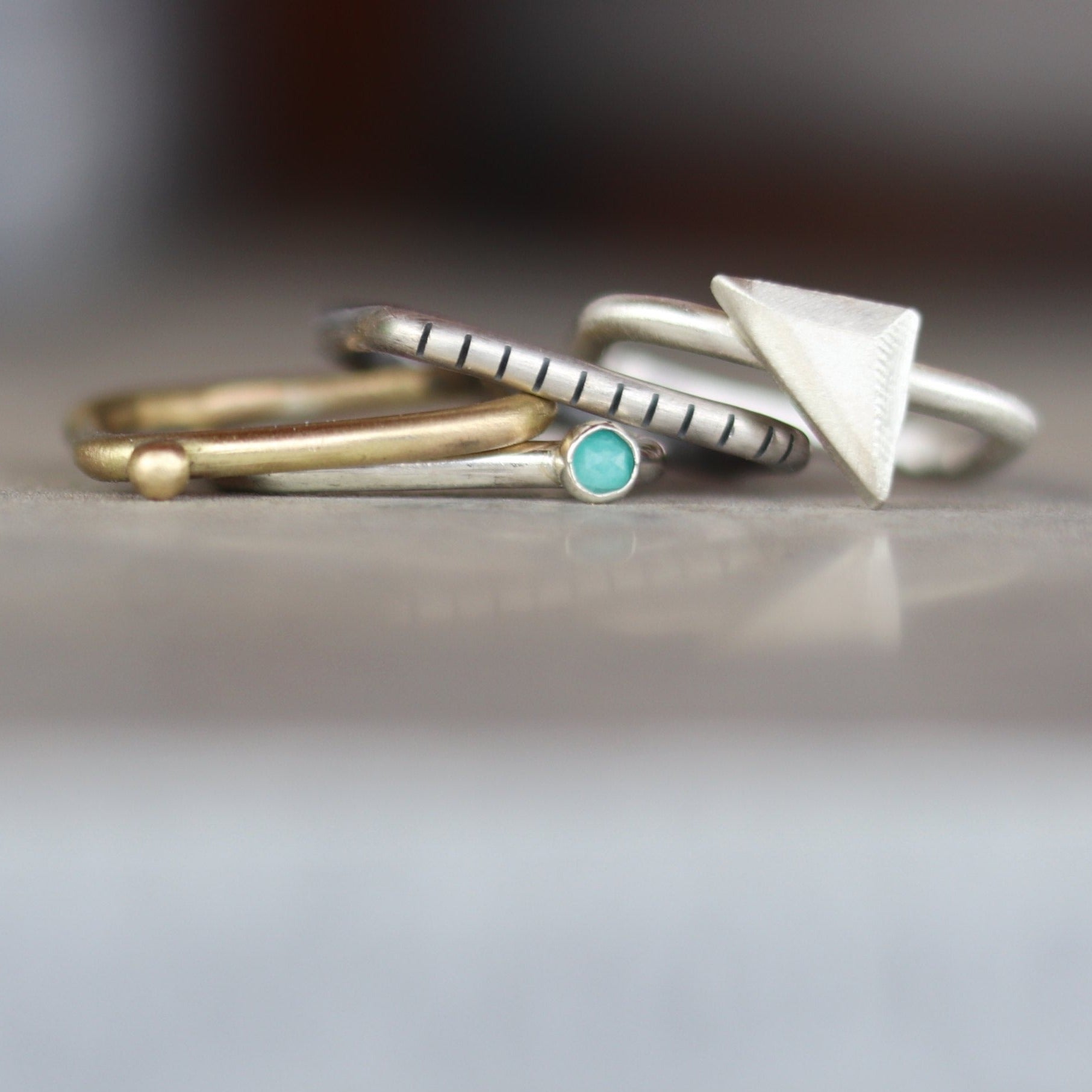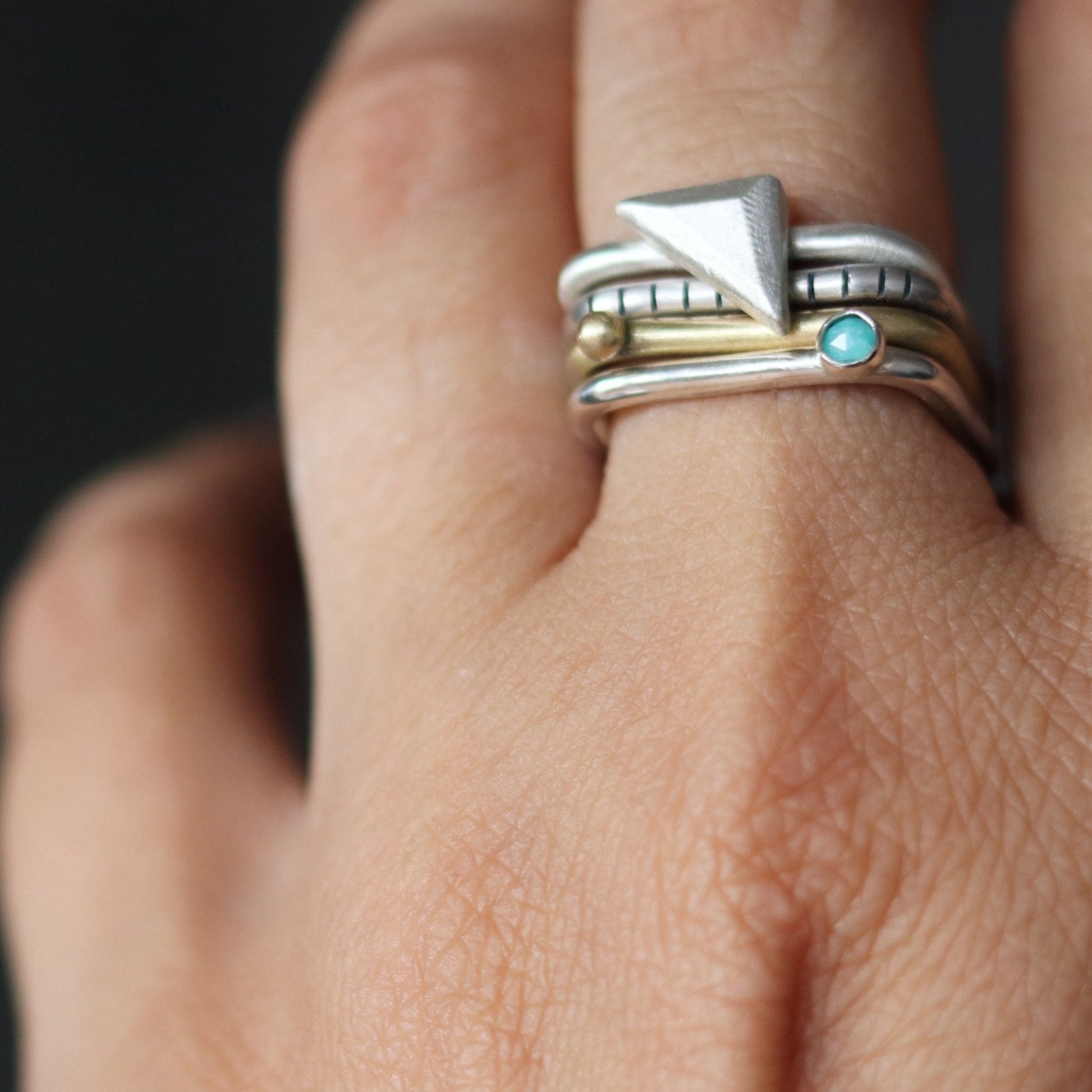 Set kojeg čine 4 jedinstvena prstena, od kojih svaki prsten možete nositi zasebno ili kombinirati po želji. Dva su prstena patinirana, a dva imaju srebreni matirani finish. Kamen je amazonit a jedna prsten je izrađen od mjedi.. Budući da je nakit ručno izrađen, nije identičan prikazanom na fotografiji, već vrlo sličan. Prstenje s nošenjem postaje svjetlije i sjajnije.