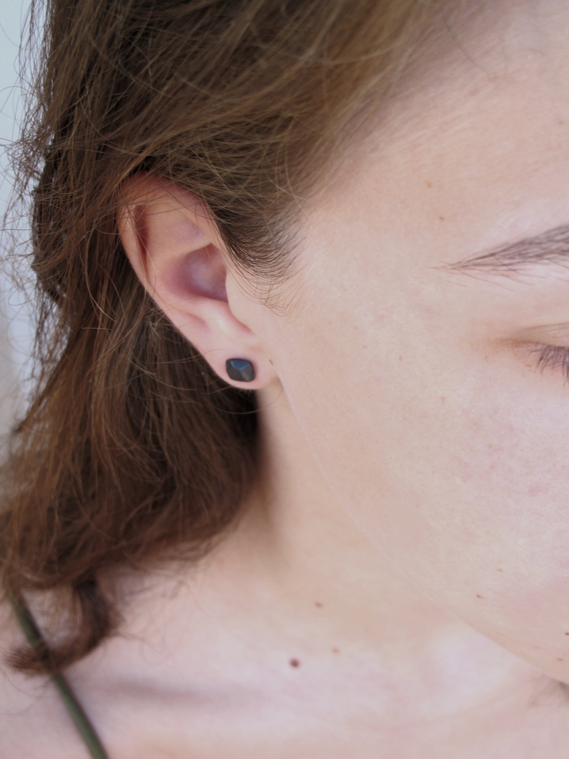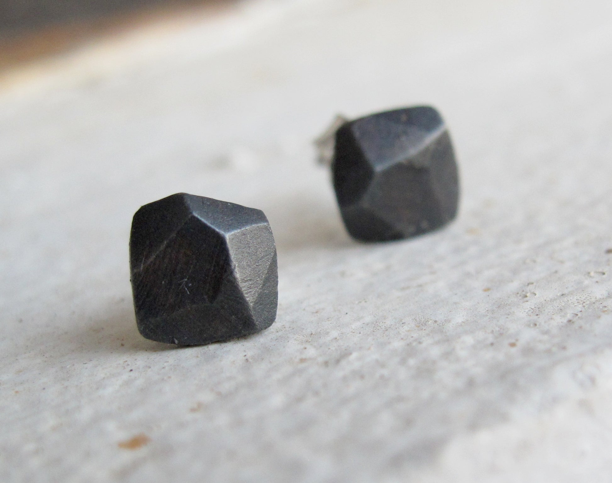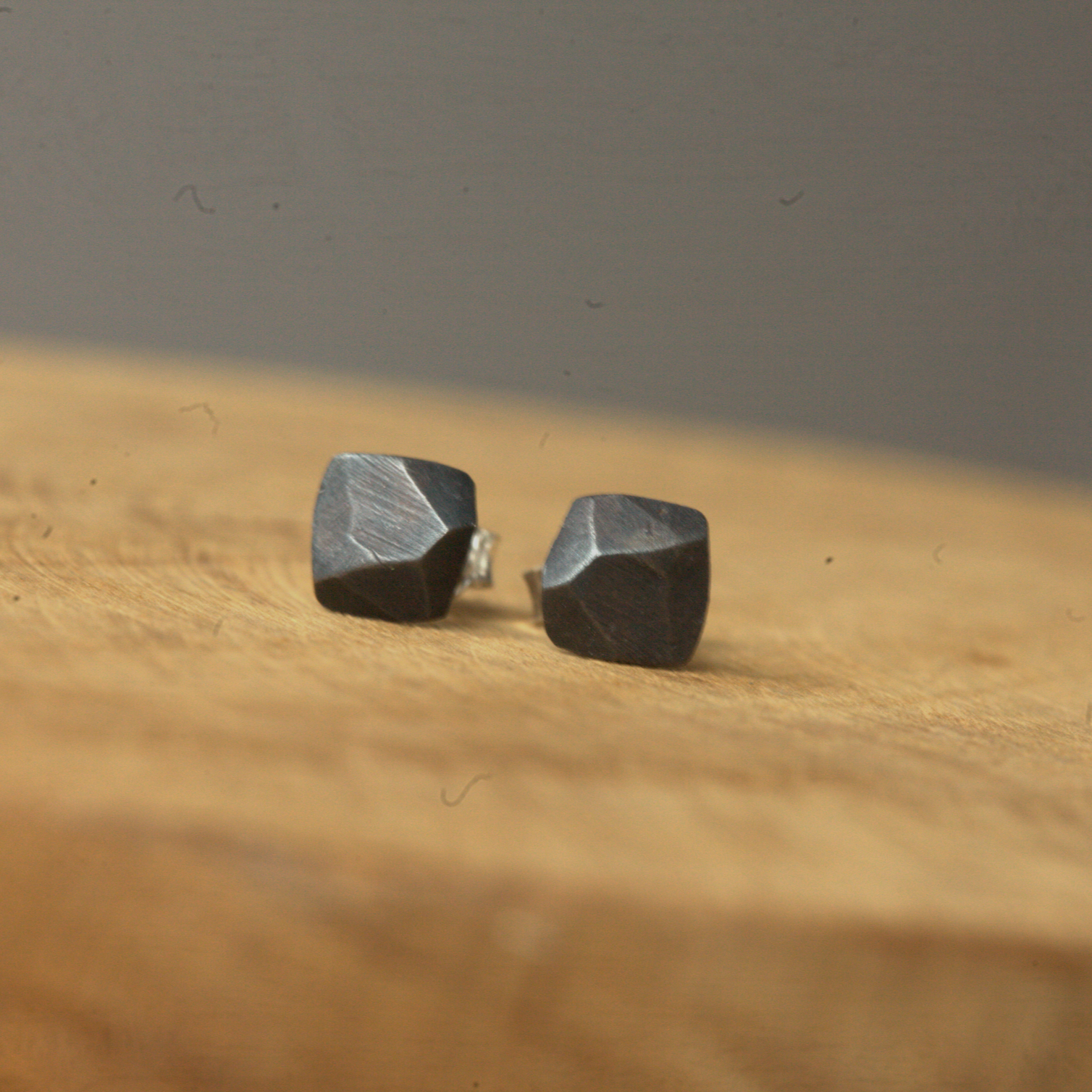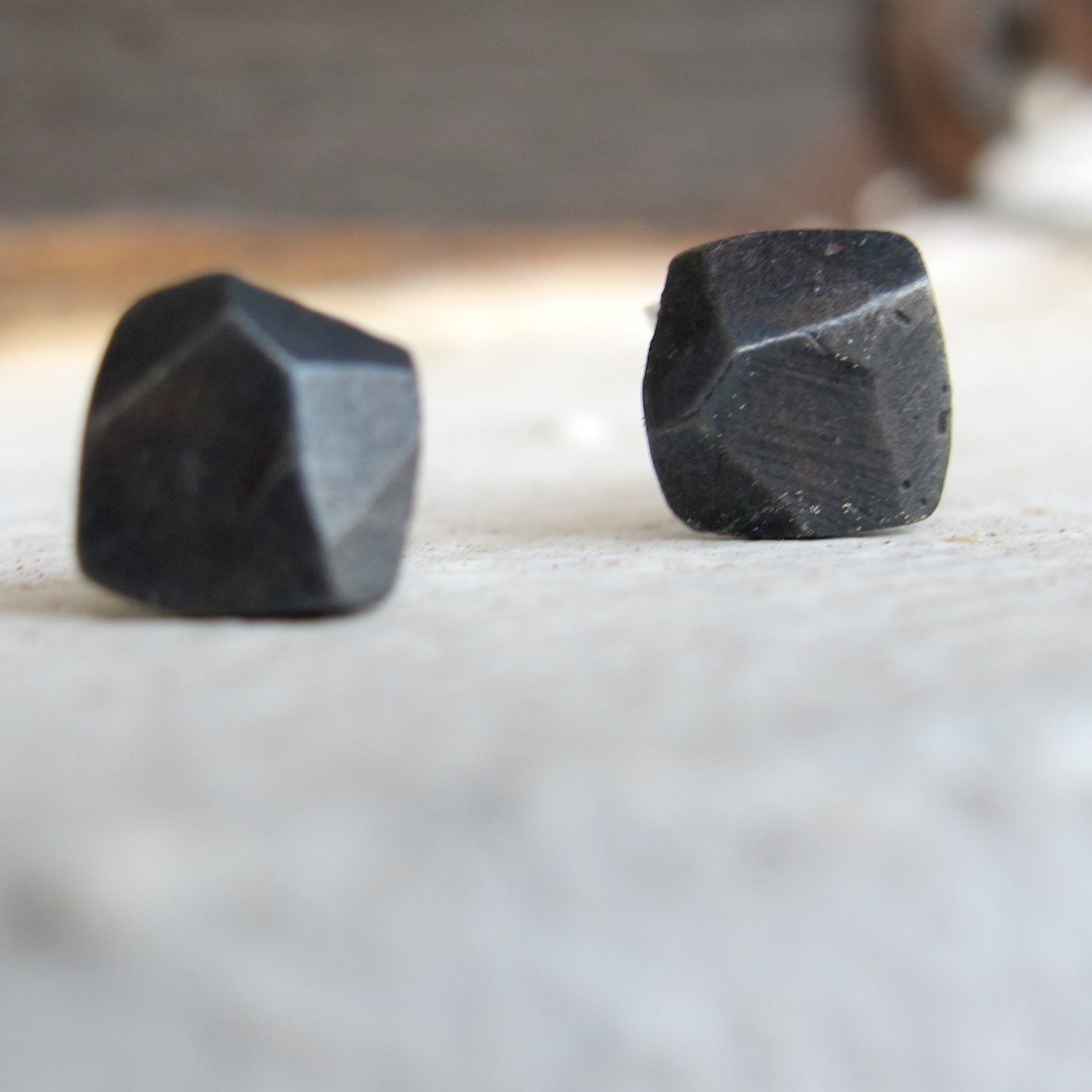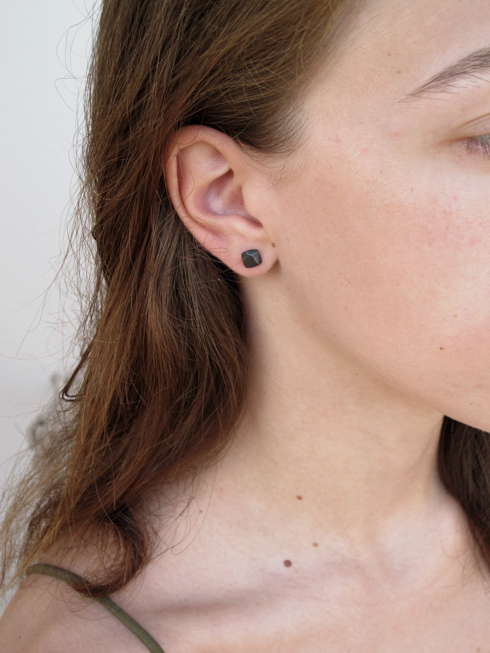 Jednostavne trodimenzionalne naušnice Stones M Black izrađene su od recikliranog srebra, patinirane u crno. Patina se s nošenjem skida i postaje svjetlija / sivlja po rubovima. Naušnice su dimenzija 7 mm x 6 mm cca. Budući da je nakit ručno izrađen, nije identičan prikazanom na fotografiji, već vrlo sličan.