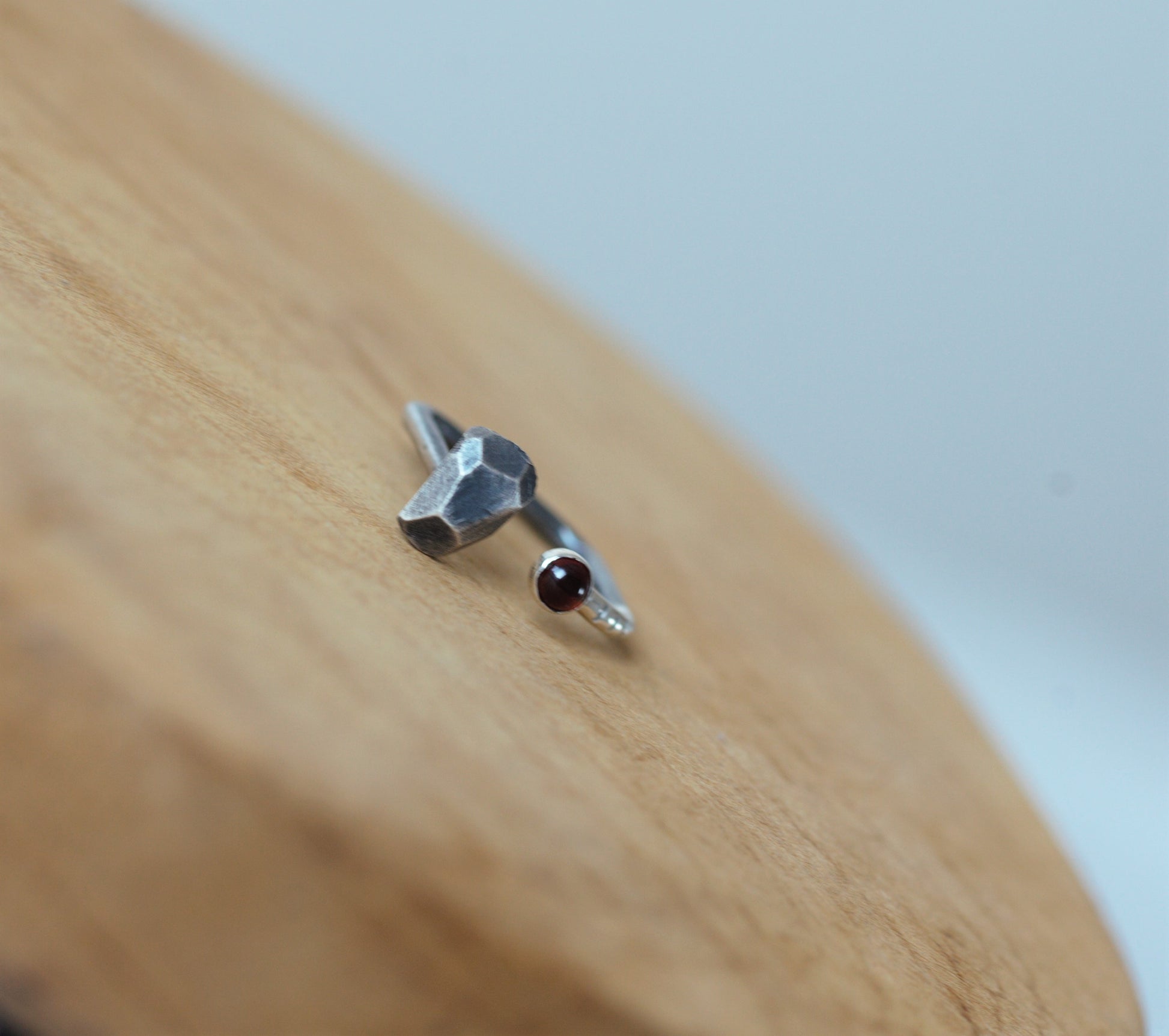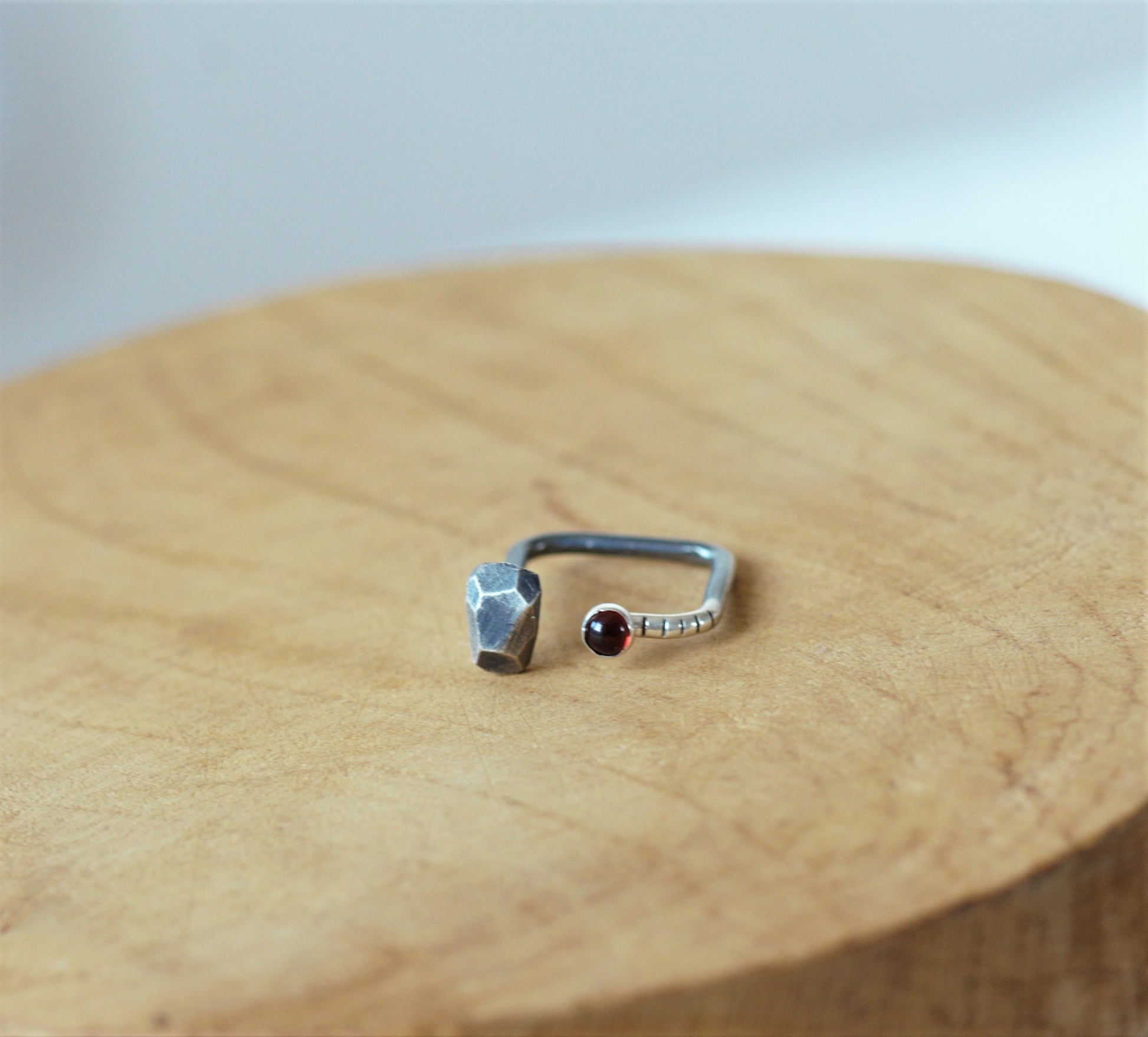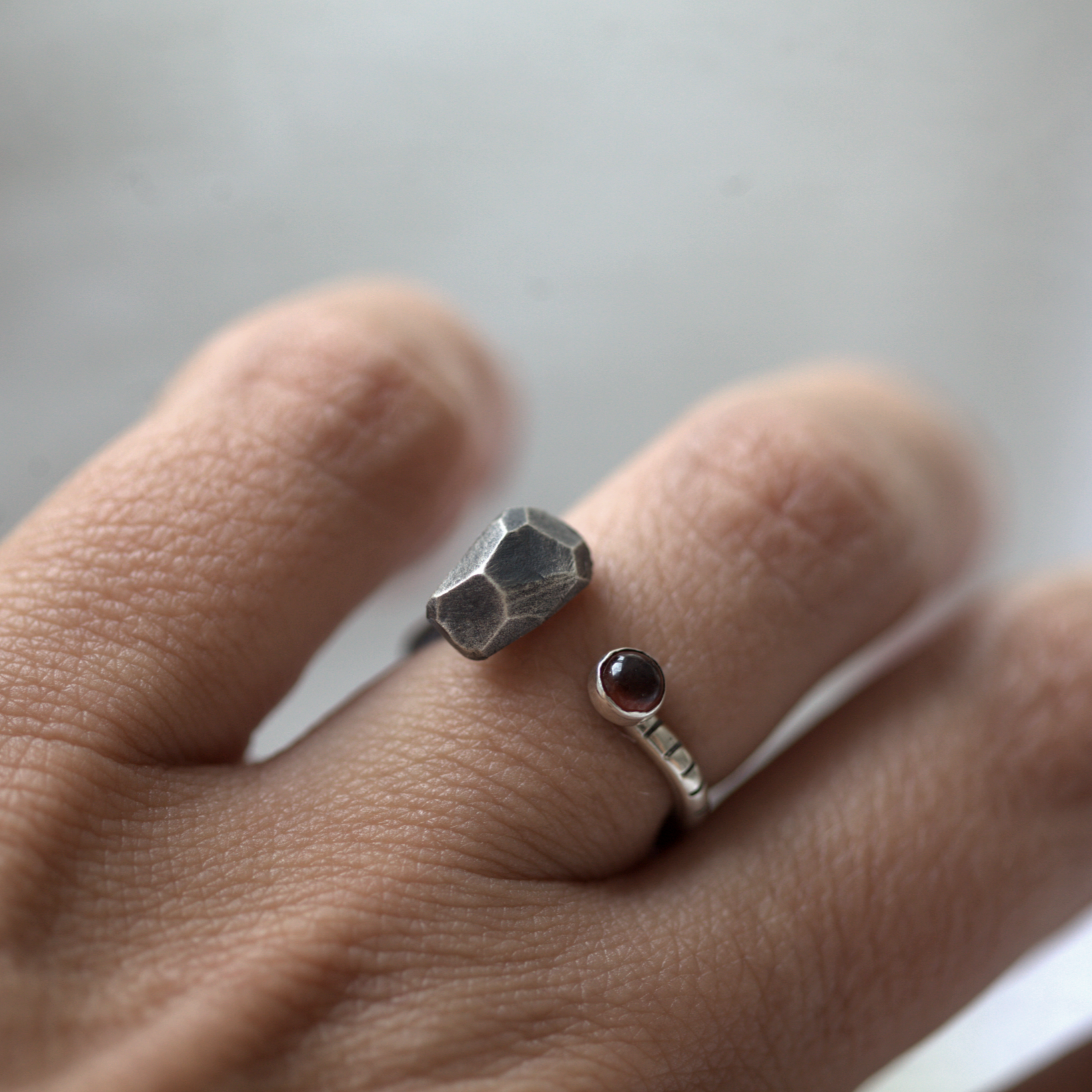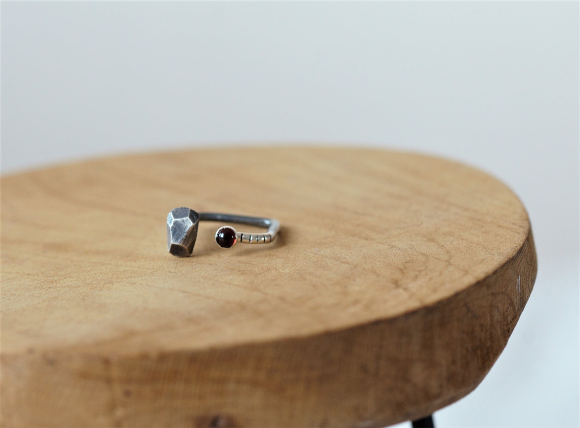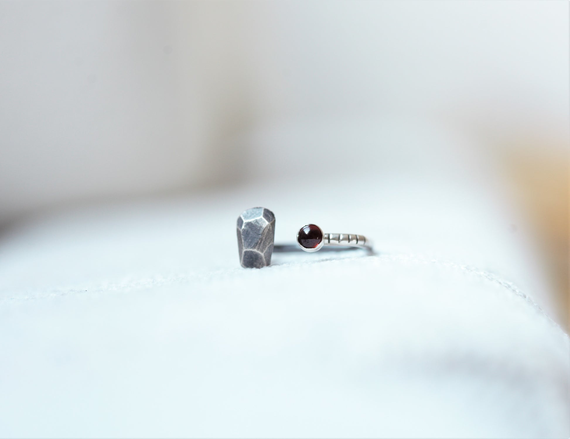 Četvrtasti prsten Stripes & Stones granat izrađen je od recikliranog srebra, te dodatno patiniran. Krasi ga tamno crveni kamen granat. Prstenje s nošenjem postaje svjetlije i sjajnije. Budući da je nakit ručno izrađen, nije identičan prikazanom na fotografiji, već vrlo sličan.