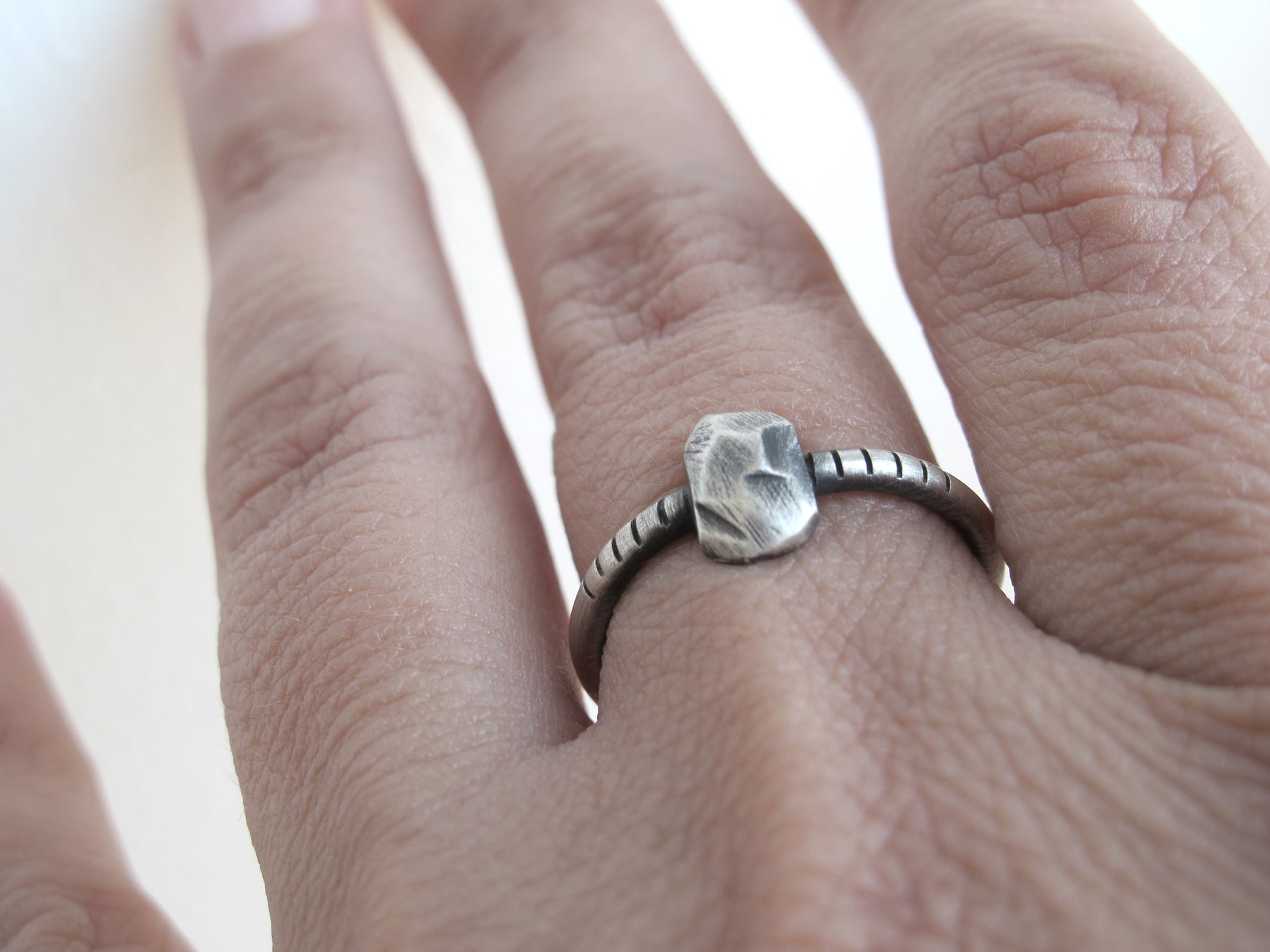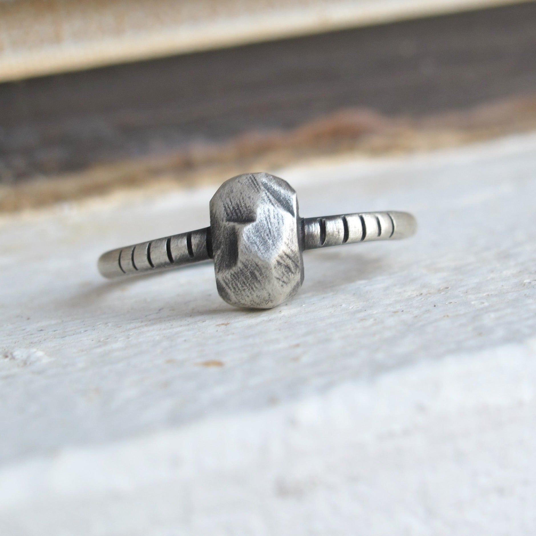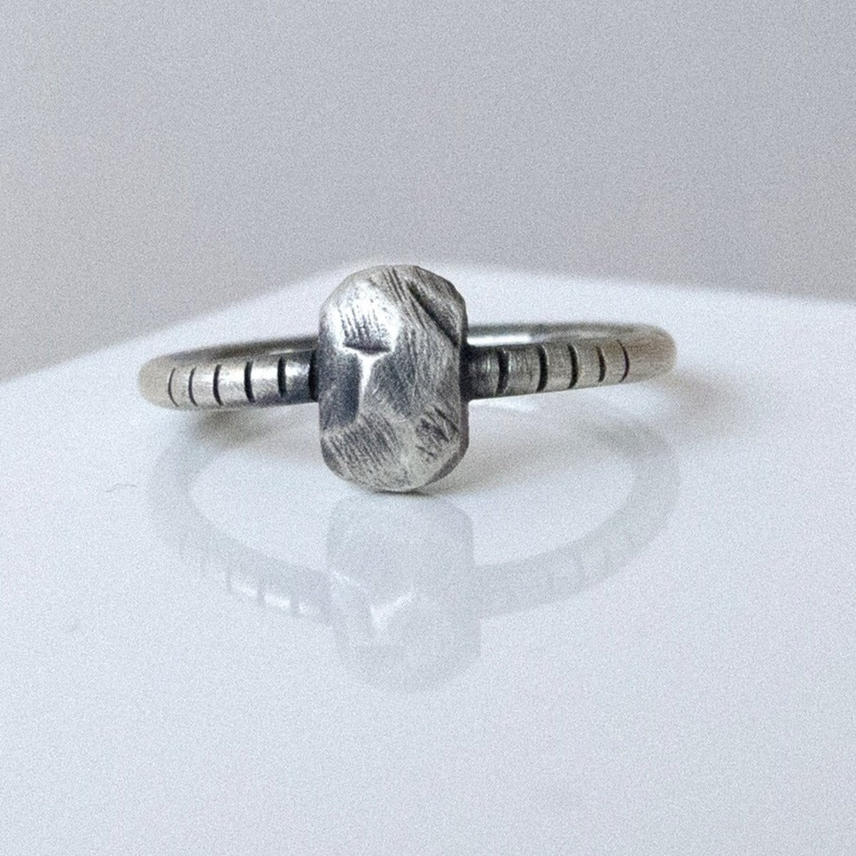 Prsten Stripes & Stones izrađen je od recikliranog srebra, te dodatno patiniran. Prstenje s nošenjem postaje svjetlije i sjajnije. Budući da je nakit ručno izrađen, nije identičan prikazanom na fotografiji, već vrlo sličan.