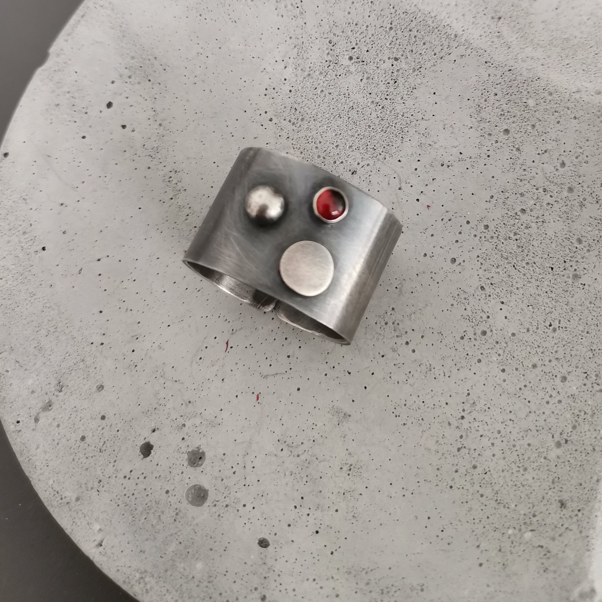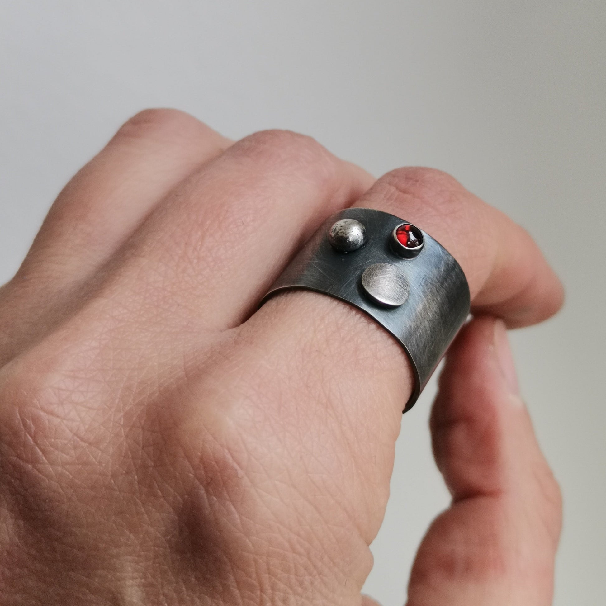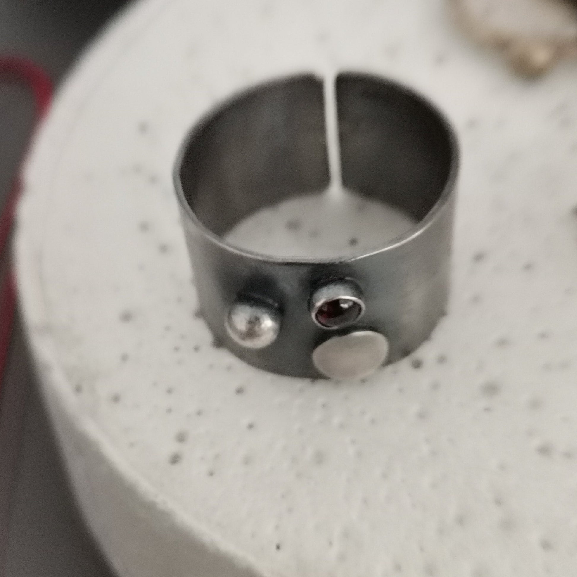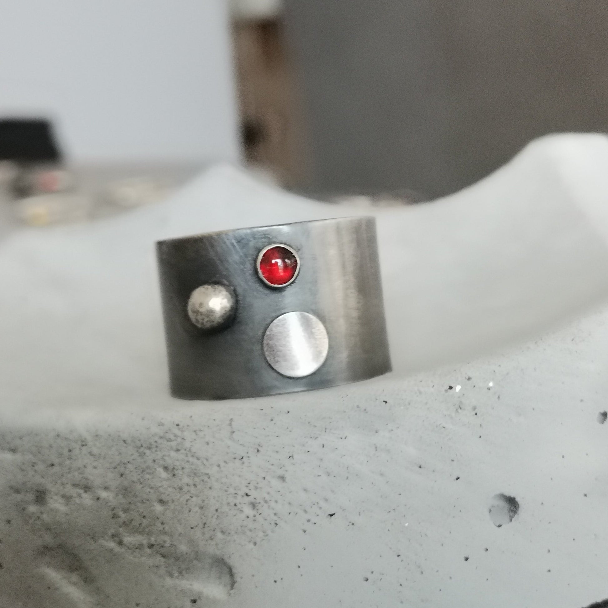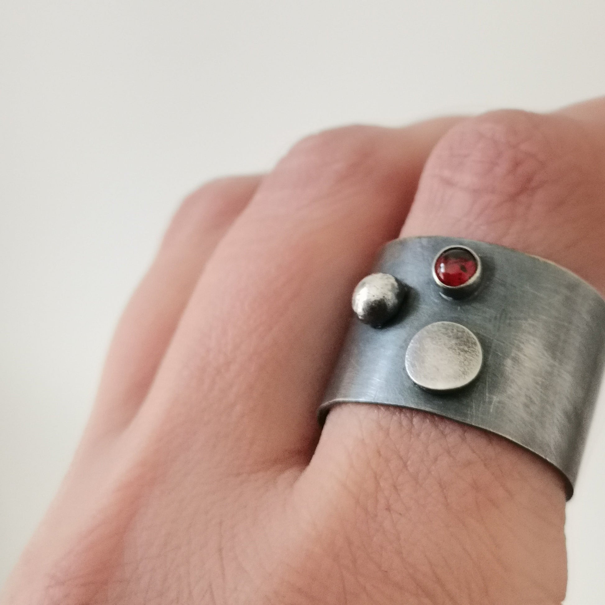 Točkice granat jednostavan je patiniran prsten s tri asimetrična detalja, od kojih je jedan kamen granat. Prsten je širok 16 mm, no može se prilagoditi za jedan broj (nije puni krug). Prstenje s nošenjem postaje svjetlije i sjajnije. Budući da je nakit ručno izrađen, nije identičan prikazanom na fotografiji, već vrlo sličan.