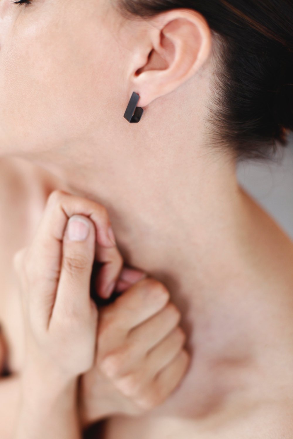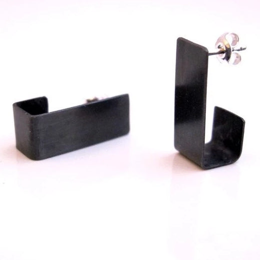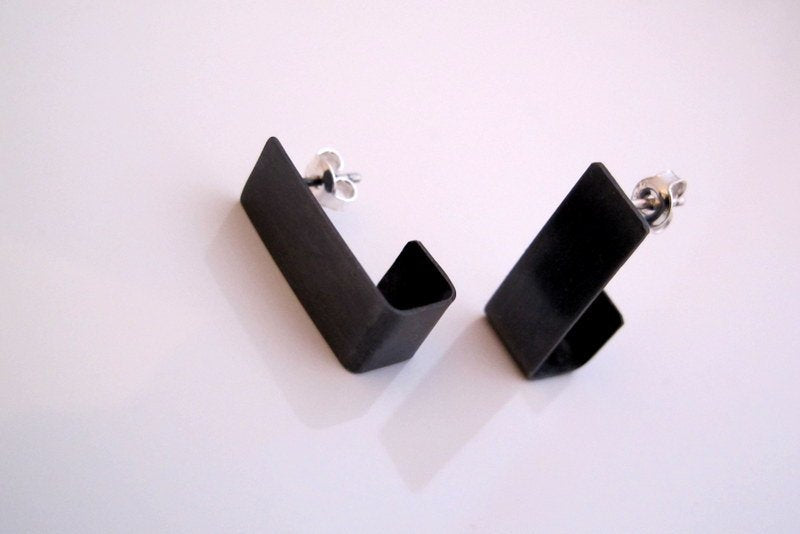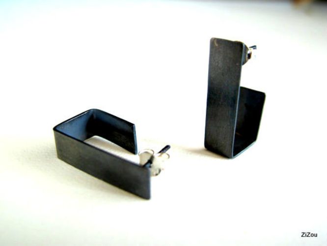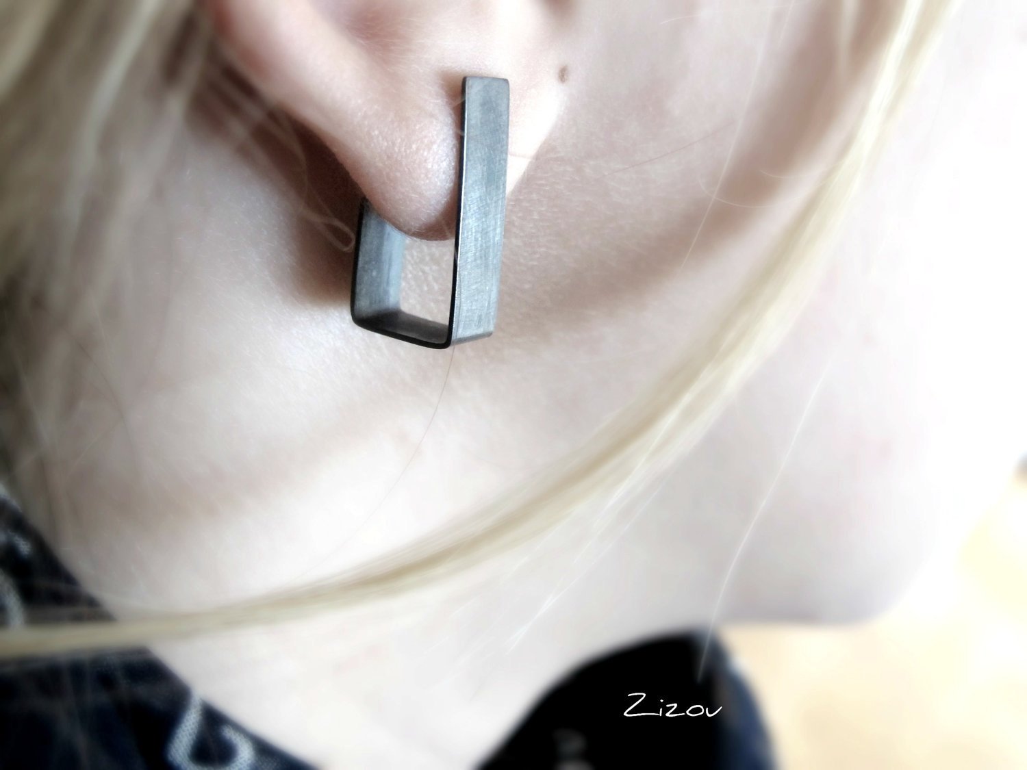 Vrlo elegantne L su neobične geometrijske naušnice duljine 19 mm, izrađene od recikliranog srebra, patinirane. Budući da su ručno izrađene, nisu identične prikazanom na fotografiji, već vrlo slične. S nošenjem će patina po rubovima postati svjetlija. One mogu biti i s rustikalnim/ brush finishom, kao na posljednjoj slici.