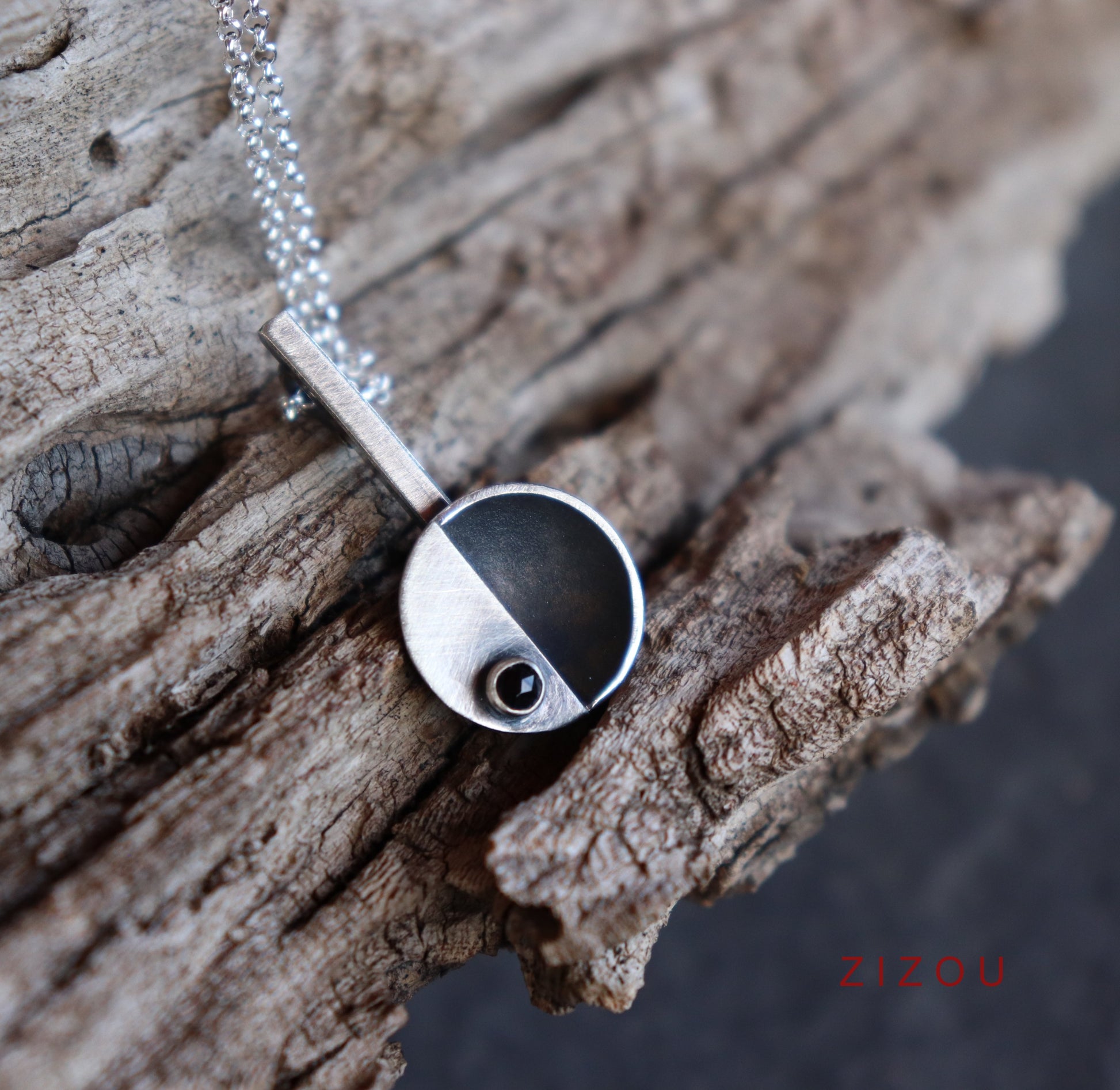 Mjesečeve mijene ogrlica je izrađena od recikliranog srebra. Duljina lančića iznosi oko 45 cm. Privjesak je duljine 25 mm, a na najširem dijelu iznosi 16 mm. Nakit s nošenjem postaje svjetliji i sjajniji. Budući da je nakit ručno izrađen, nije identičan prikazanom na fotografiji, već vrlo sličan. Kamen može biti crni spinel, crveni granat ili zeleni onix.