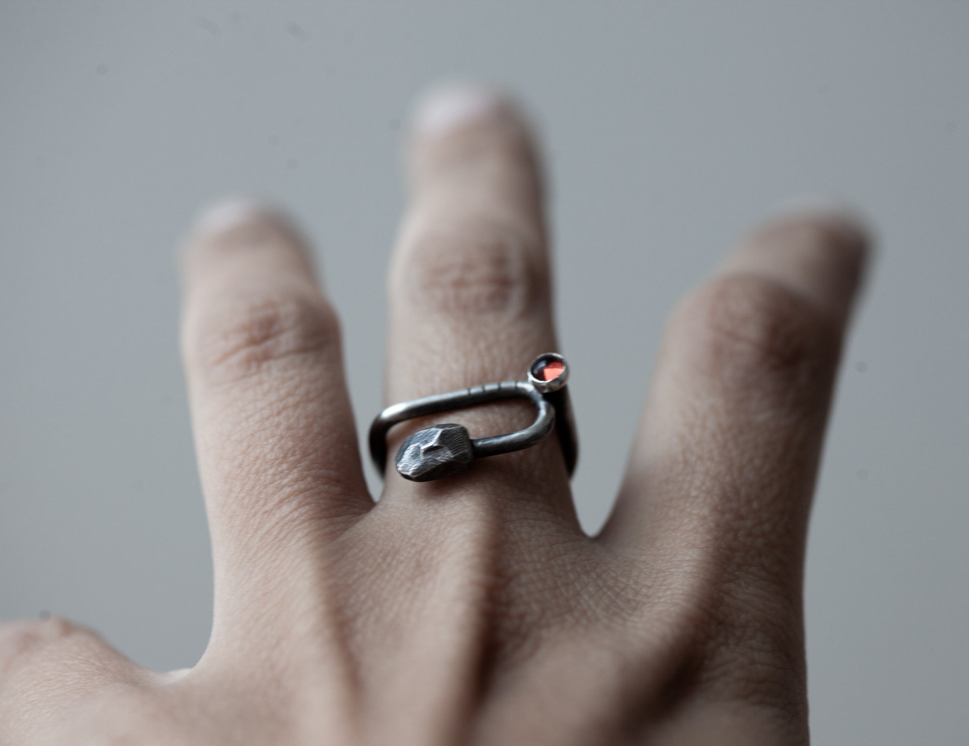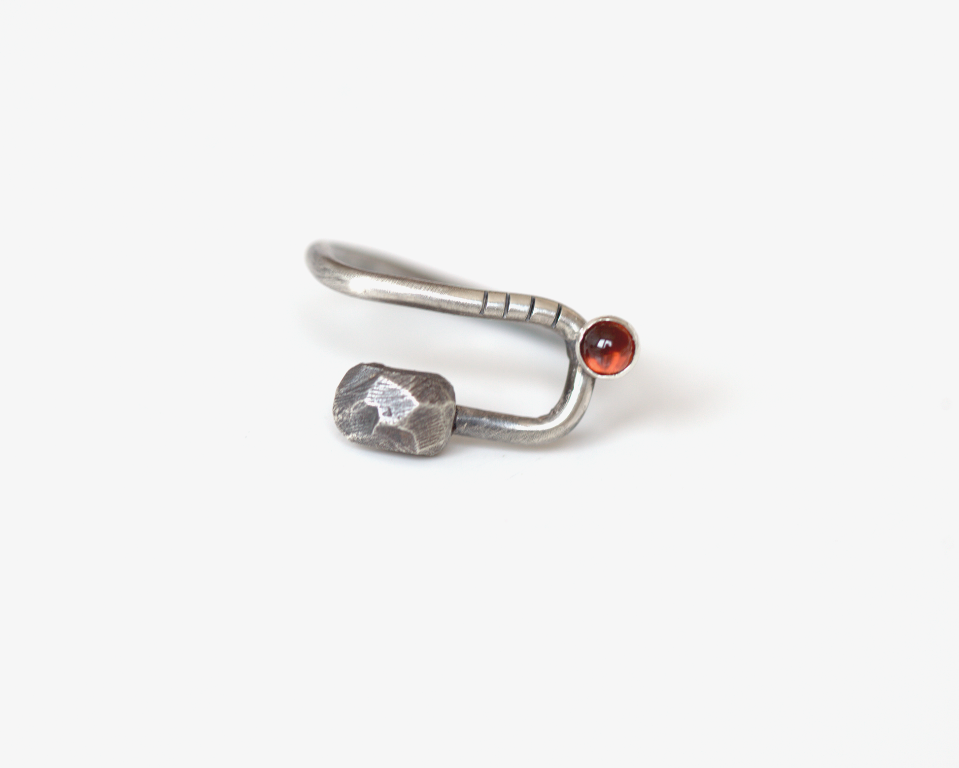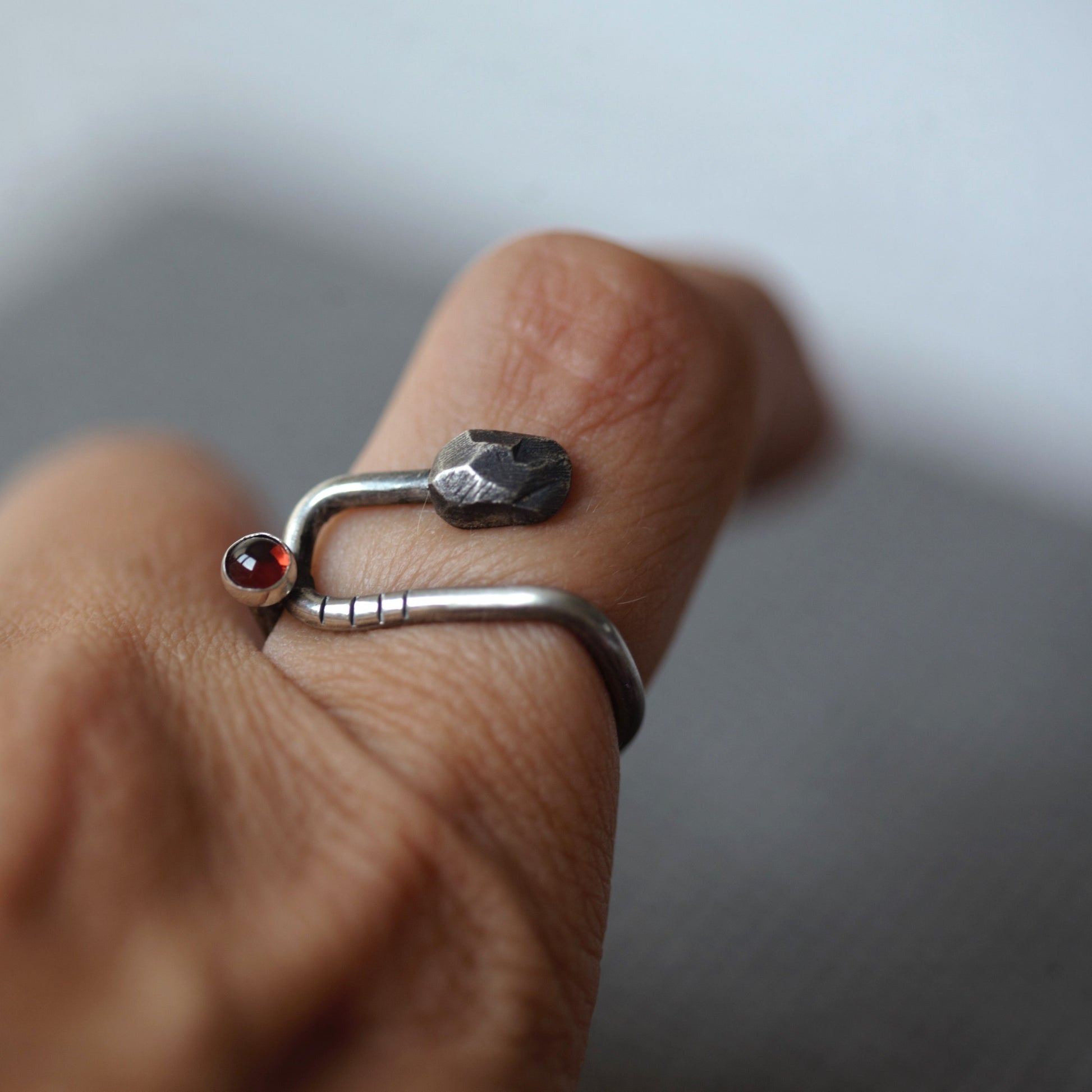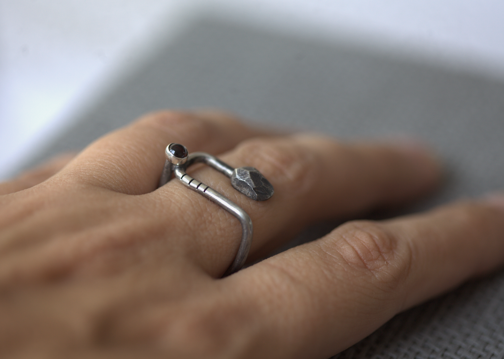 Četvrtasti prsten Stripes & Stones U granat izrađen je od recikliranog srebra, te dodatno patiniran. Krasi ga tamno crveni kamen granat. Prstenje s nošenjem postaje svjetlije i sjajnije. Budući da je nakit ručno izrađen, nije identičan prikazanom na fotografiji, već vrlo sličan.