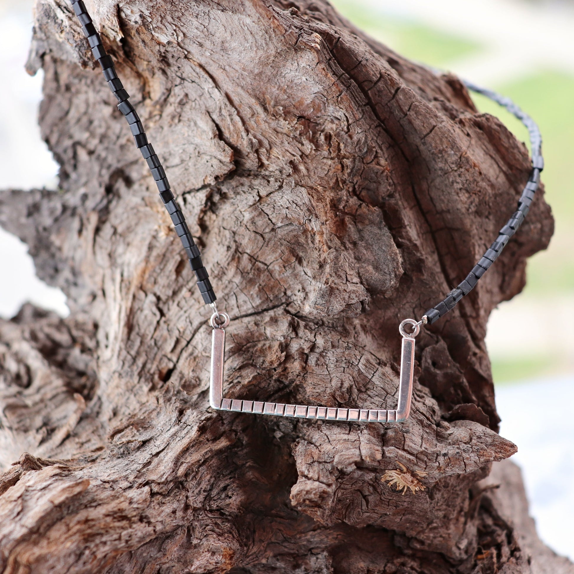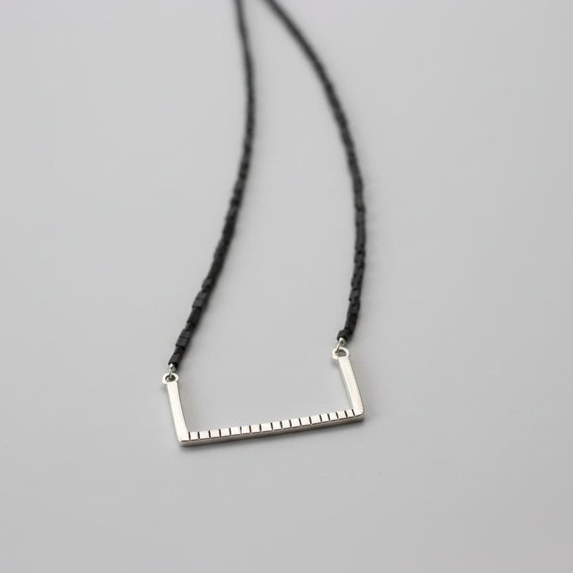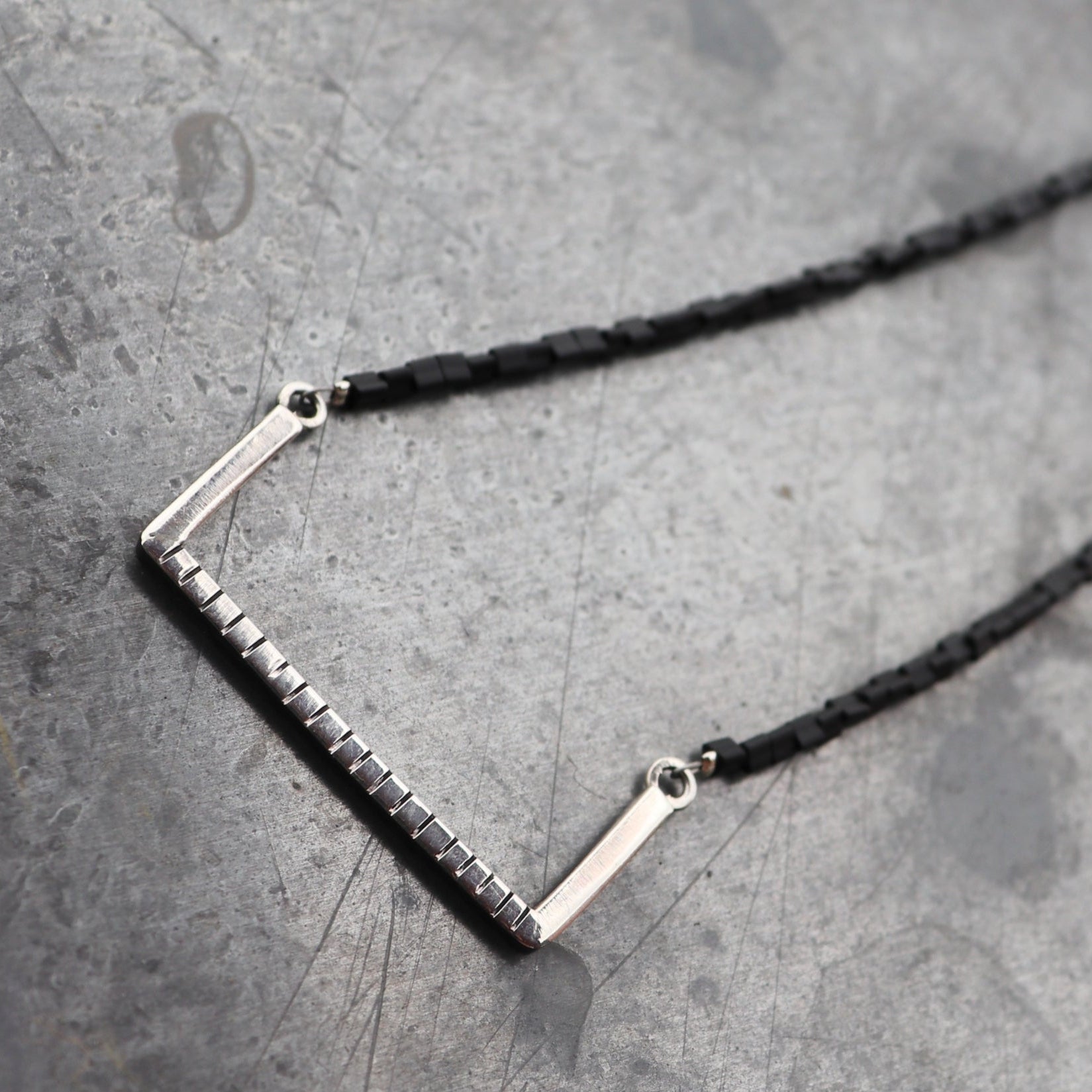 Jednostavna i moderna Between the lines ogrlica izrađena je od recikliranog srebra, sa karakterističnim crticama ali ovaj put visokog sjaja. I sa staklenim trokutastim perlama, mat.