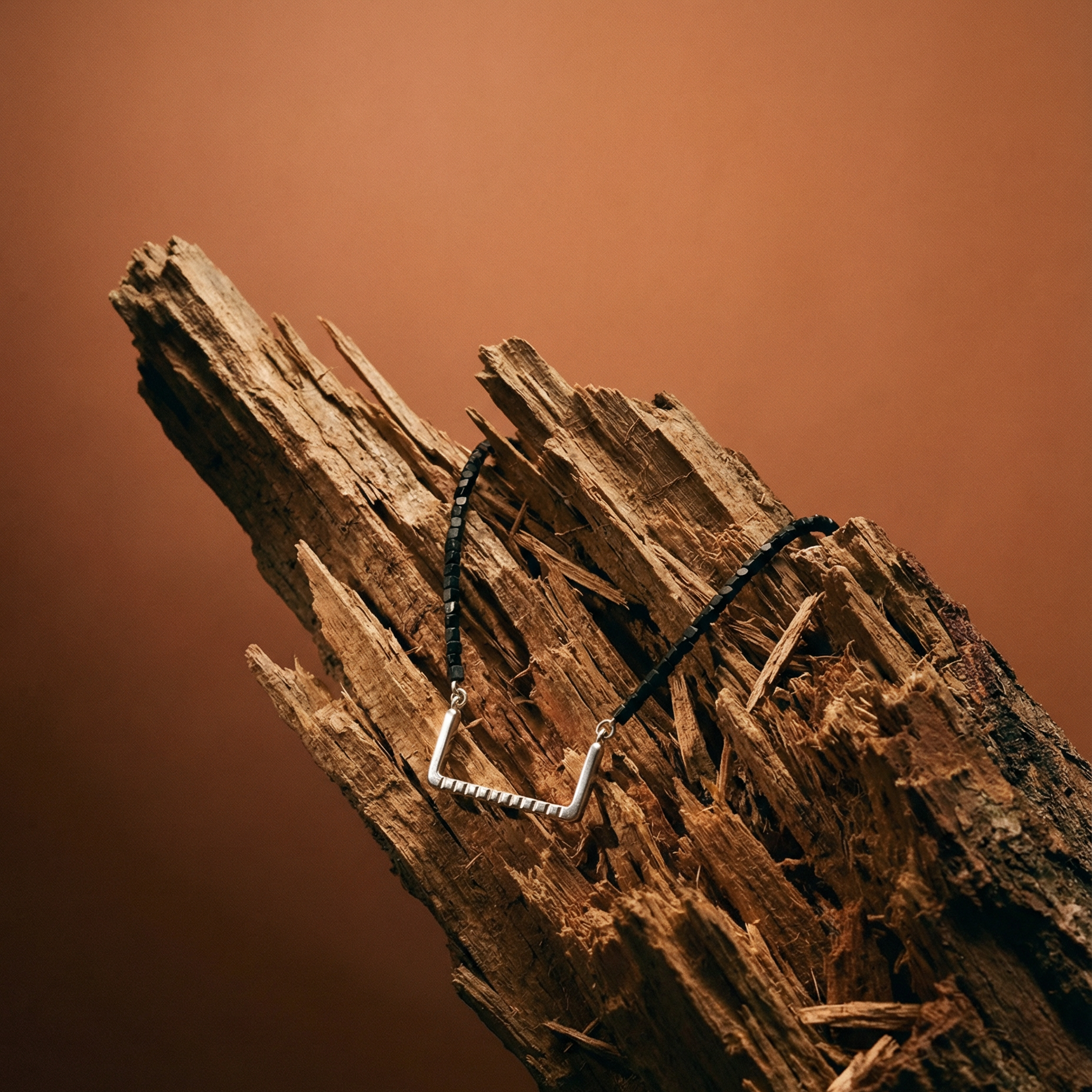 Minimalistička kolekcija srebrnih ogrlica i naušnica inspirirana odnosom između bliskosti i distance. Suptilne pruge i čiste linije stvaraju osjećaj ravnoteže, dok refleksija srebra nježno prati pokret tijela.