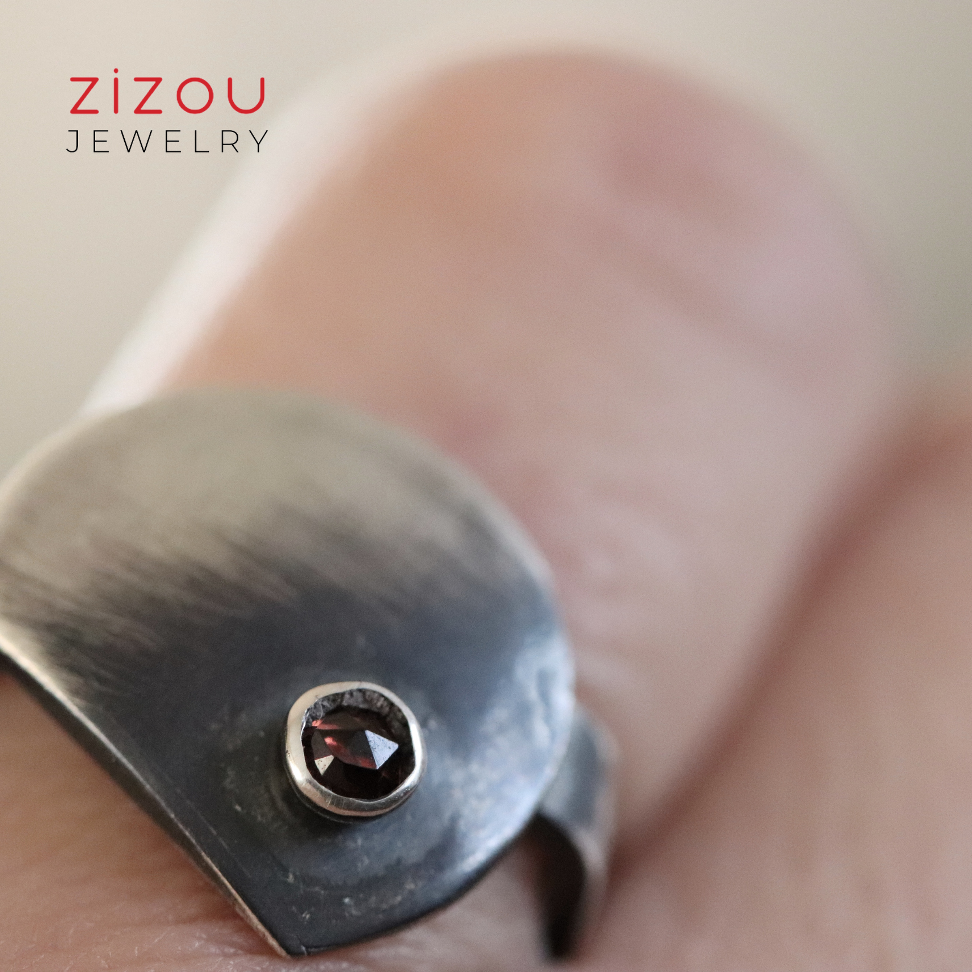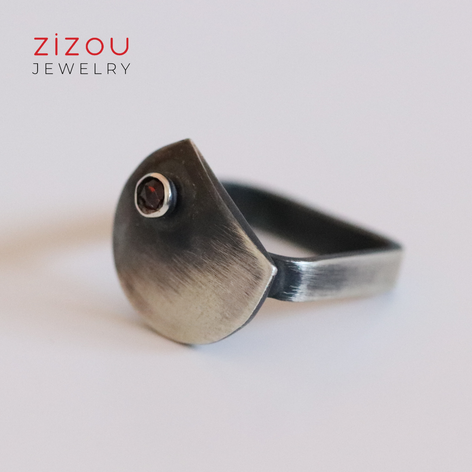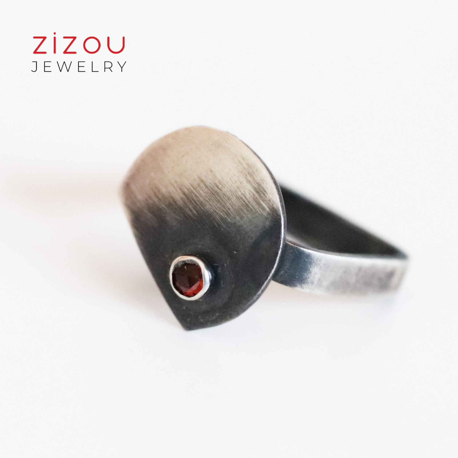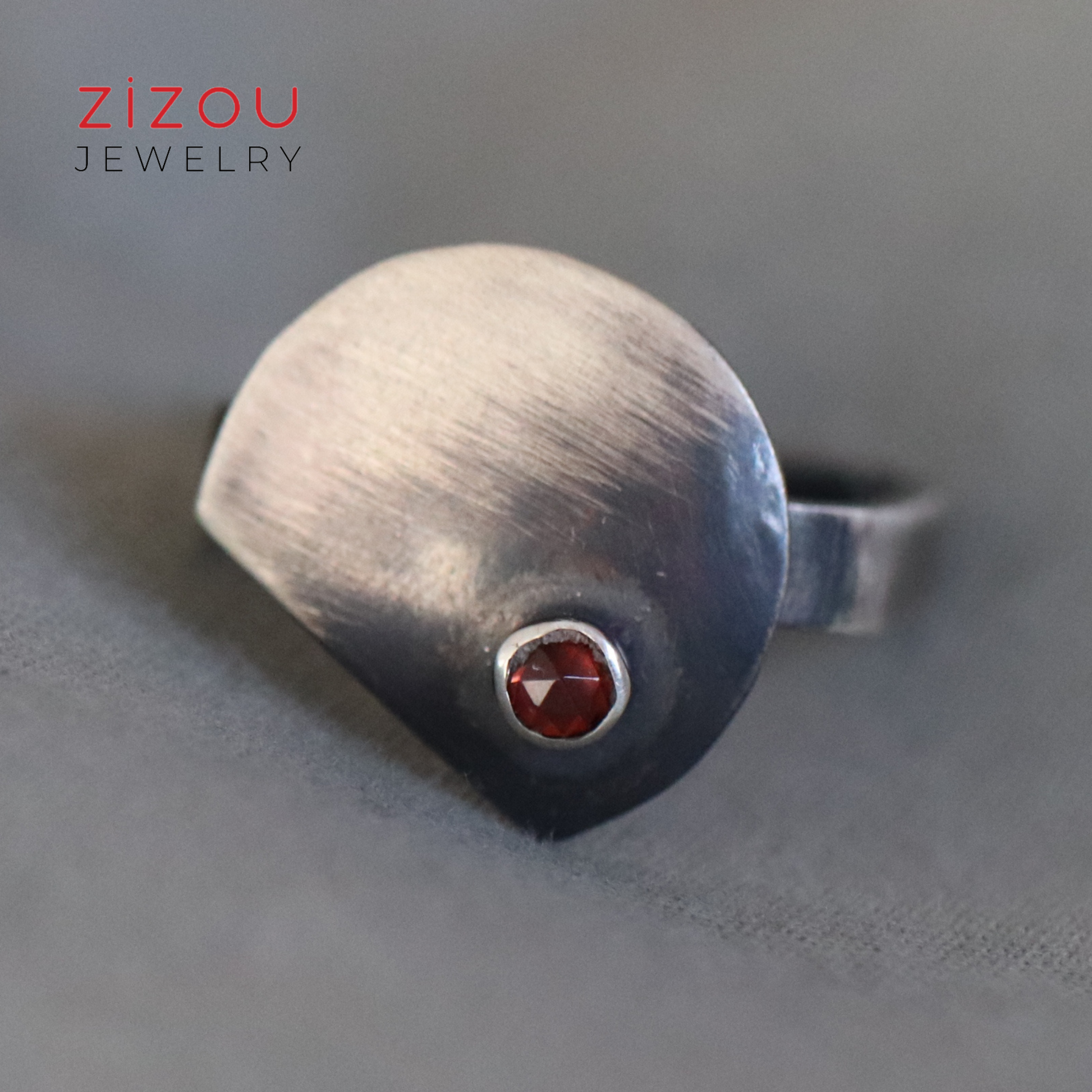The Moon granat square prsten izrađen je od recikliranog srebra, te dodatno patiniran. Krasi ga predivni poludragi kamen crveni granat, kojeg smatraju vatrom vječnih promjena.. Duljina prstena na najširem dijelu iznosi 22 mm, a straga 5 mm. Prstenje s nošenjem postaje svjetlije i sjajnije. Budući da je nakit ručno izrađen, nije identičan prikazanom na fotografiji, već vrlo sličan.