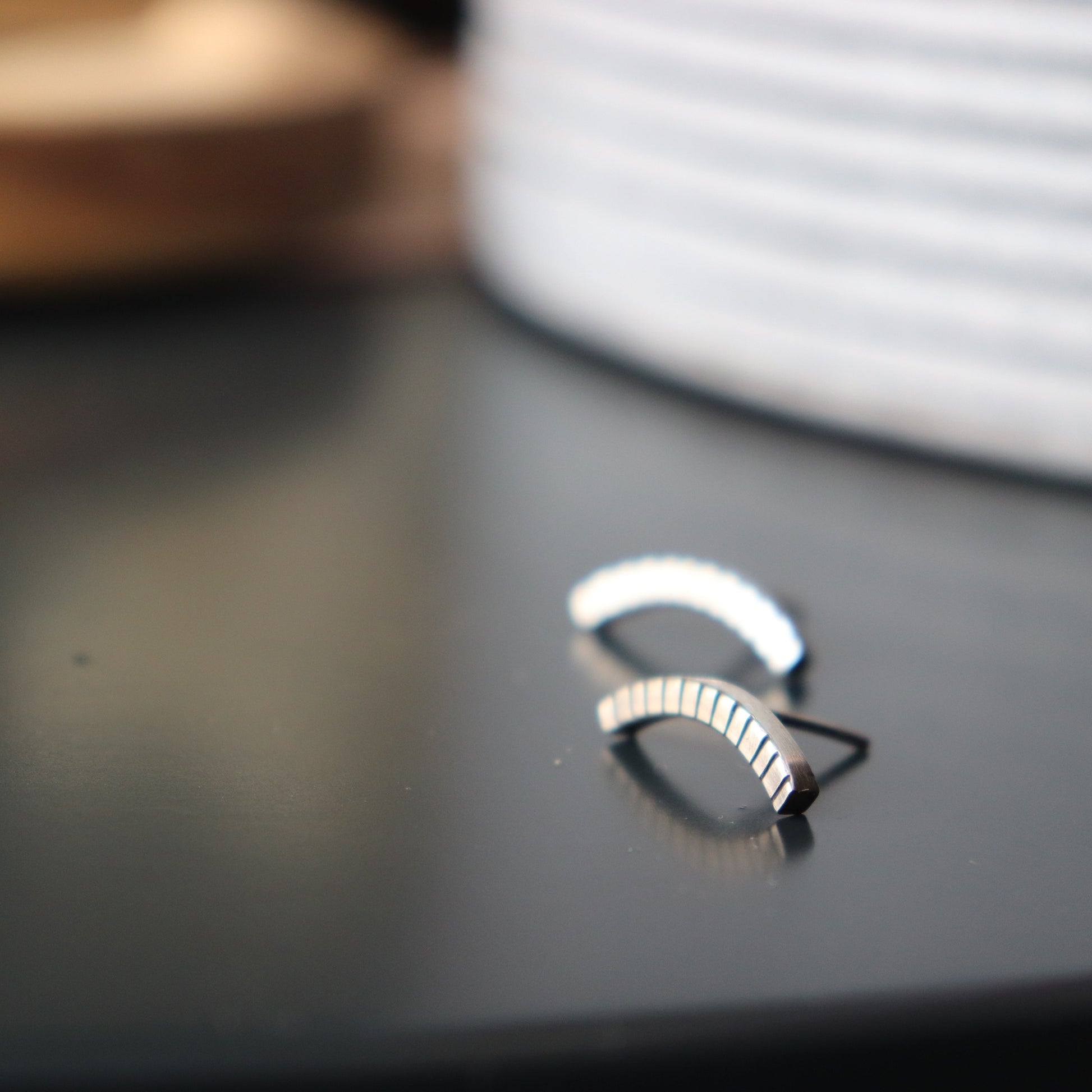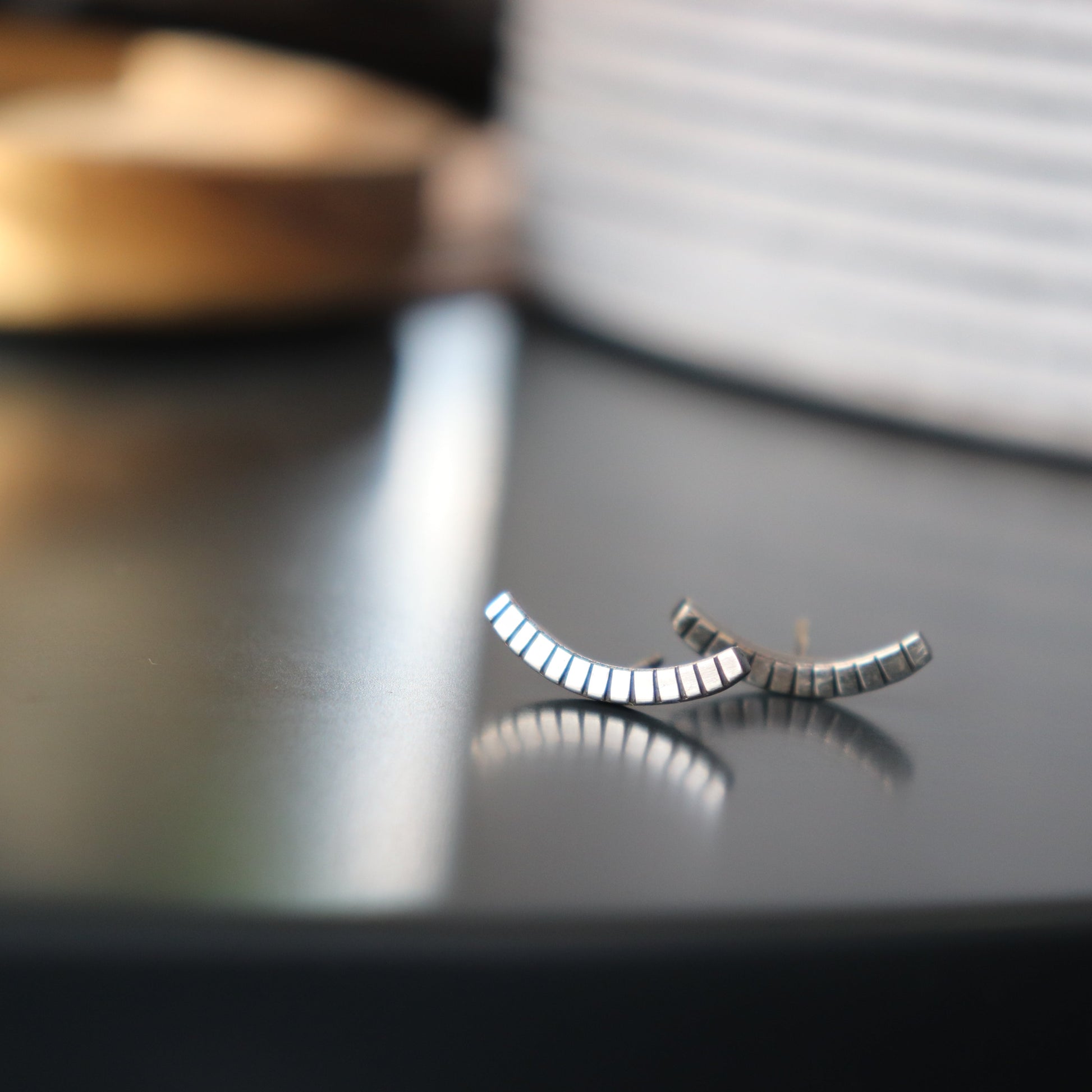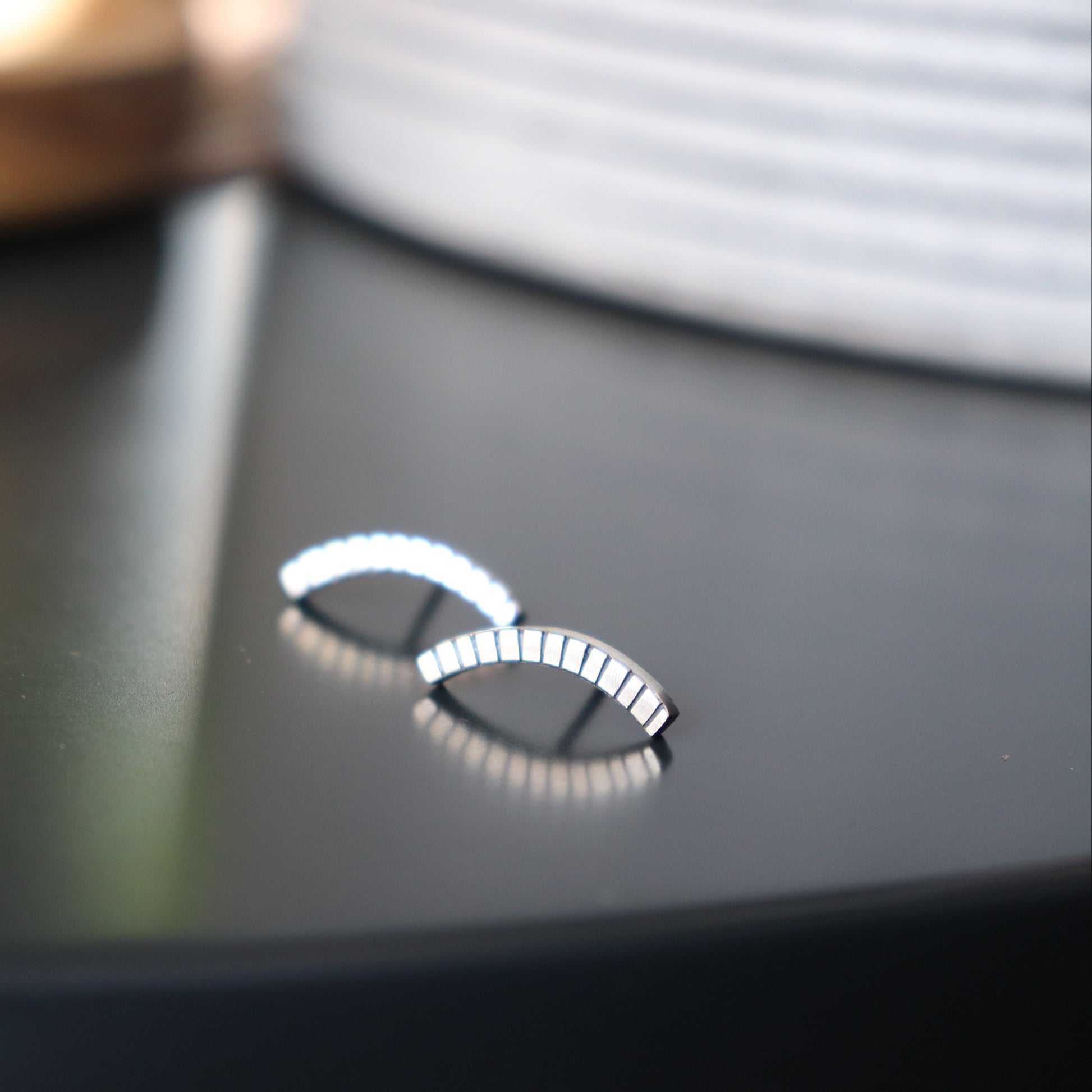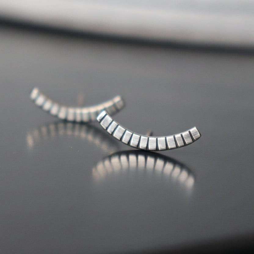 Jednostavne moderne minimalne naušnice "Nothing, Really " izrađena je od recikliranog srebra, sa karakterističnim crticama ali ovaj put visokog sjaja.